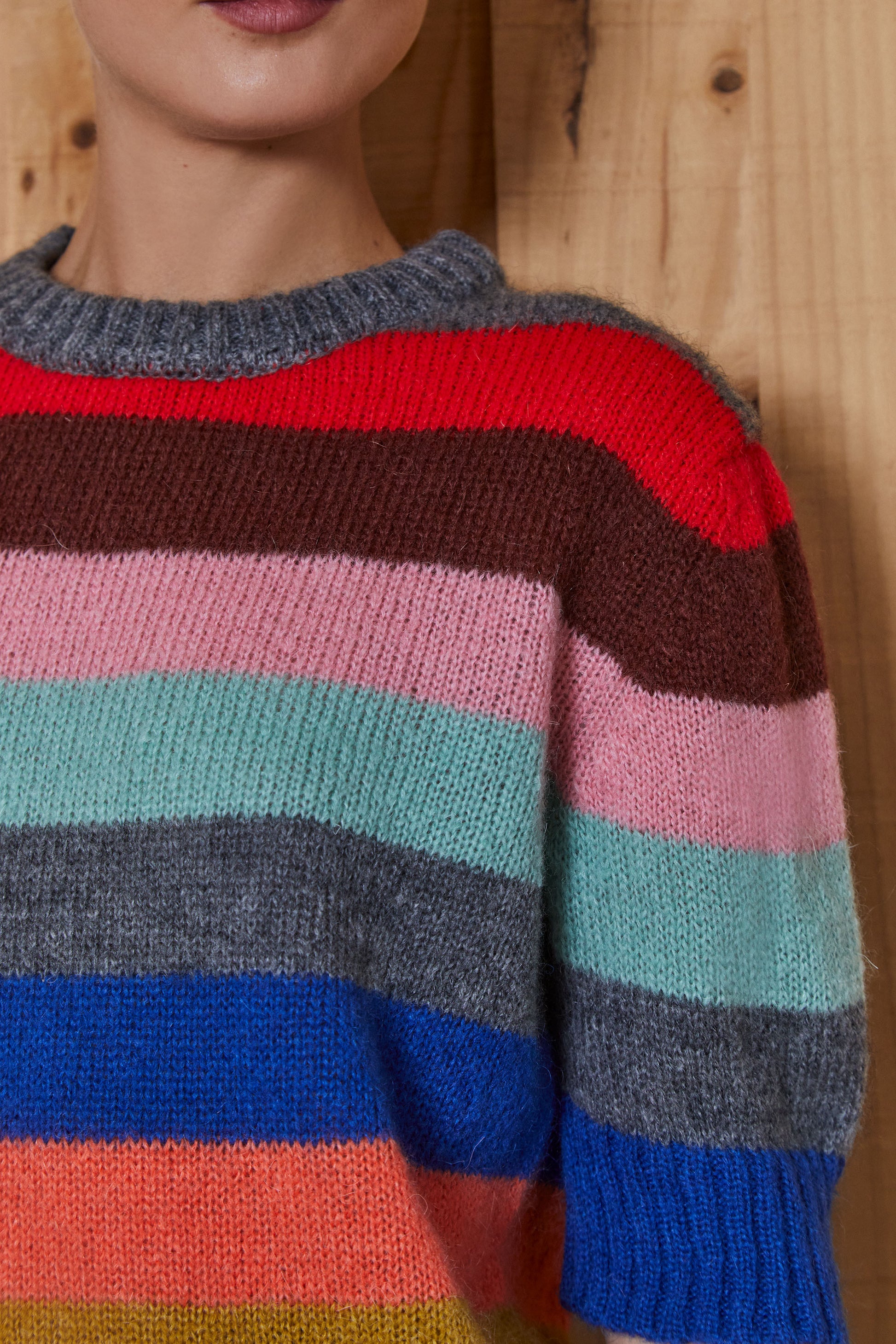 El modelo MIKA se trata de un jersey de punto con mohair, de cuello redondo y manga corta, con rayas multicolor.