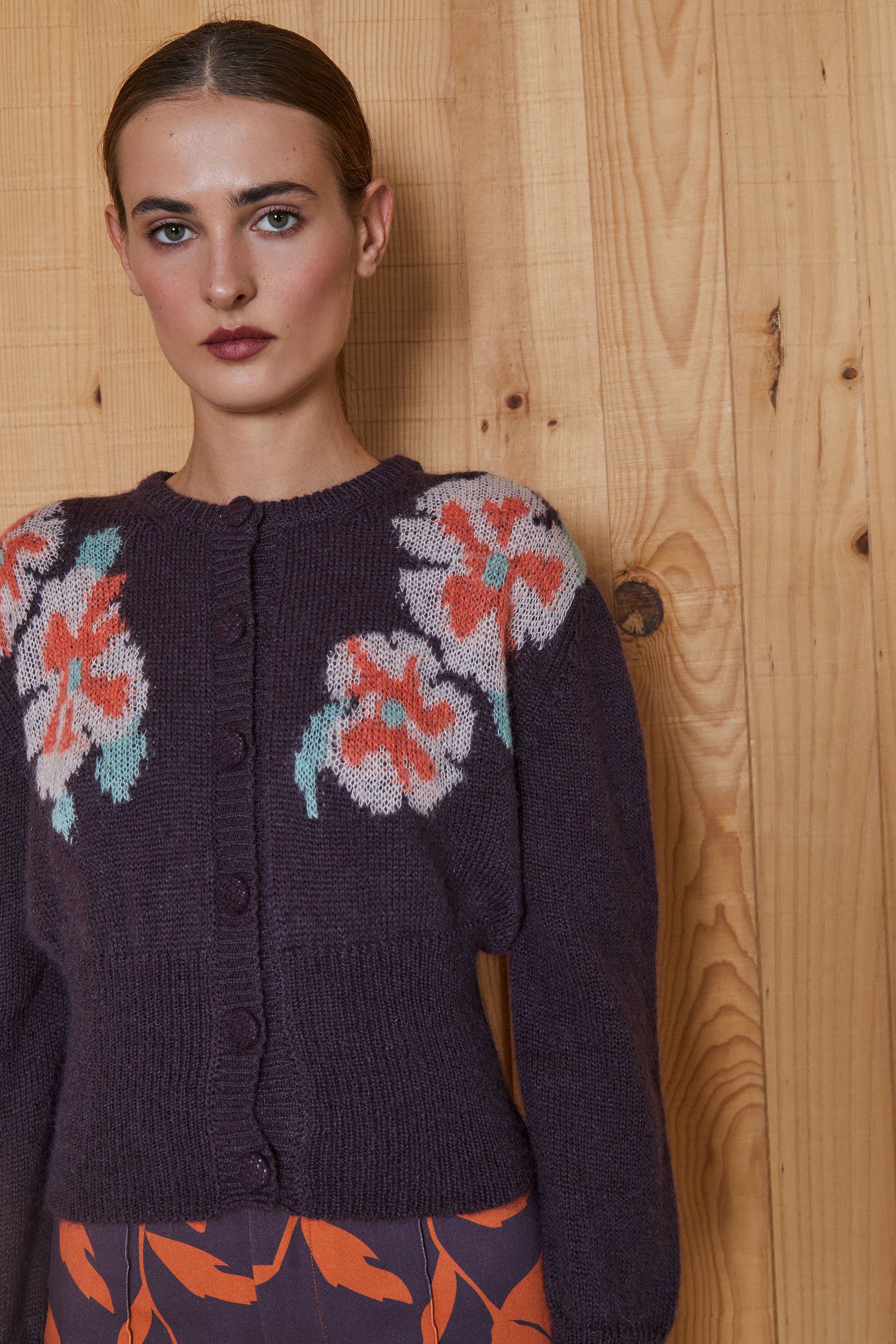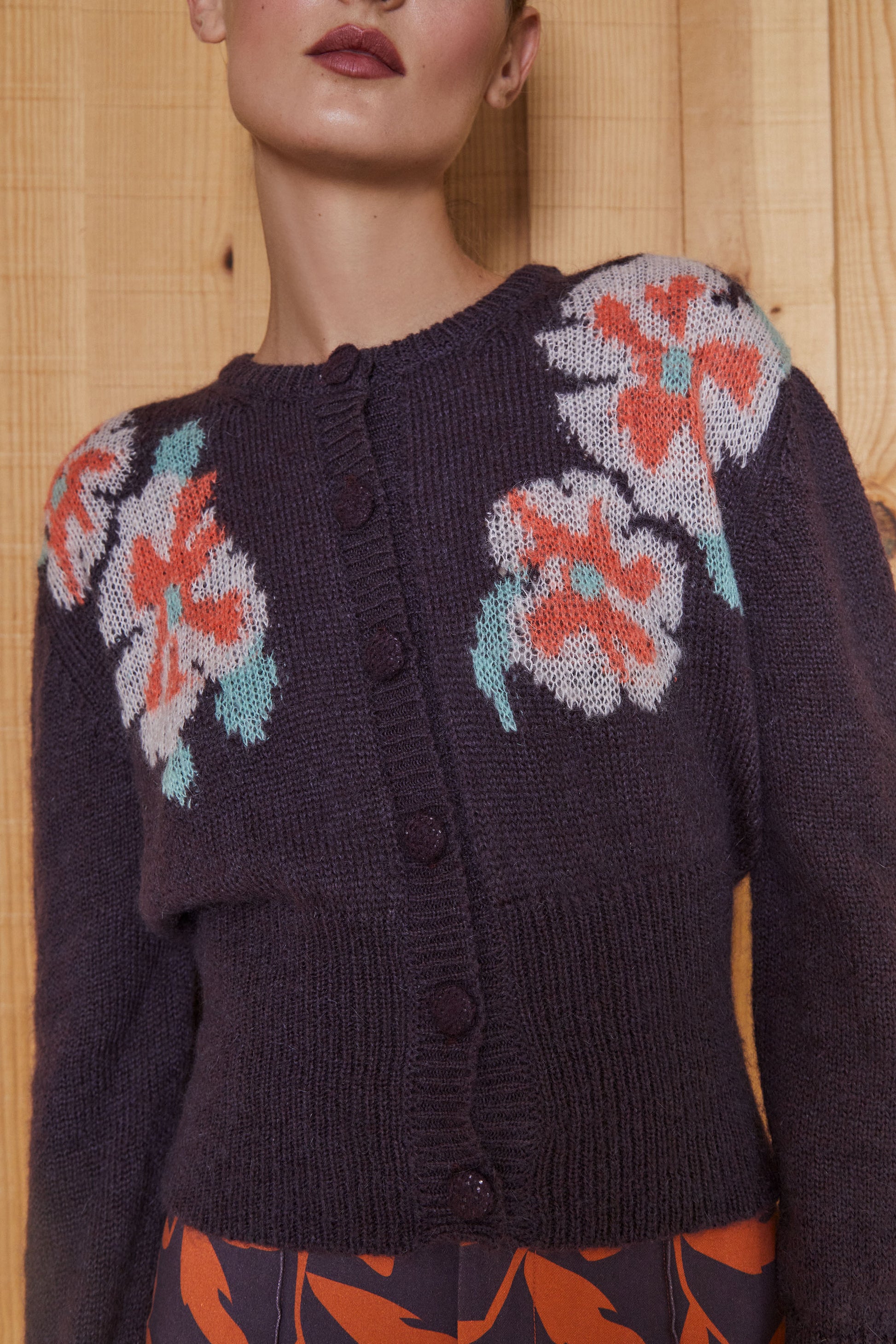 El elemento más destacado de este modelo es el motivo de flores en intarsia, en colores contrastados.