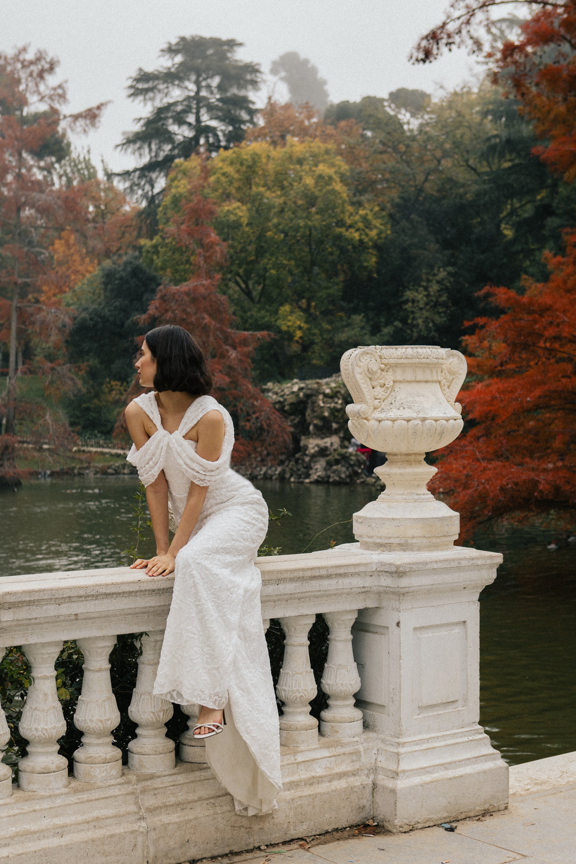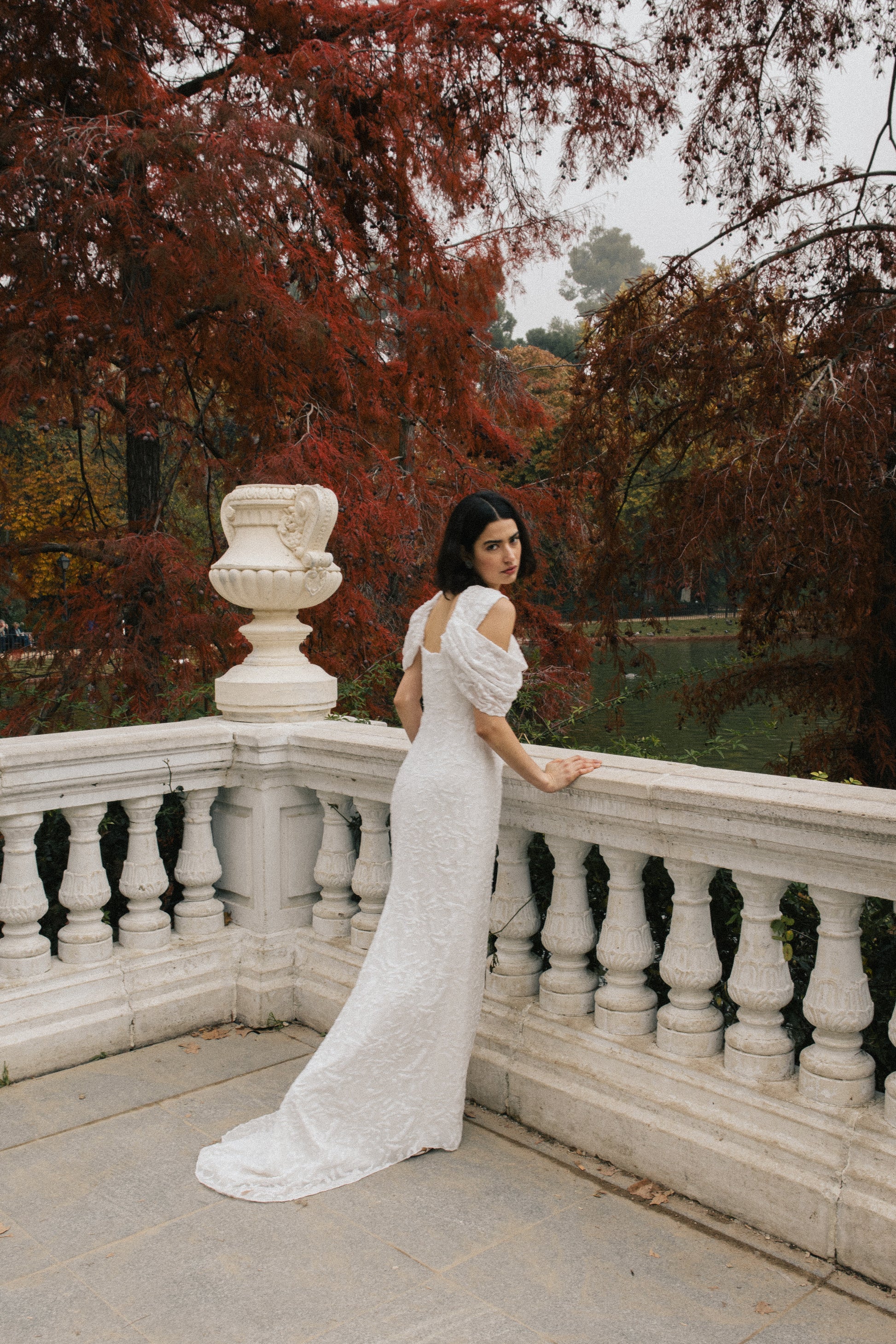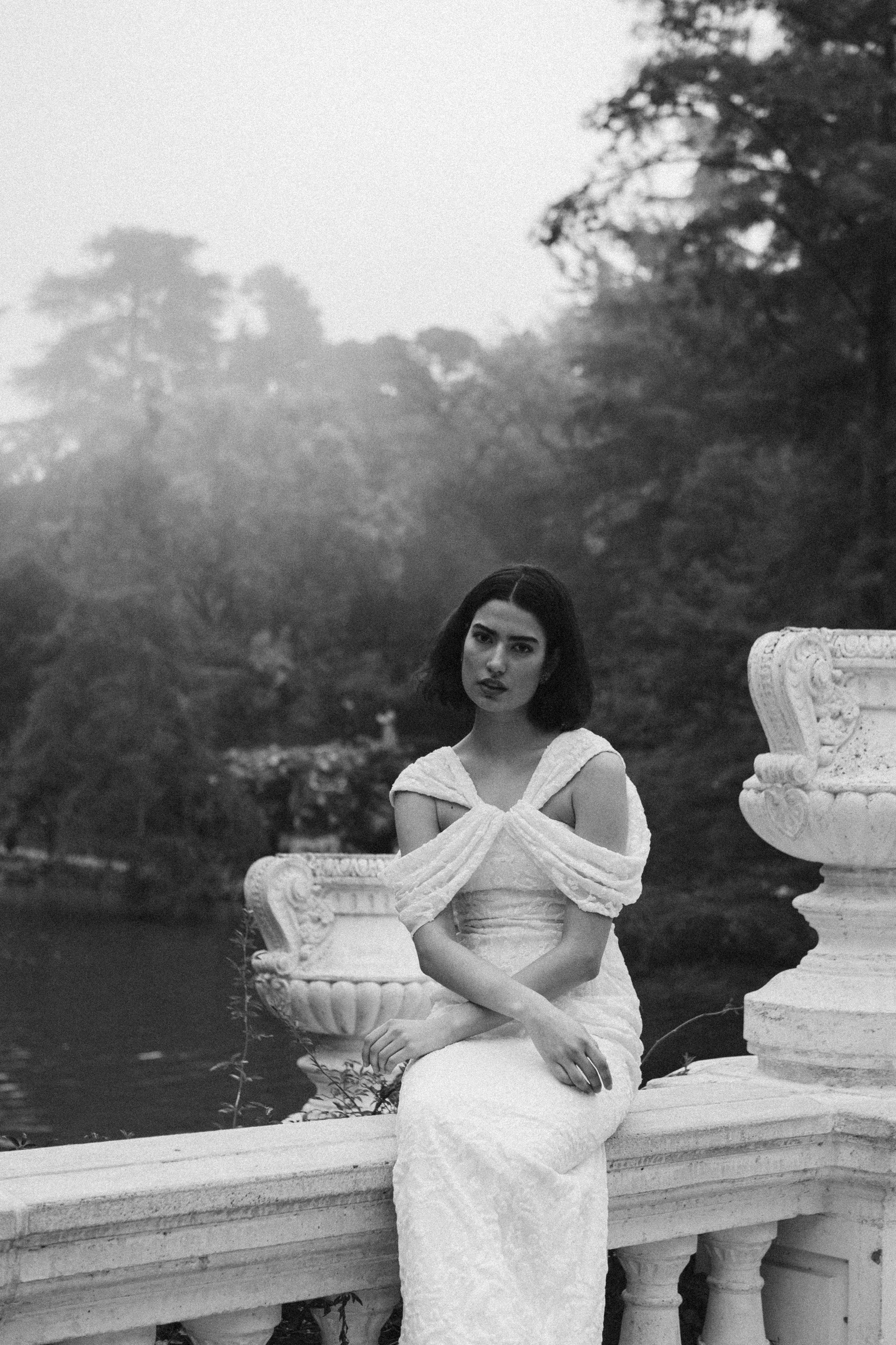 The BIANCA model is a long dress made of viscose chiffon embroidered with matching sequins. You can see a slight tail in the design. It has multi-position draped straps that make this dress a versatile garment.