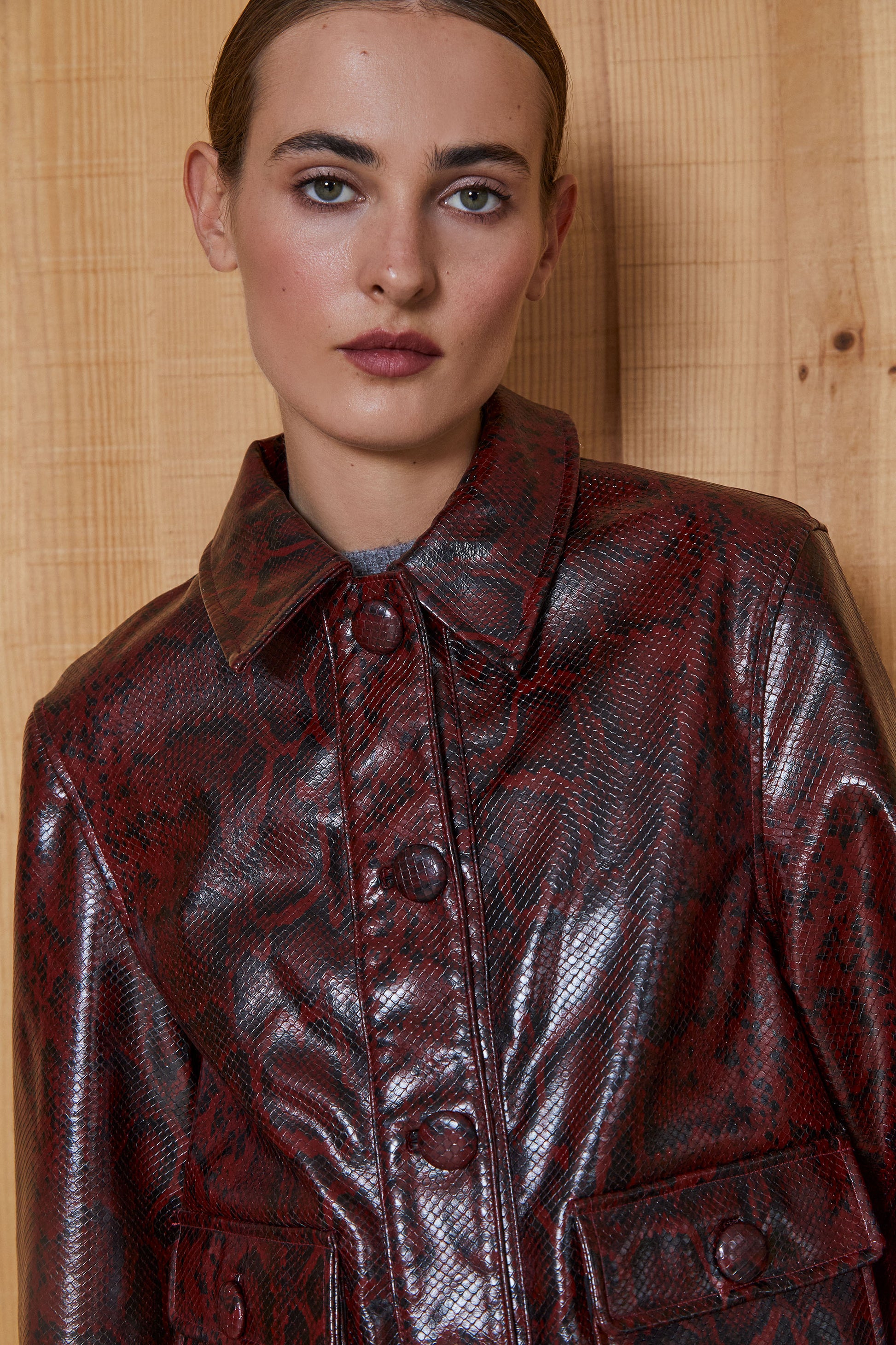 El modelo IRINA se trata de una chaqueta corta en PU, efecto piel de serpiente en color granate.