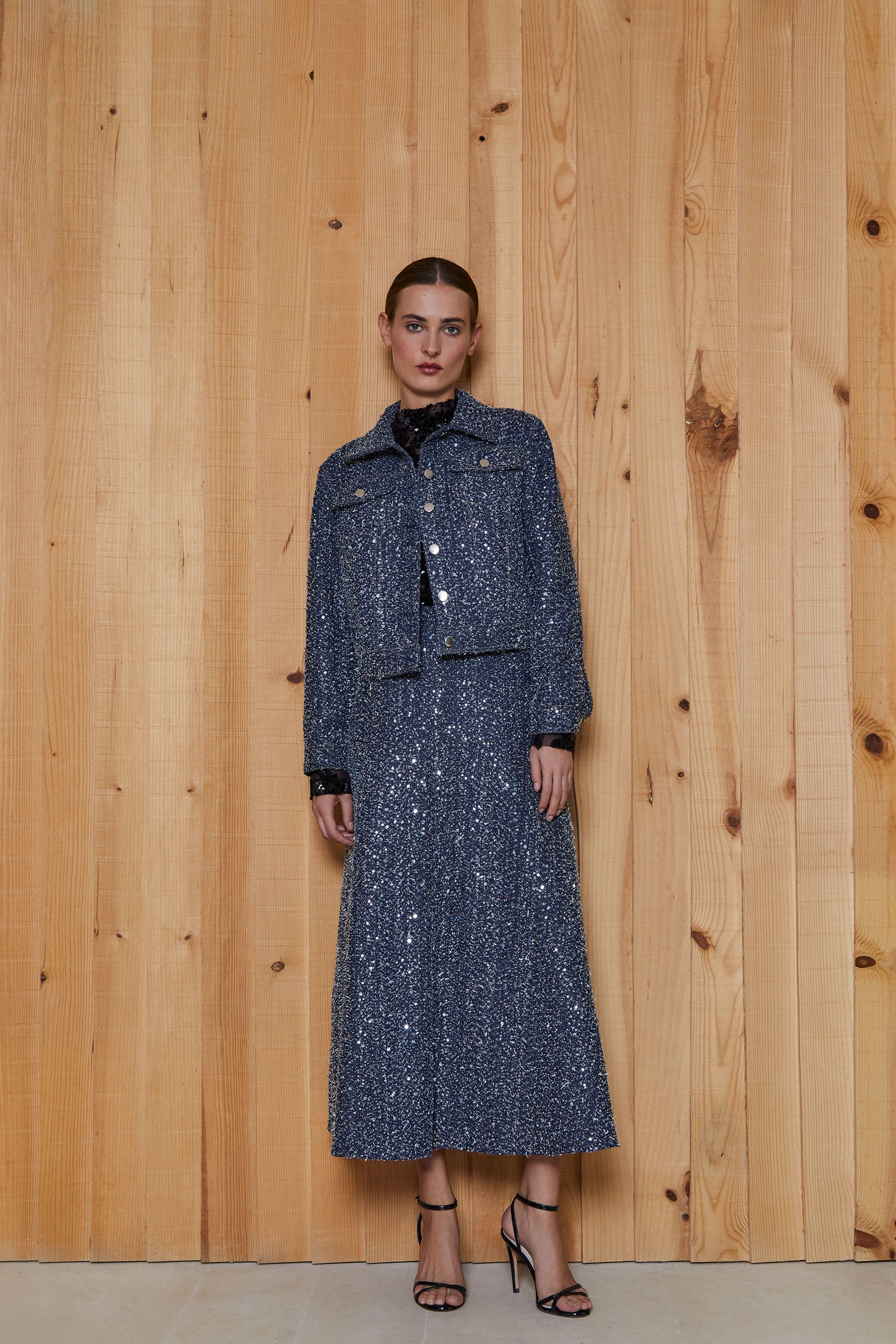 El elemento más destacado de esta chaqueta es el tejido, vaquero con efecto desflecado y cuajado de lentejuelas plateadas.