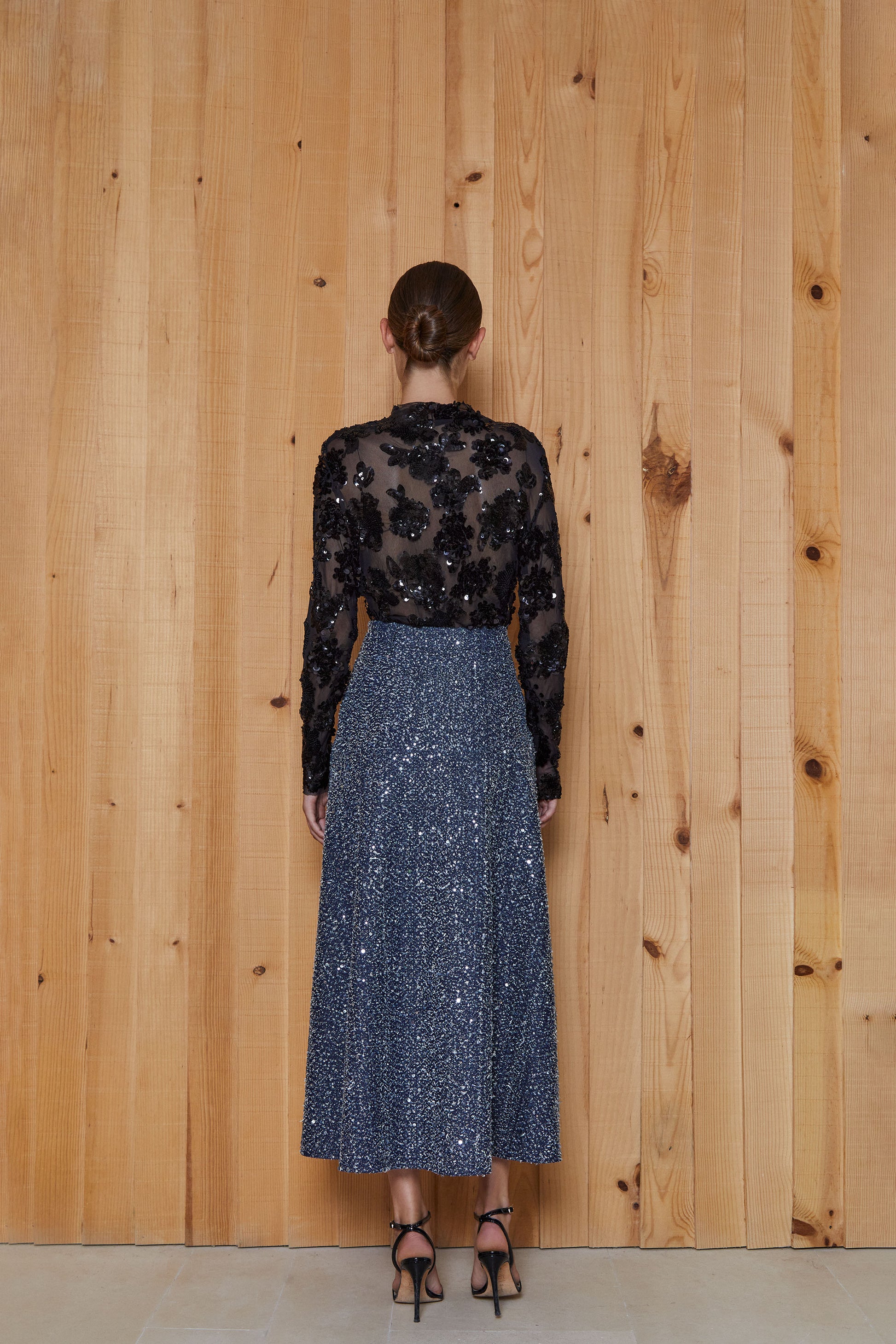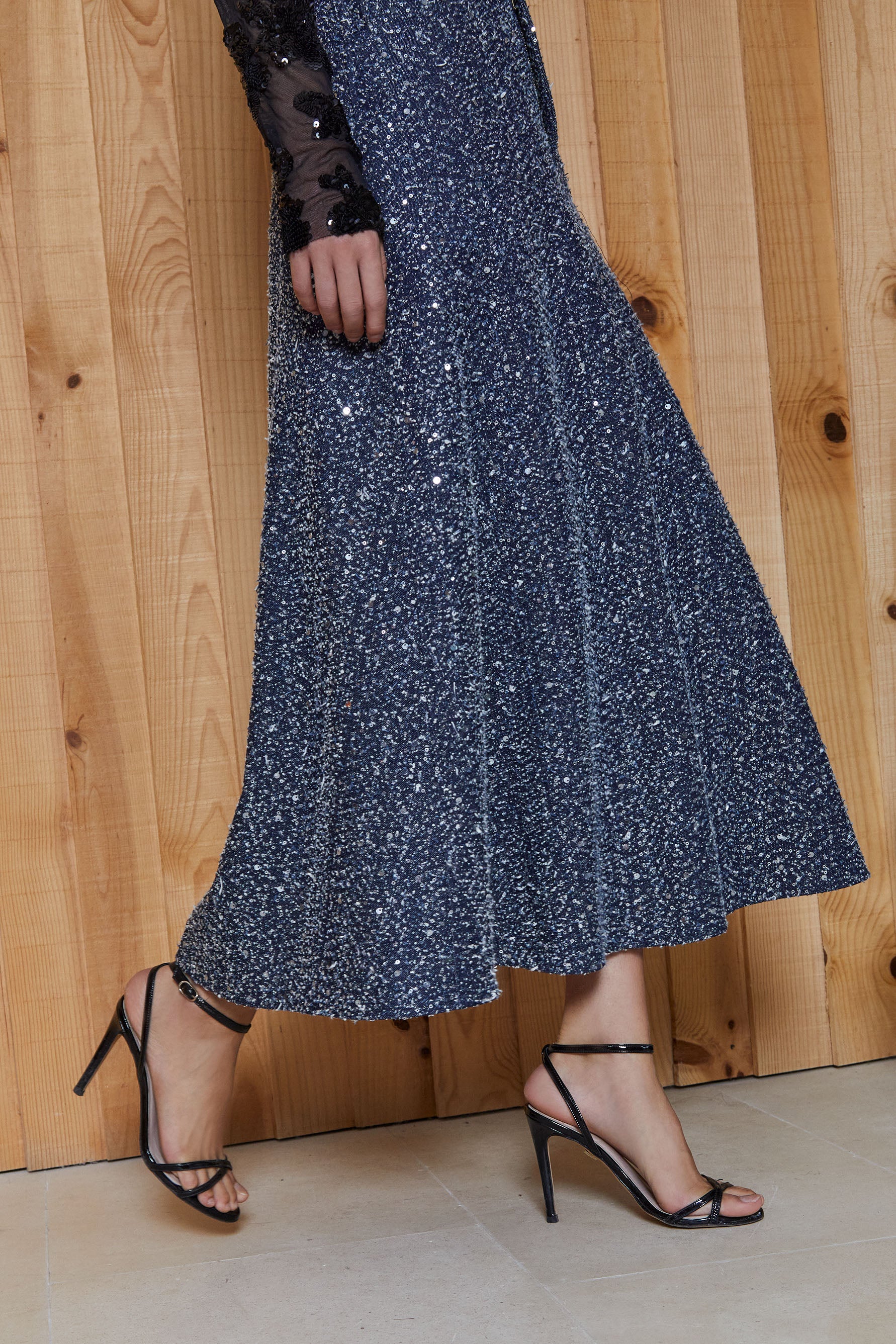 El elemento más destacado de esta falda es el tejido, vaquero con efecto desflecado y cuajado de lentejuelas plateadas.