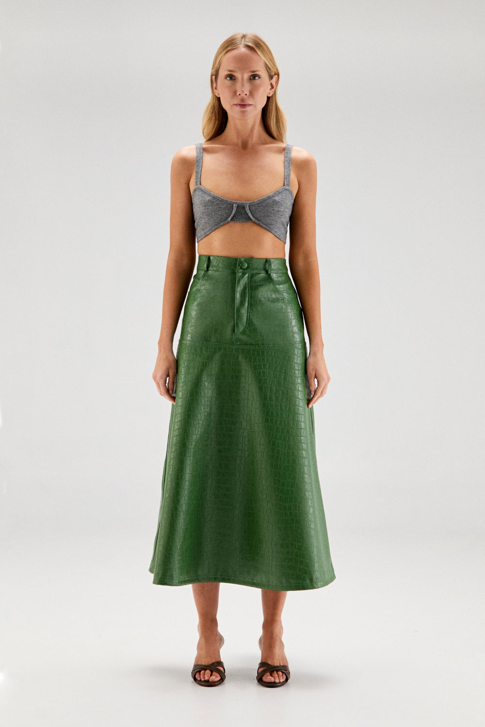 El modelo ANNE es una falda largo midi, con canesú a la cadera del que sale la falda de vuelo.