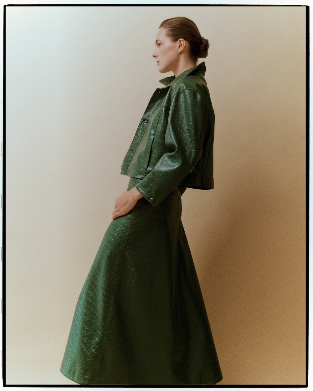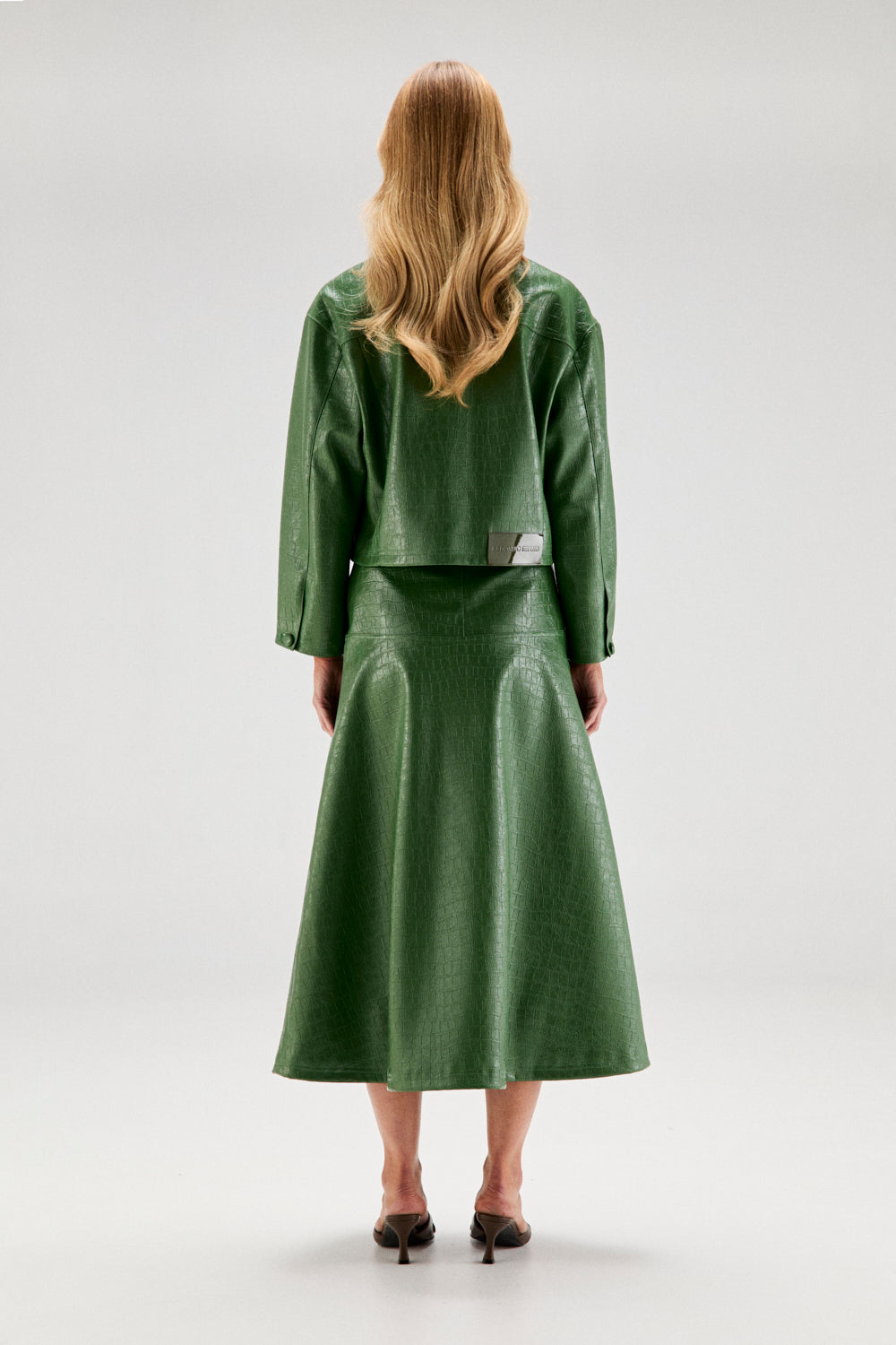 Realizada en polipiel verde, textura pitón.