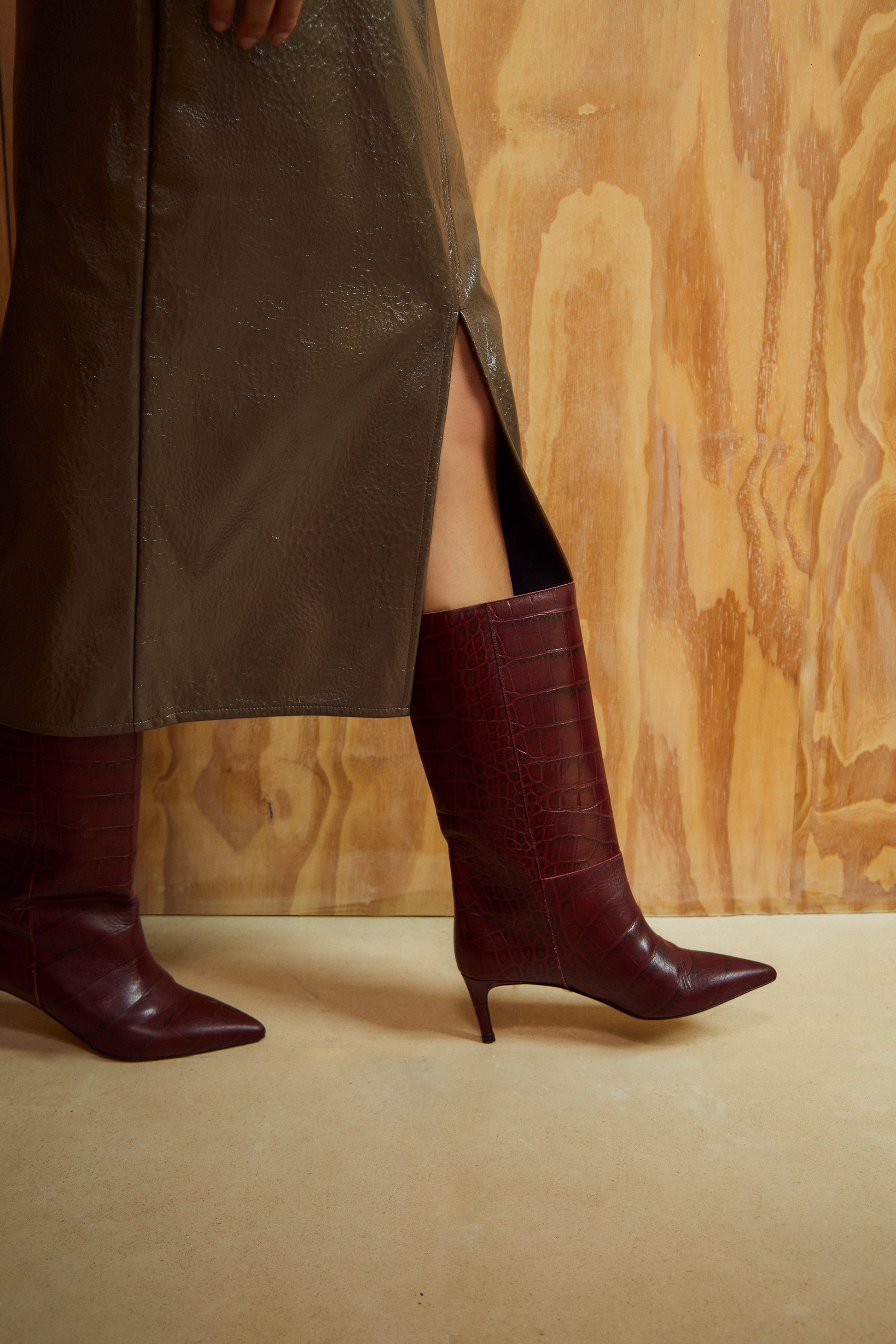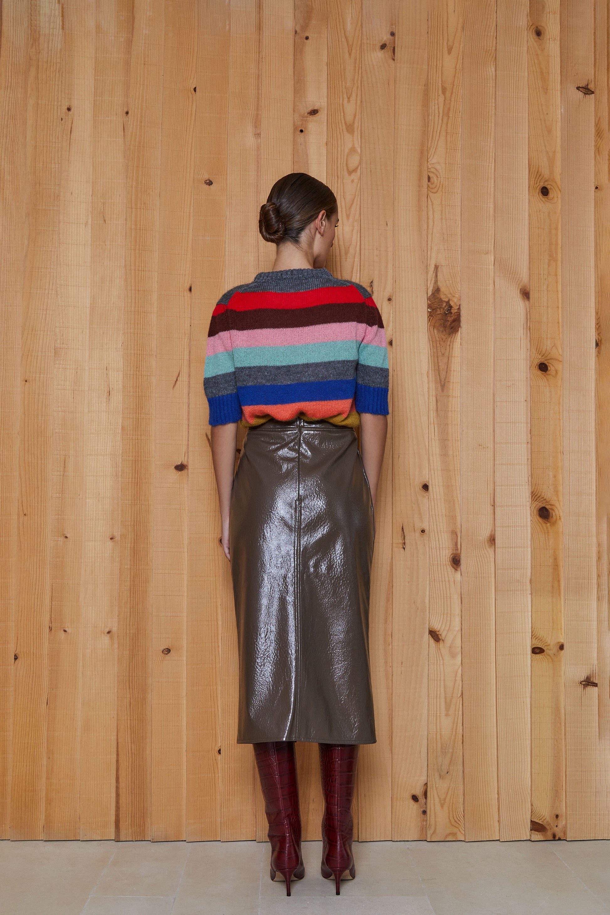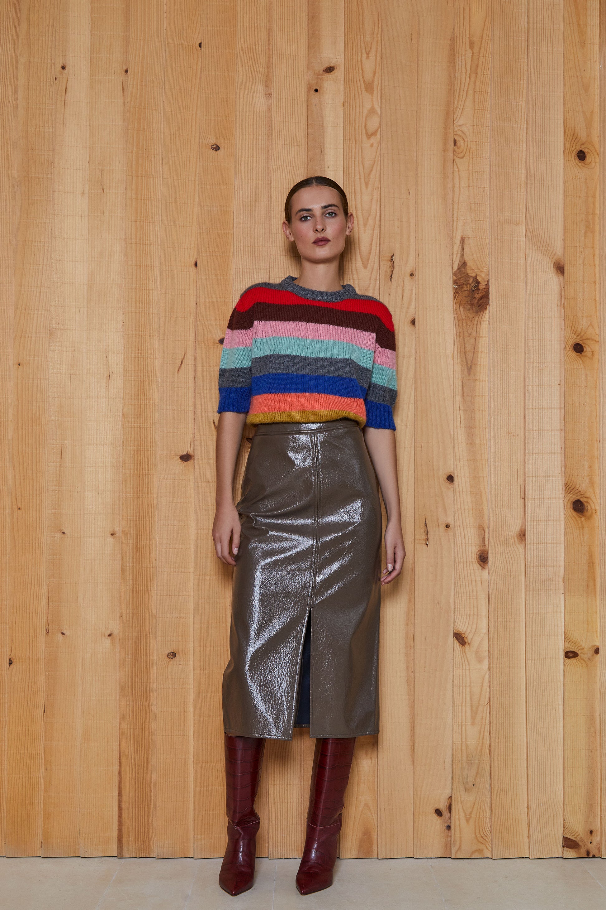 El modelo FAUSTA se trata de una falda lápiz, ajustada y de largo midi, con abertura delantera.