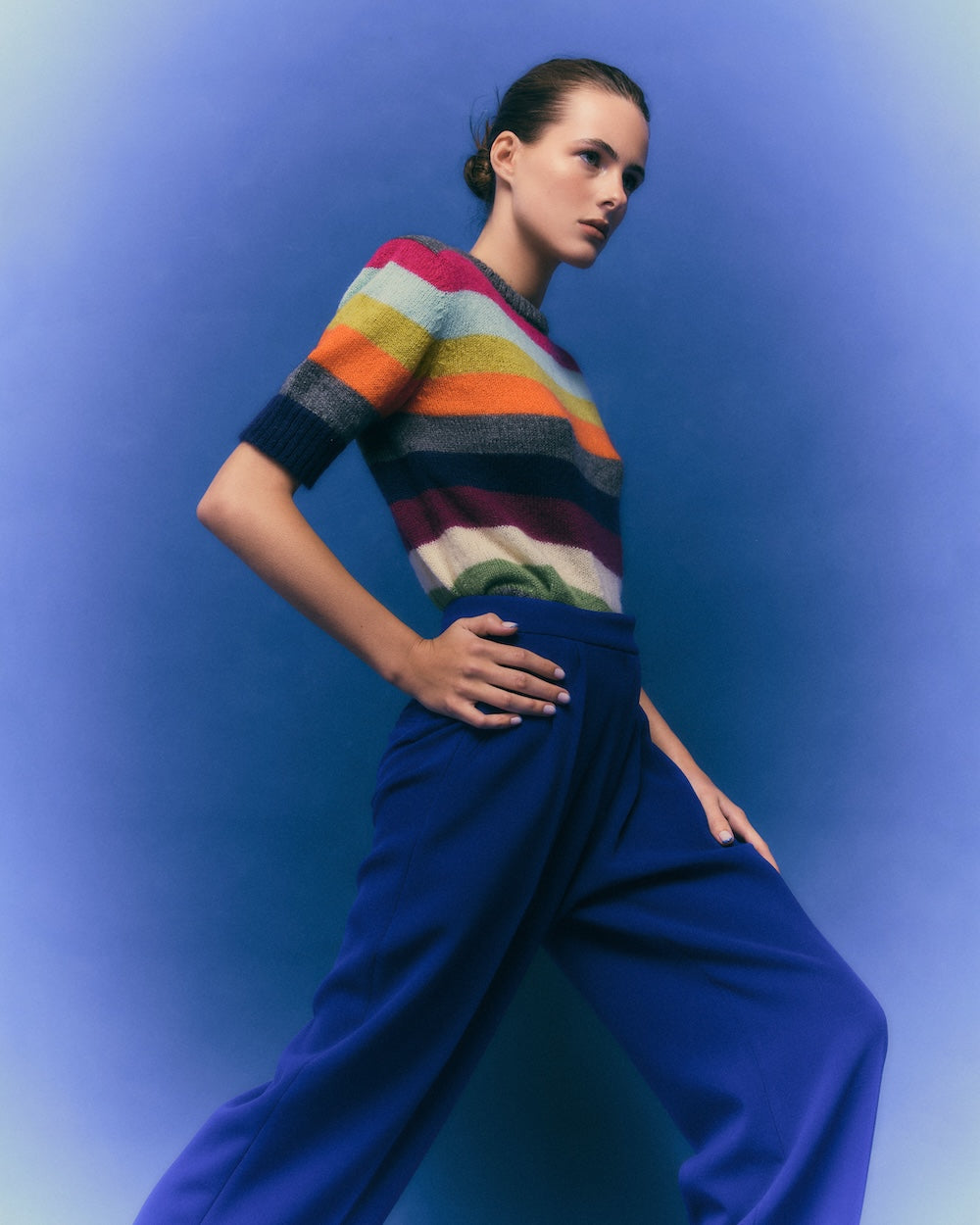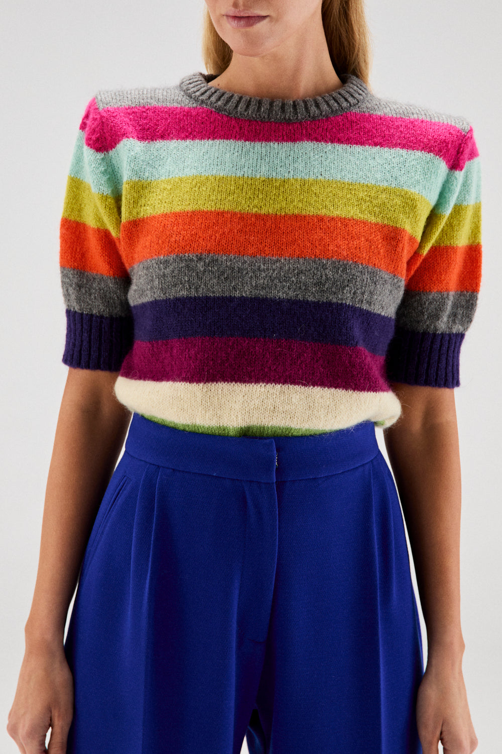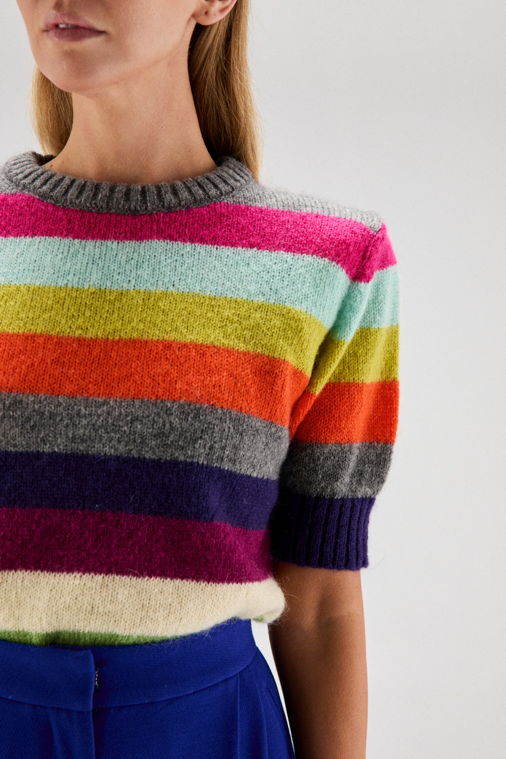 El modelo AURA se trata de un jersey de punto con mohair, de cuello redondo y manga corta, con rayas multicolor.