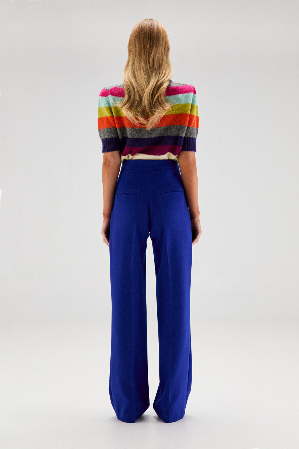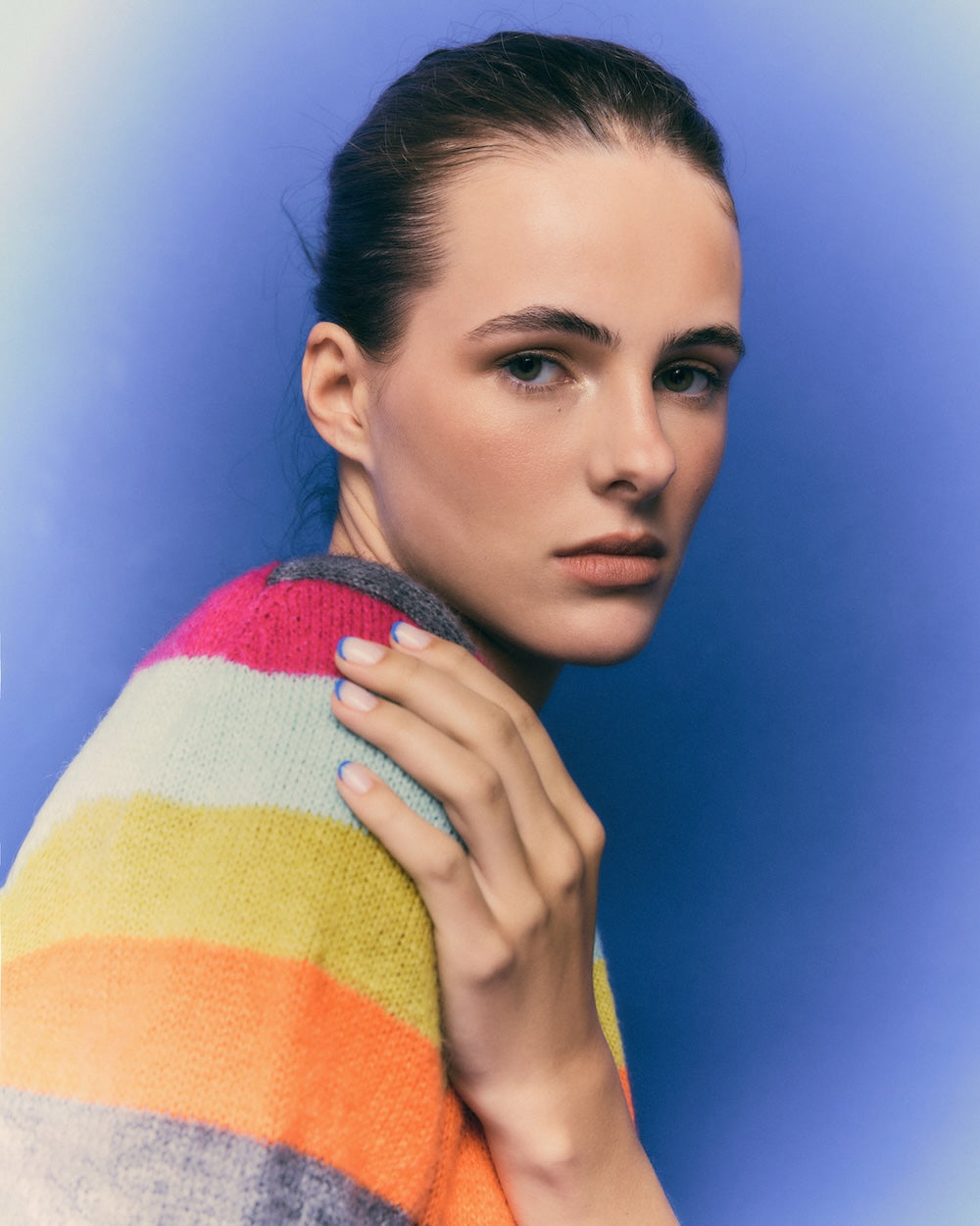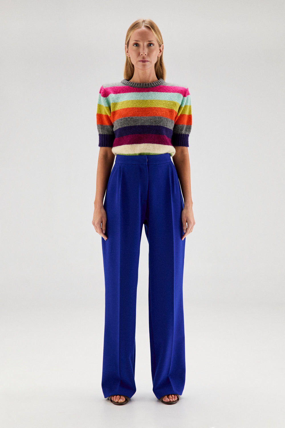 El modelo AURA se trata de un jersey de punto con mohair, de cuello redondo y manga corta, con rayas multicolor.