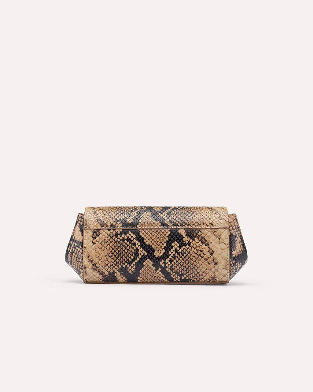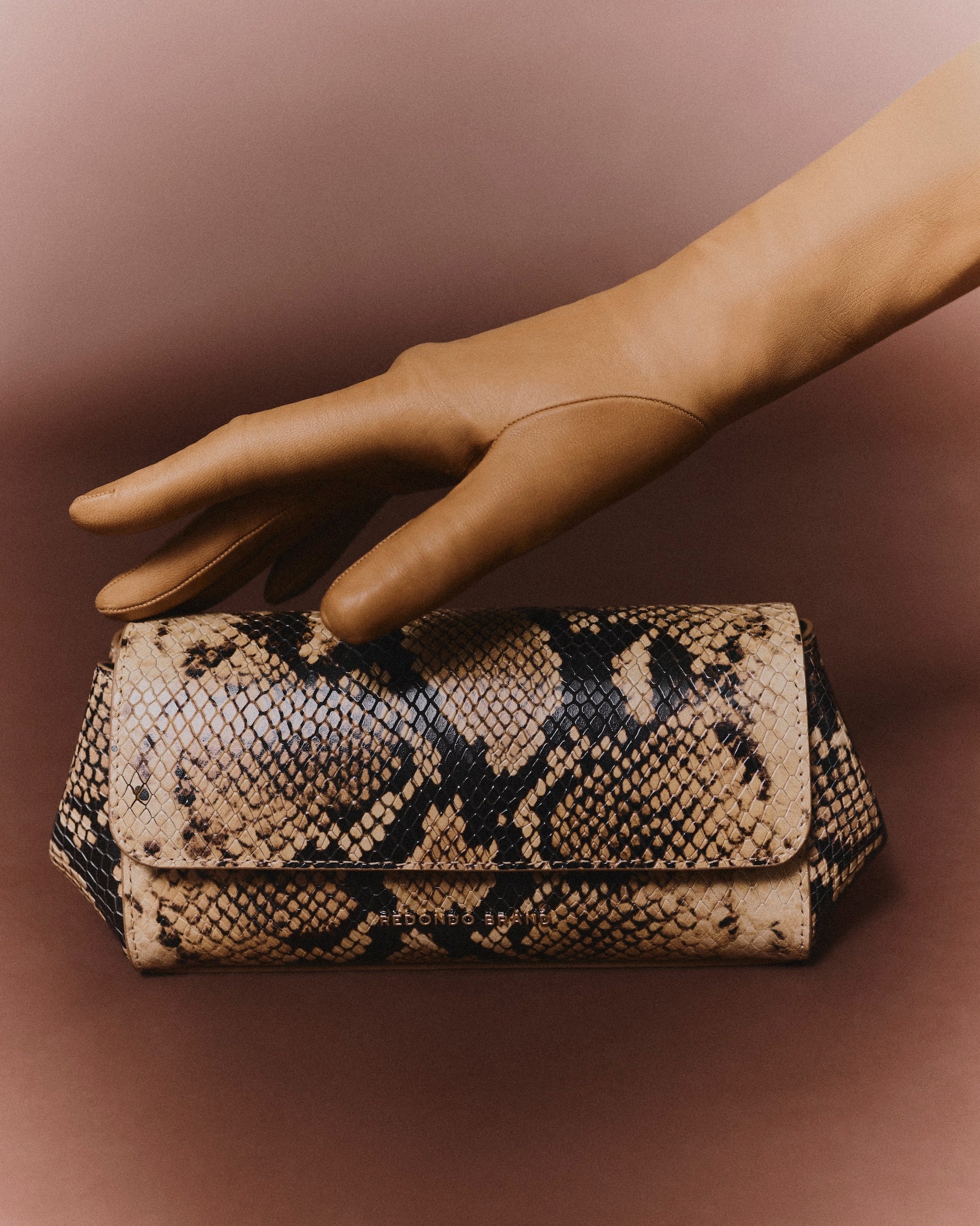 Bolso de mano confeccionado en piel con efecto serpiente en tonos beige y negro.