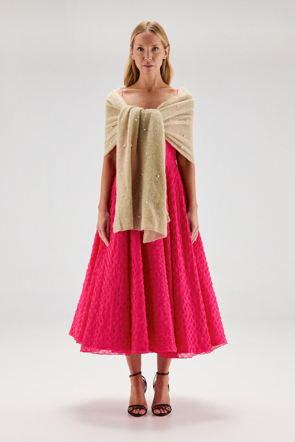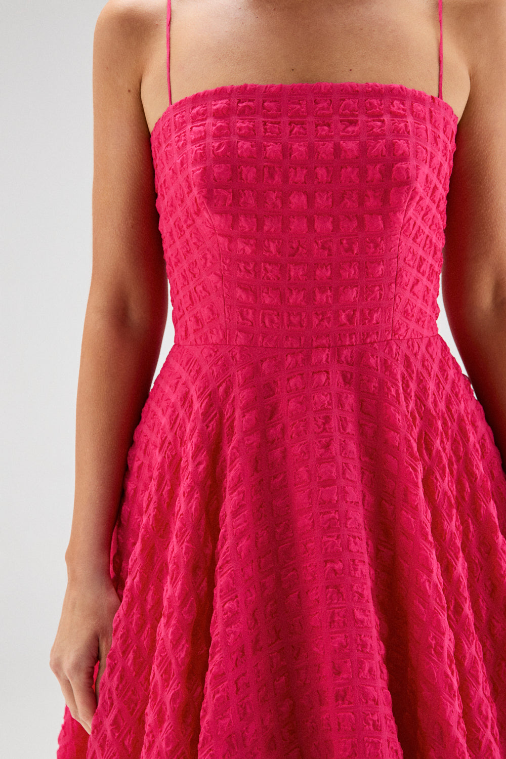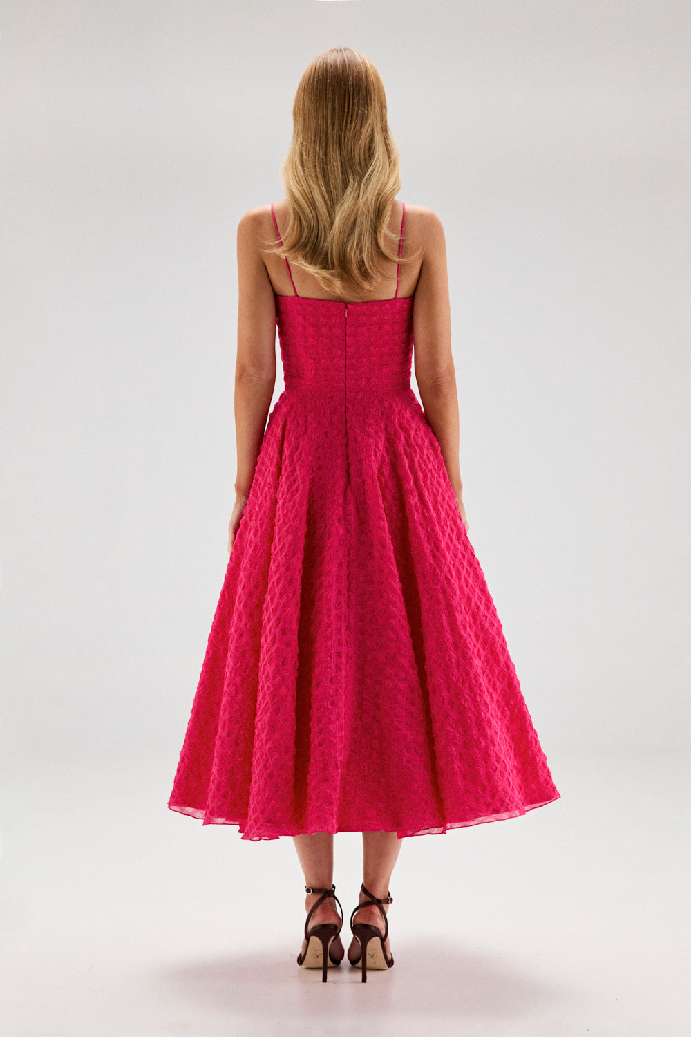El modelo PILAR FUCSIA es una vestido de escote recto con tirantes finos y corte midi hasta el tobillo. Está confeccionado en organza gofrada color rosa fucsia, un tejido estructurado y ligeramente rígido.
