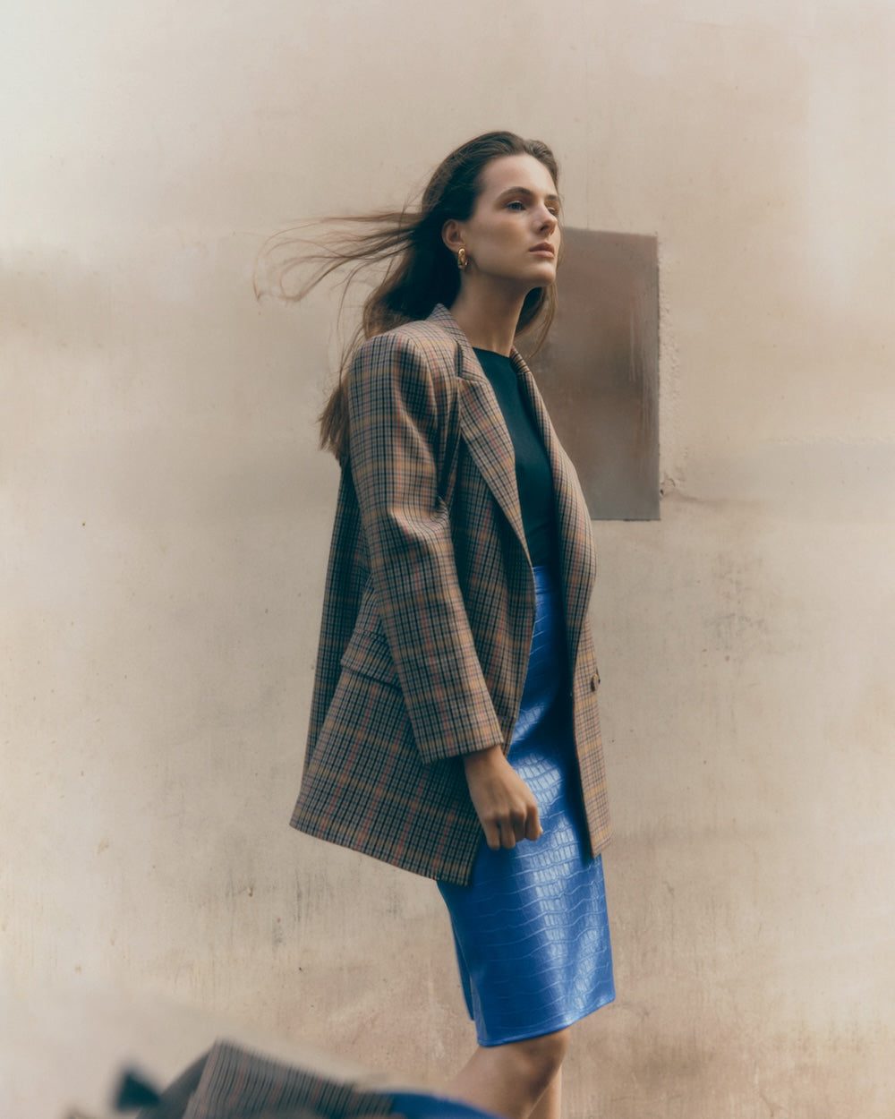 Está realizada en polipiel con textura, en color azul klein. Cuenta con trabillas para cinturón.
