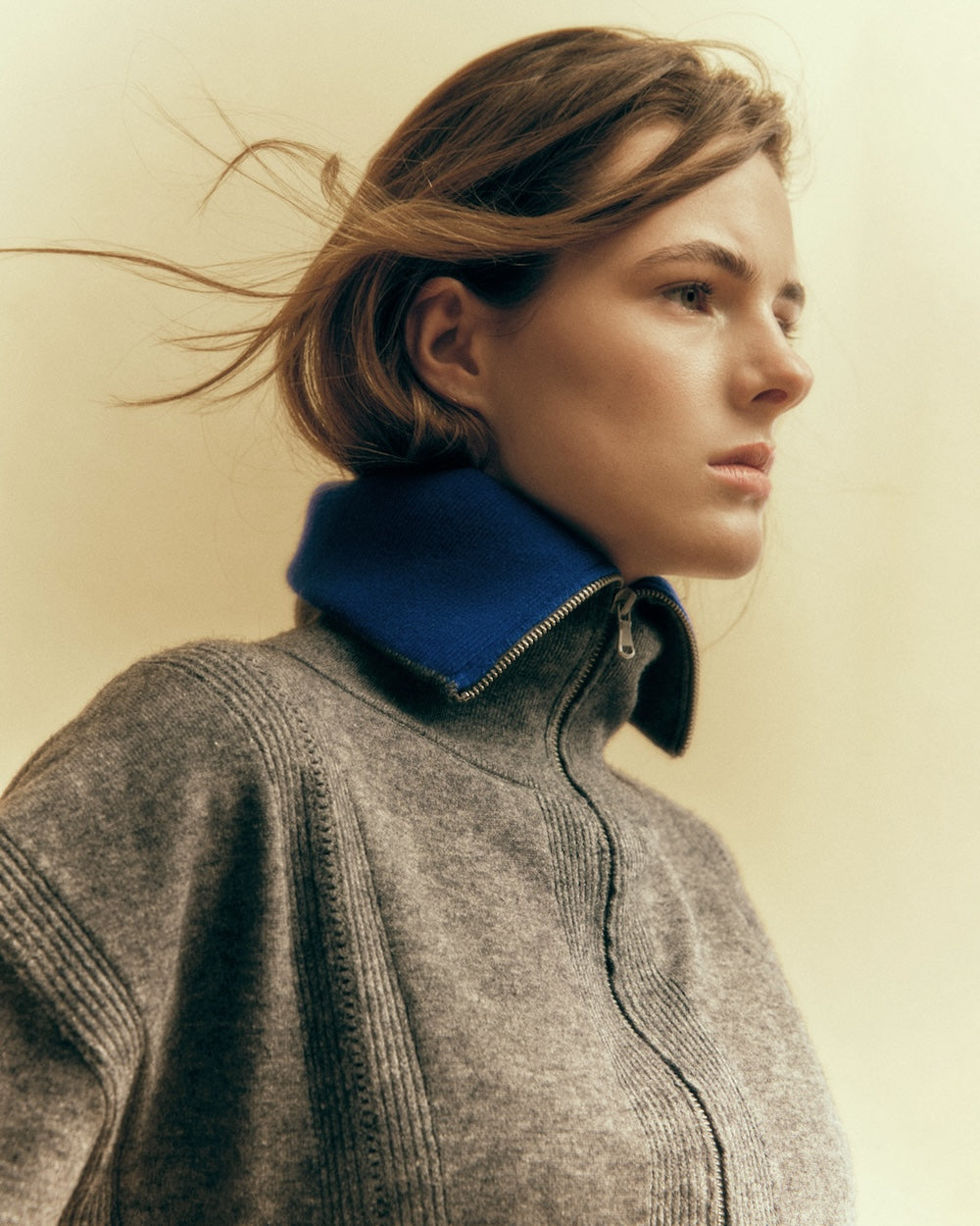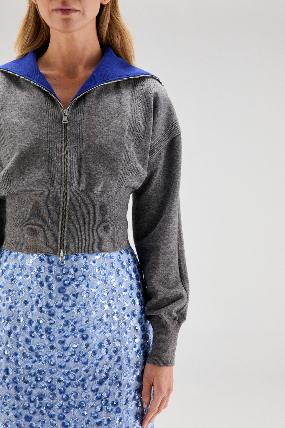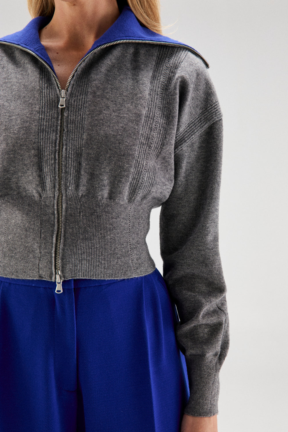 El modelo DOROTA es una chaqueta de punto en gris melange, con detalle del interior de cuello en canalé a contraste azul klein.