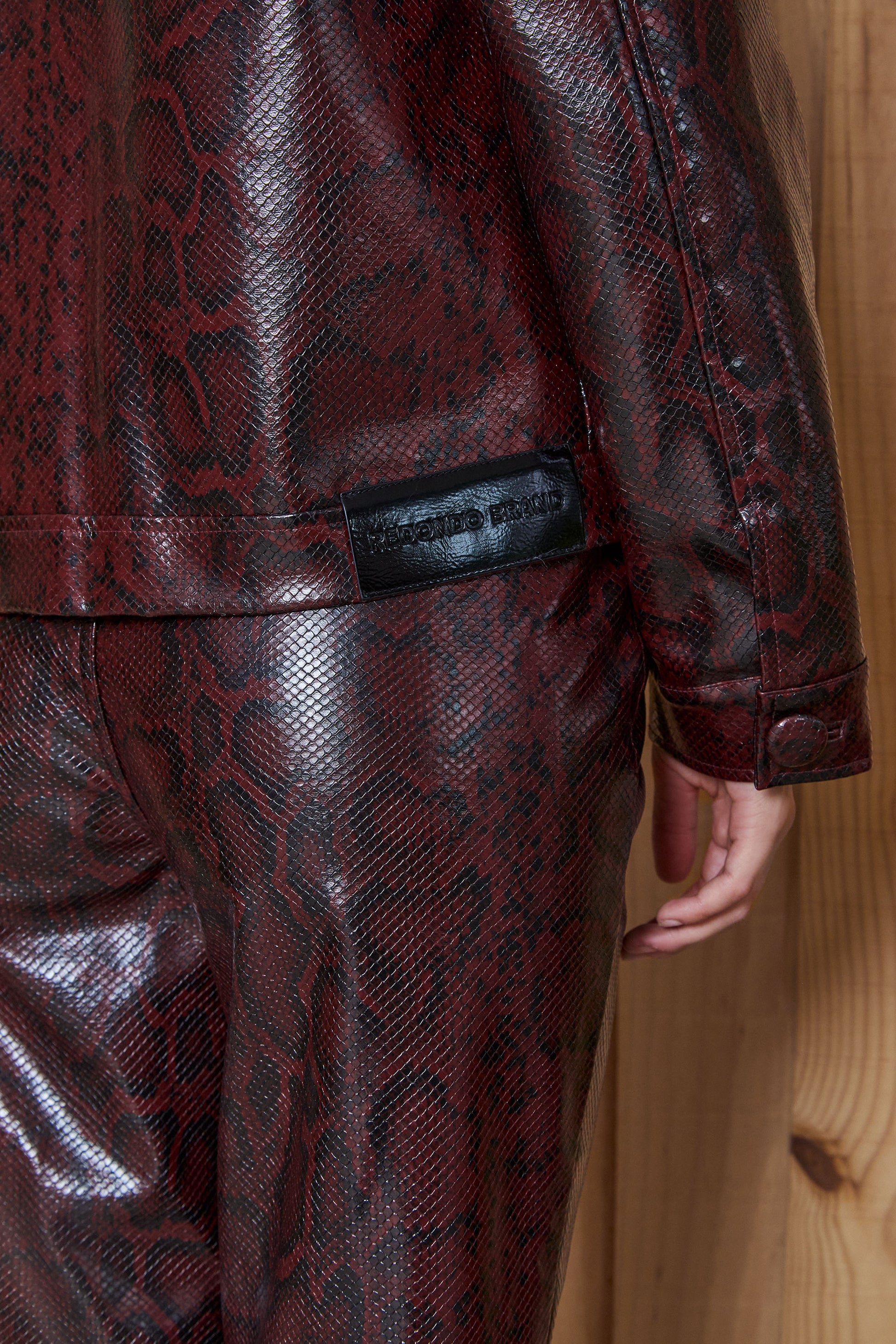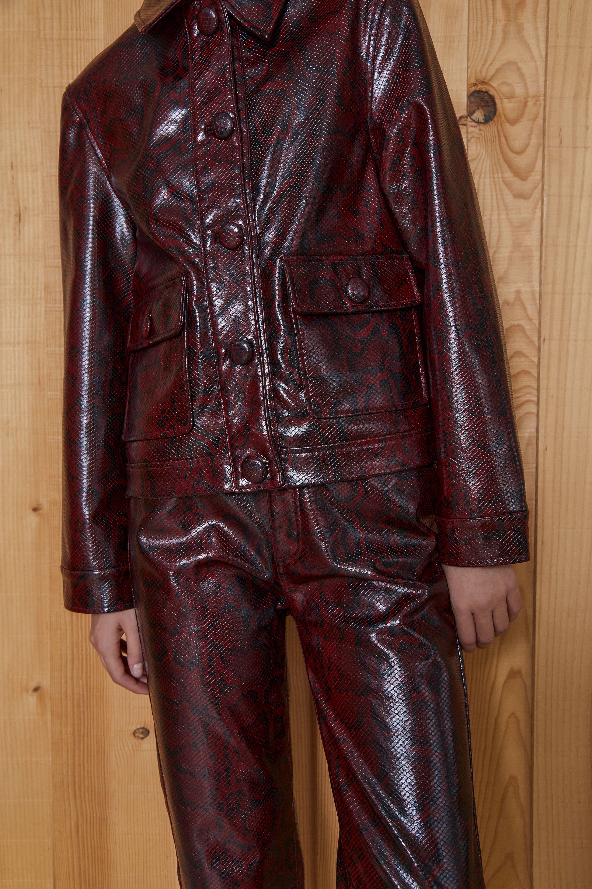 El modelo KATIA se trata de unos pantalones slim de largo tobillero en PU, efecto piel de serpiente en color granate.