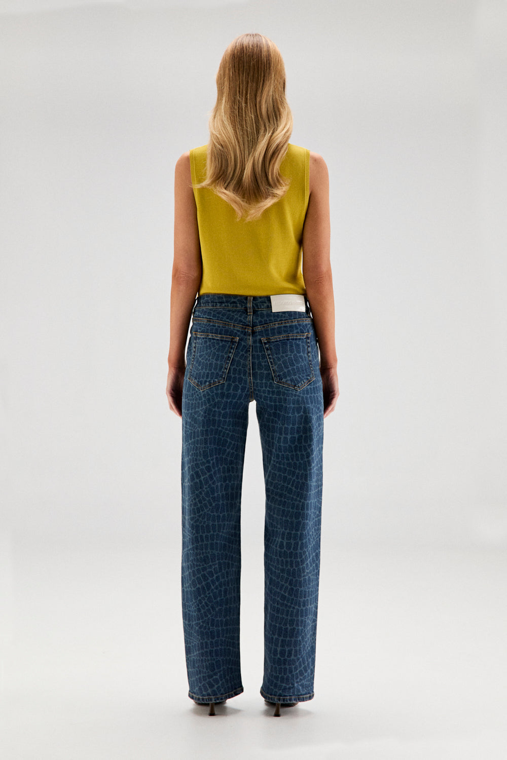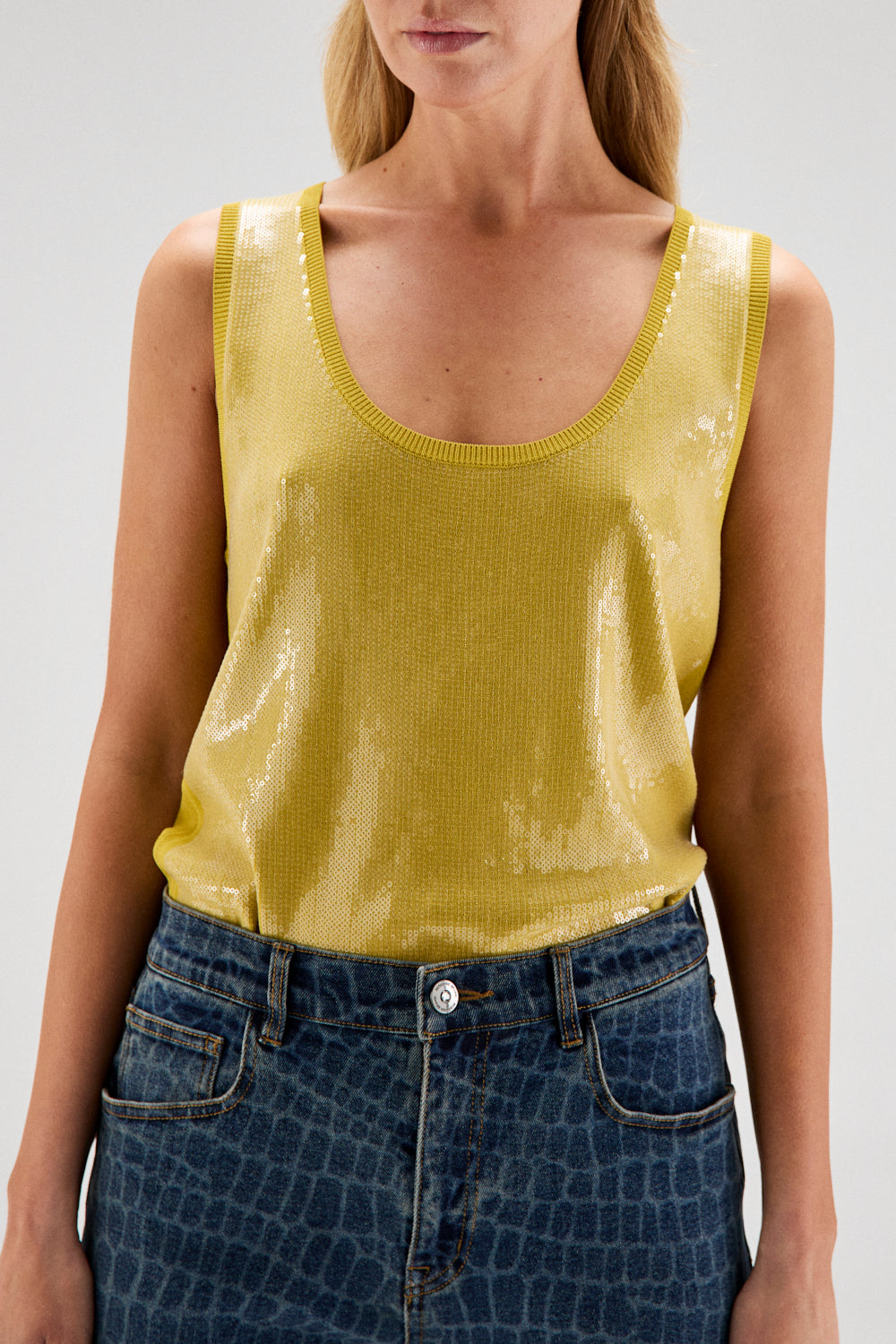 El modelo JULIE es un top en manga sisa, fit recto, en punto fino de color pistacho amarillento.
