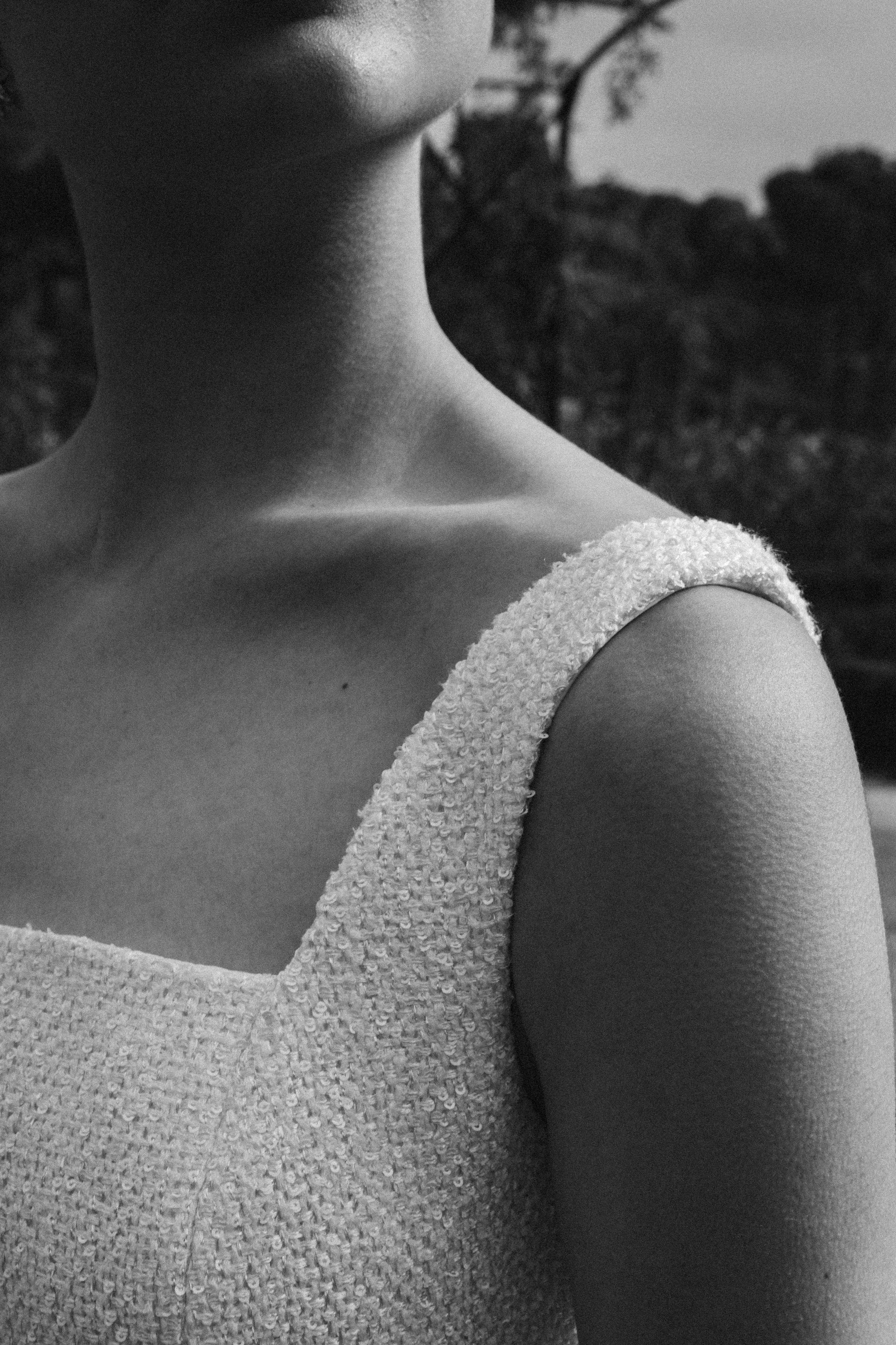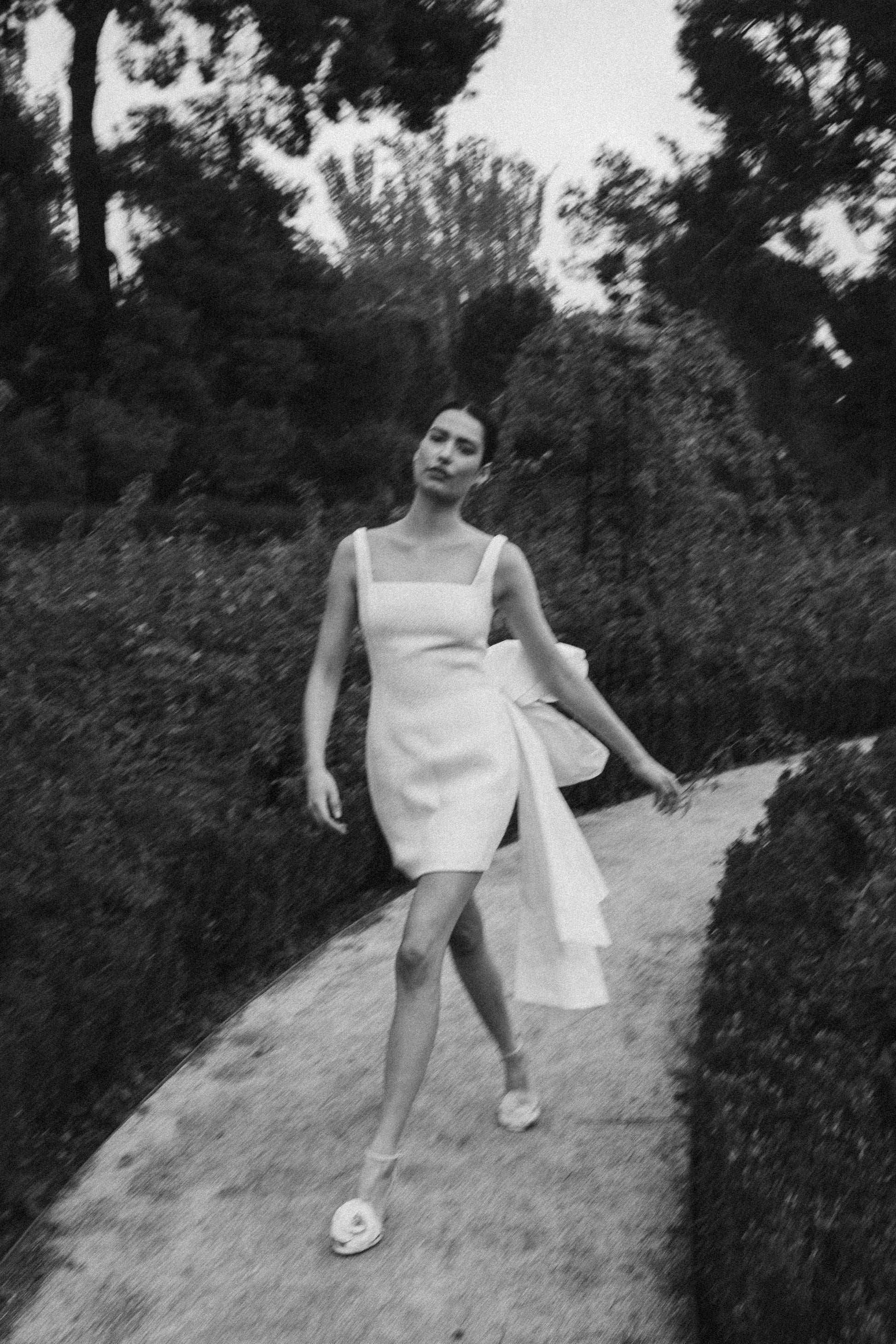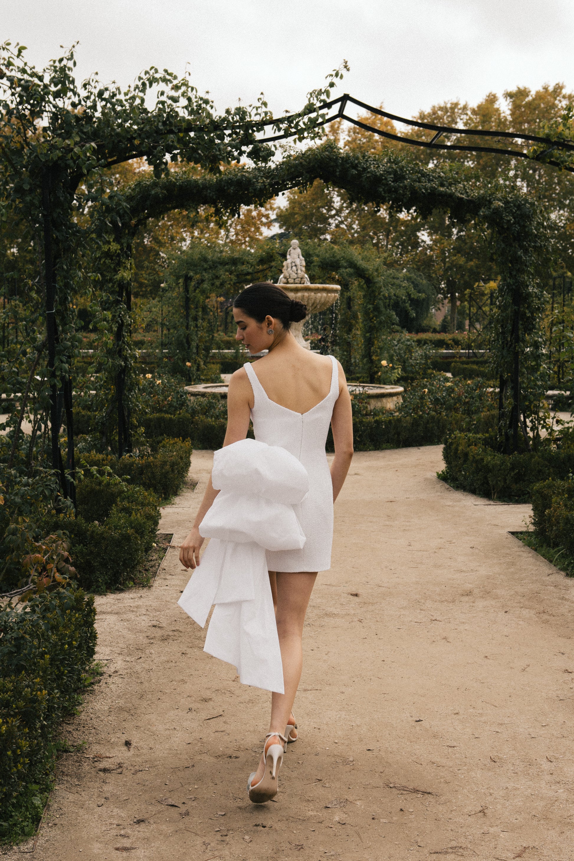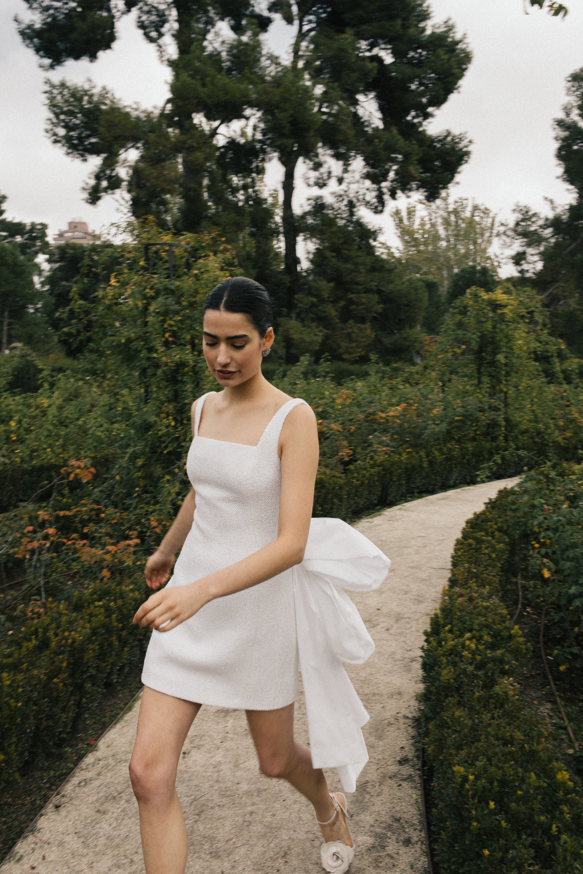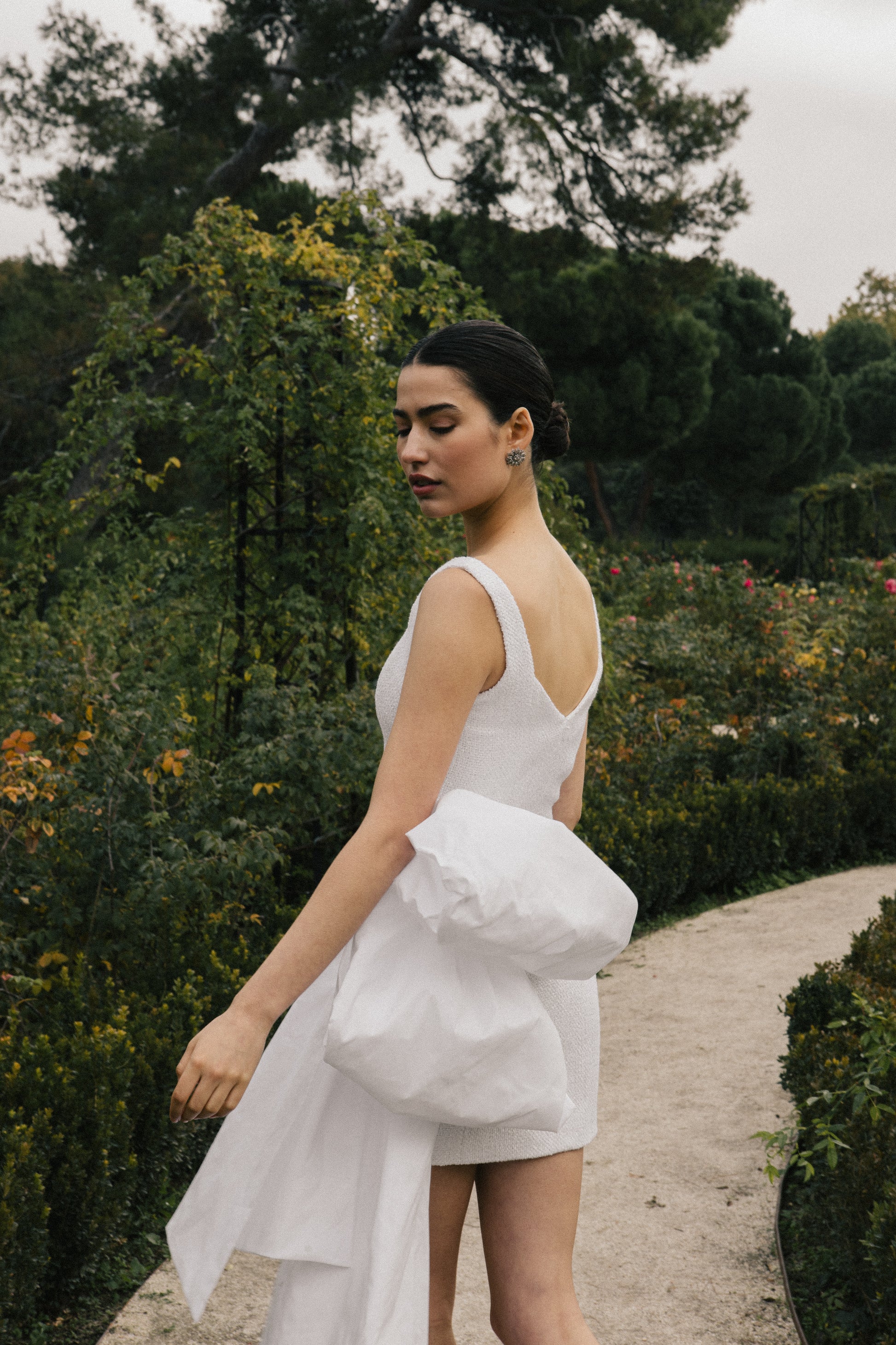 The LUPE model is a mini dress with seams and a square neckline. It is made of white sequin tweed. The most characteristic detail of this design is the large taffeta bow on the side of the back.
