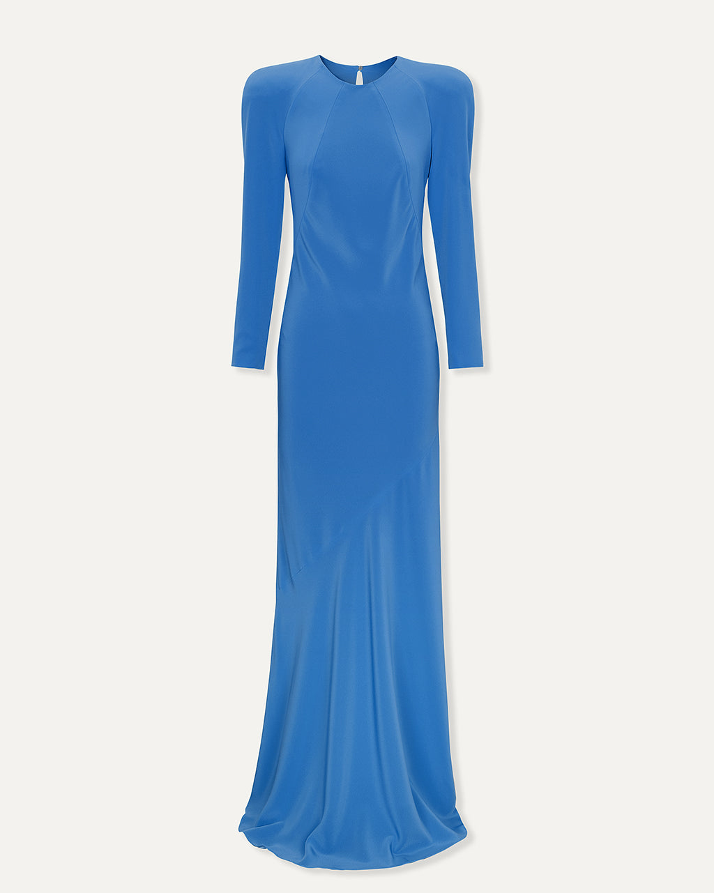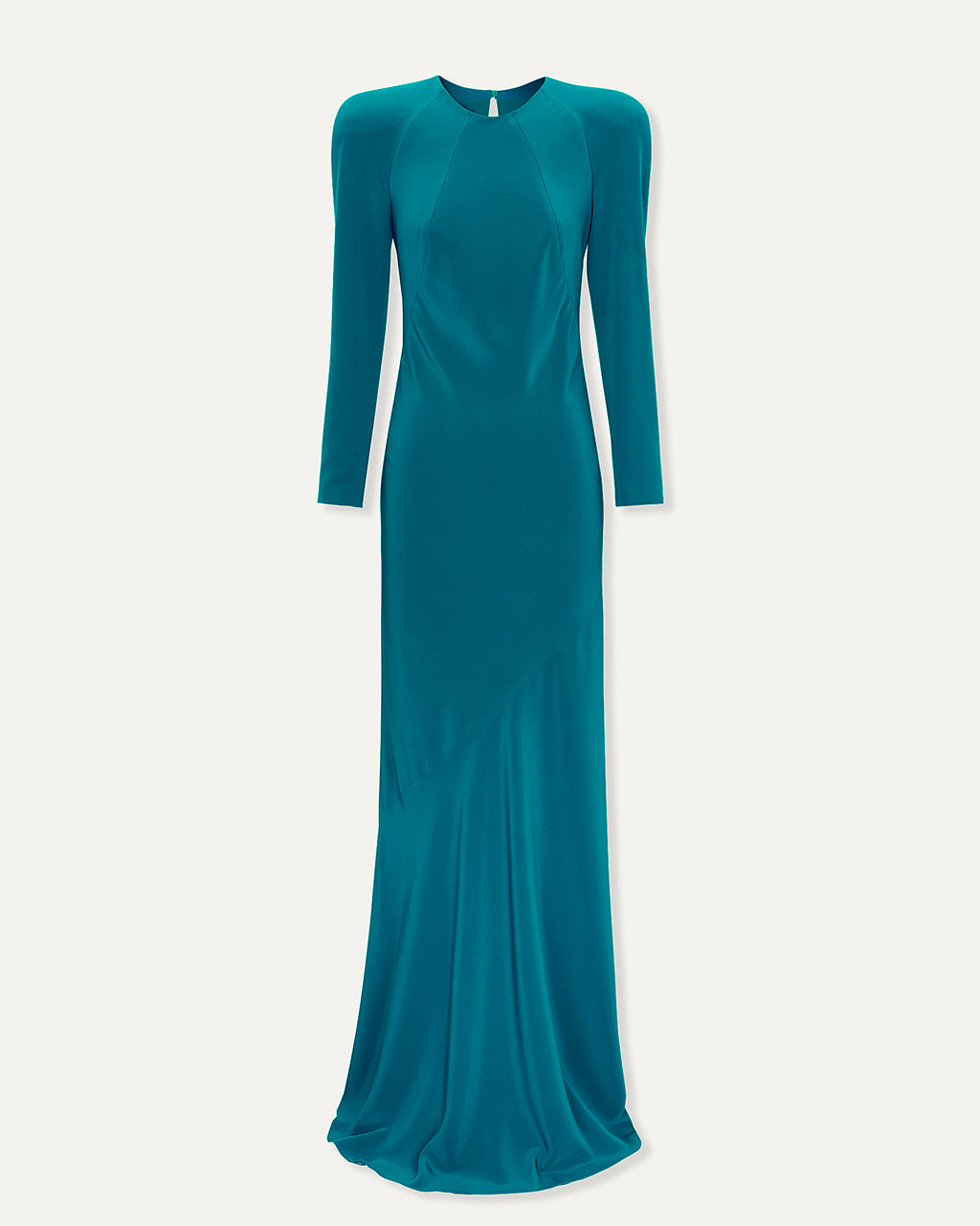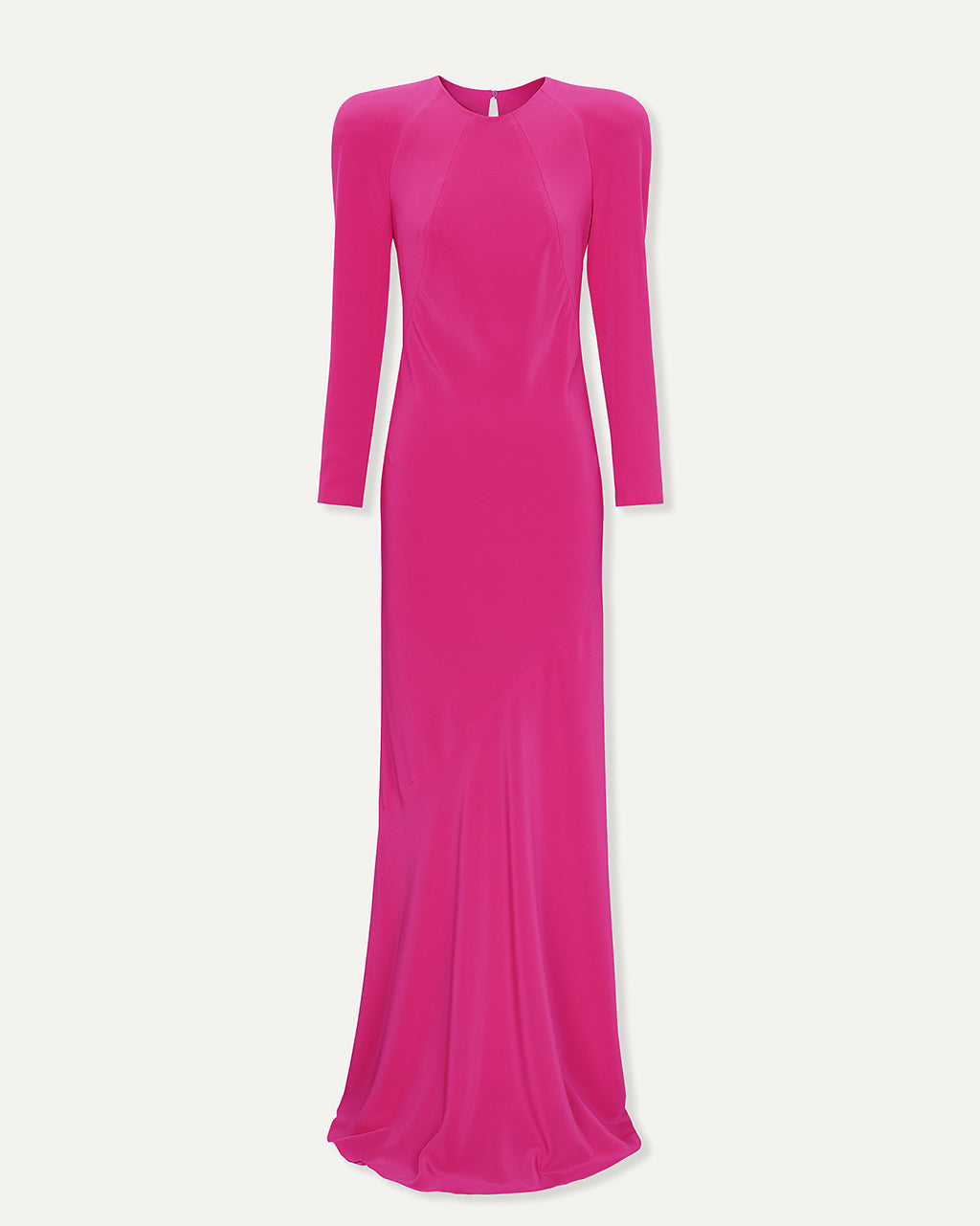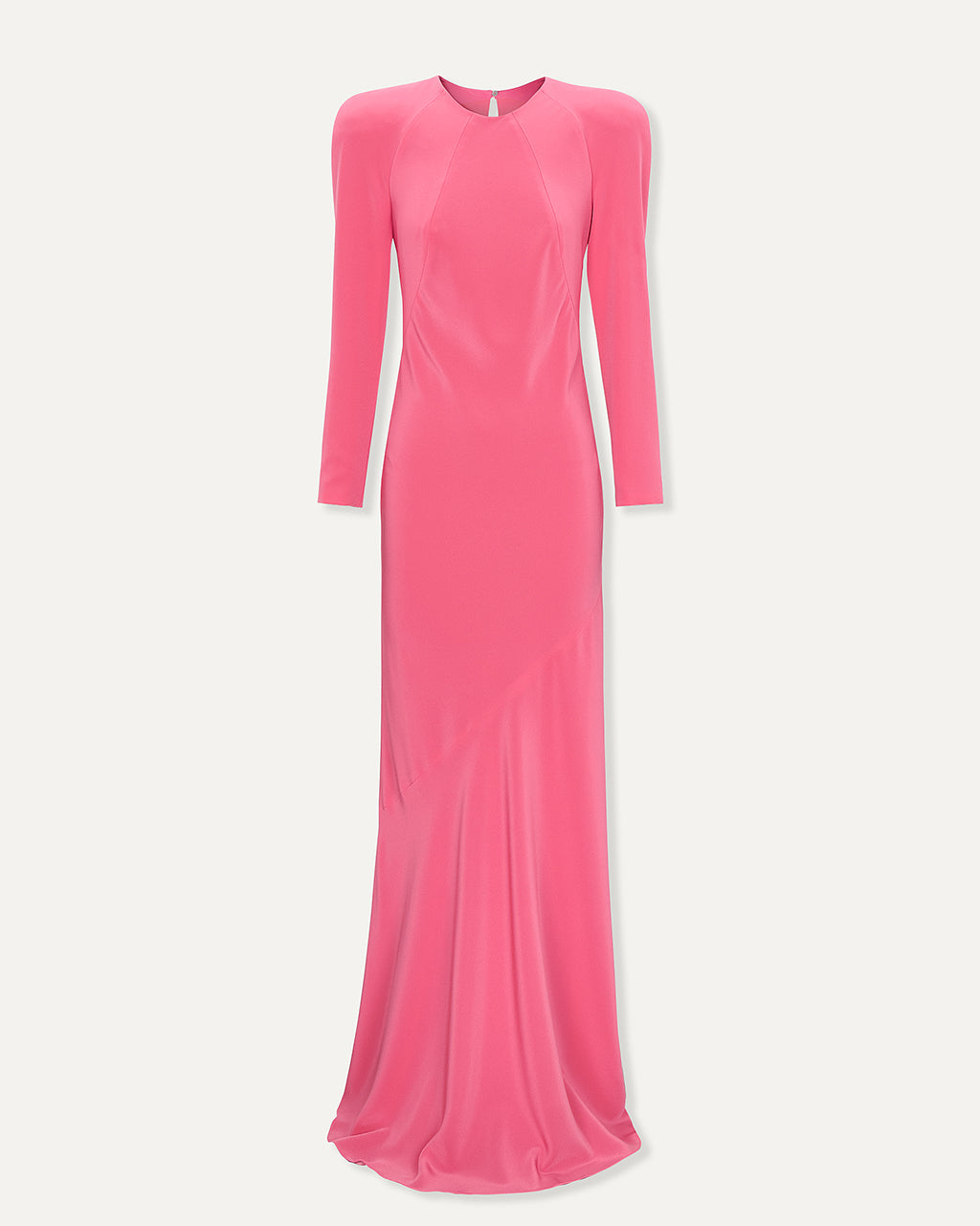 The MIRANDA model is a long design with a bias cut made of pink crepe. The bodice has a round neckline, raglan sleeves and rounded shoulders. The most characteristic detail of this dress is the different darts that it has, which enhance the figure. It has a teardrop-shaped neckline at the back. It fastens with an invisible zipper in the center of the back and has a hook and eye reinforcement at the top.