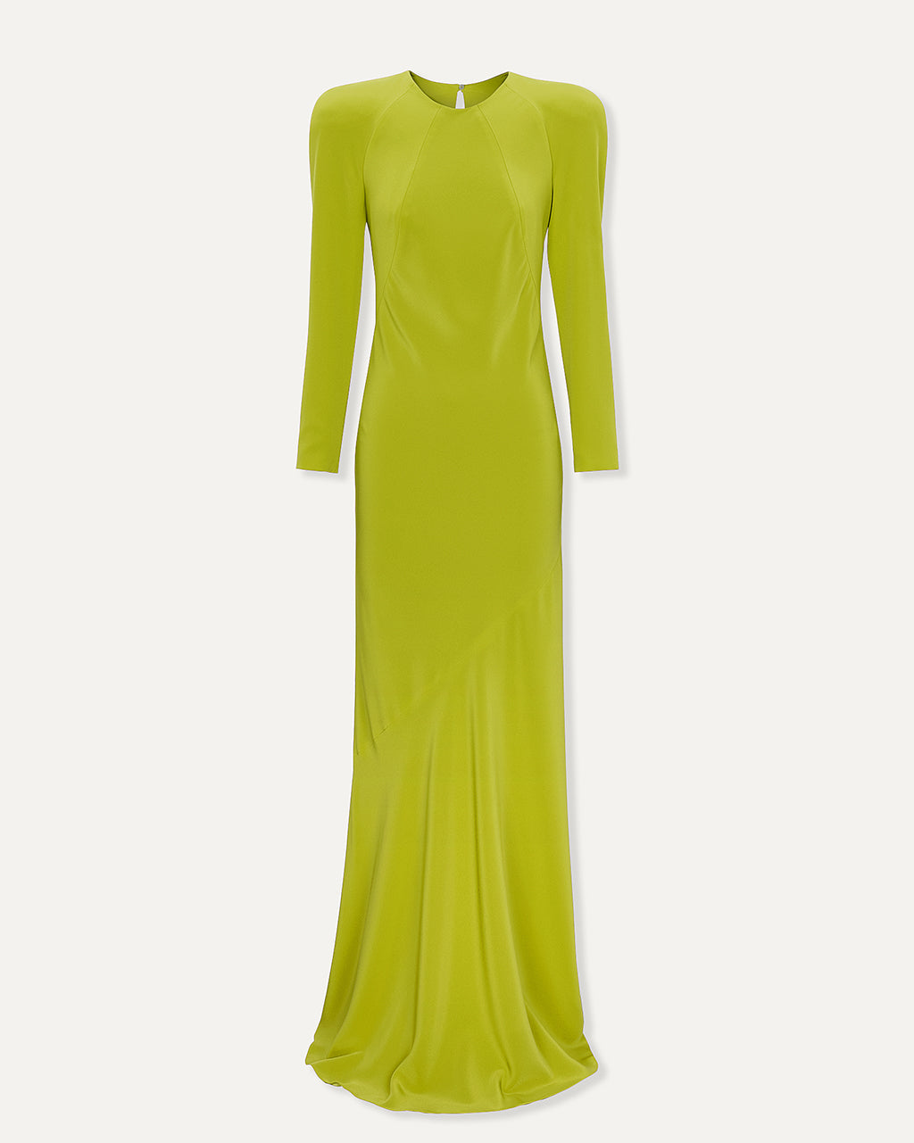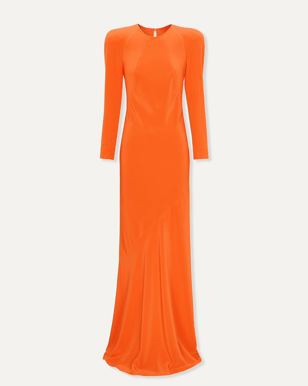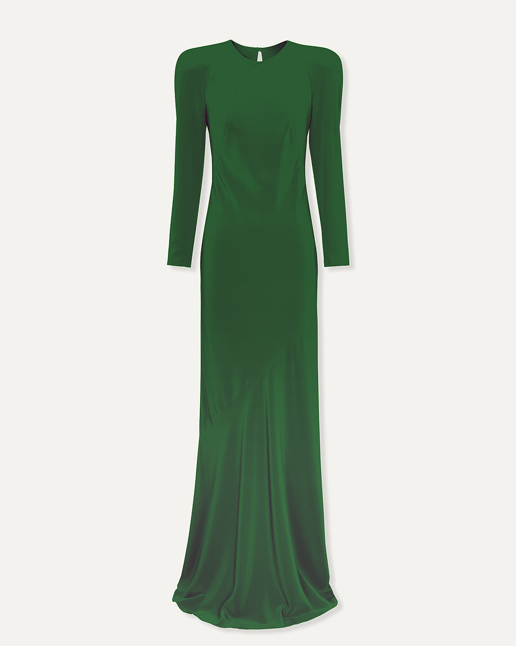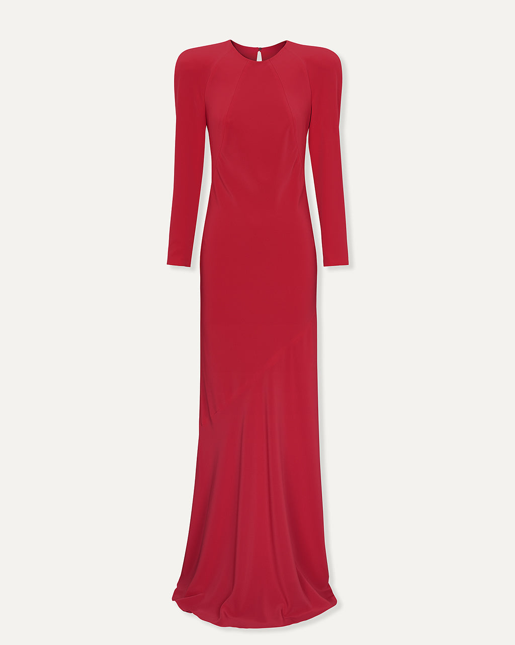 The MIRANDA model is a long design with a bias cut made of pink crepe. The bodice has a round neckline, raglan sleeves and rounded shoulders. The most characteristic detail of this dress is the different darts that it has, which enhance the figure. It has a teardrop-shaped neckline at the back. It fastens with an invisible zipper in the center of the back and has a hook and eye reinforcement at the top.