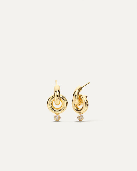 Intertwined hoops with a ball-shaped pendant, adorned with pavé zircons and 18K gold plating.
