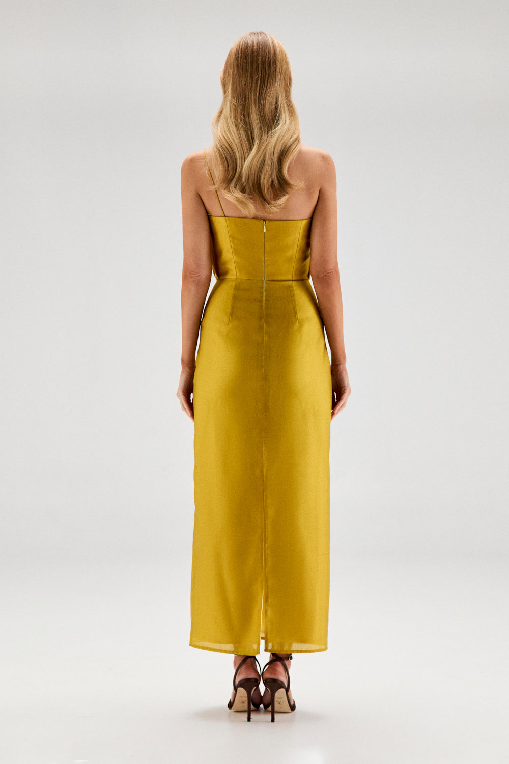 La parte superior es asimétrica, con un solo tirante fino y un drapeado frontal trabajado para crear volumen en la zona del pecho sin añadir rigidez. La cintura está marcada y da paso a una falda recta y larga, que estiliza y alarga visualmente la figura.