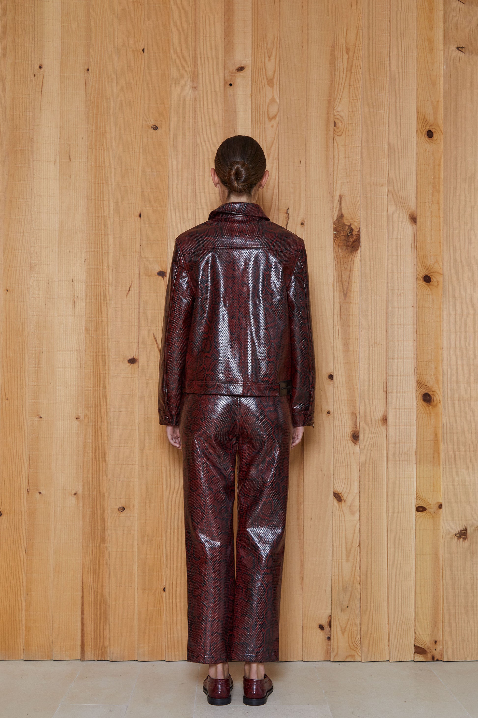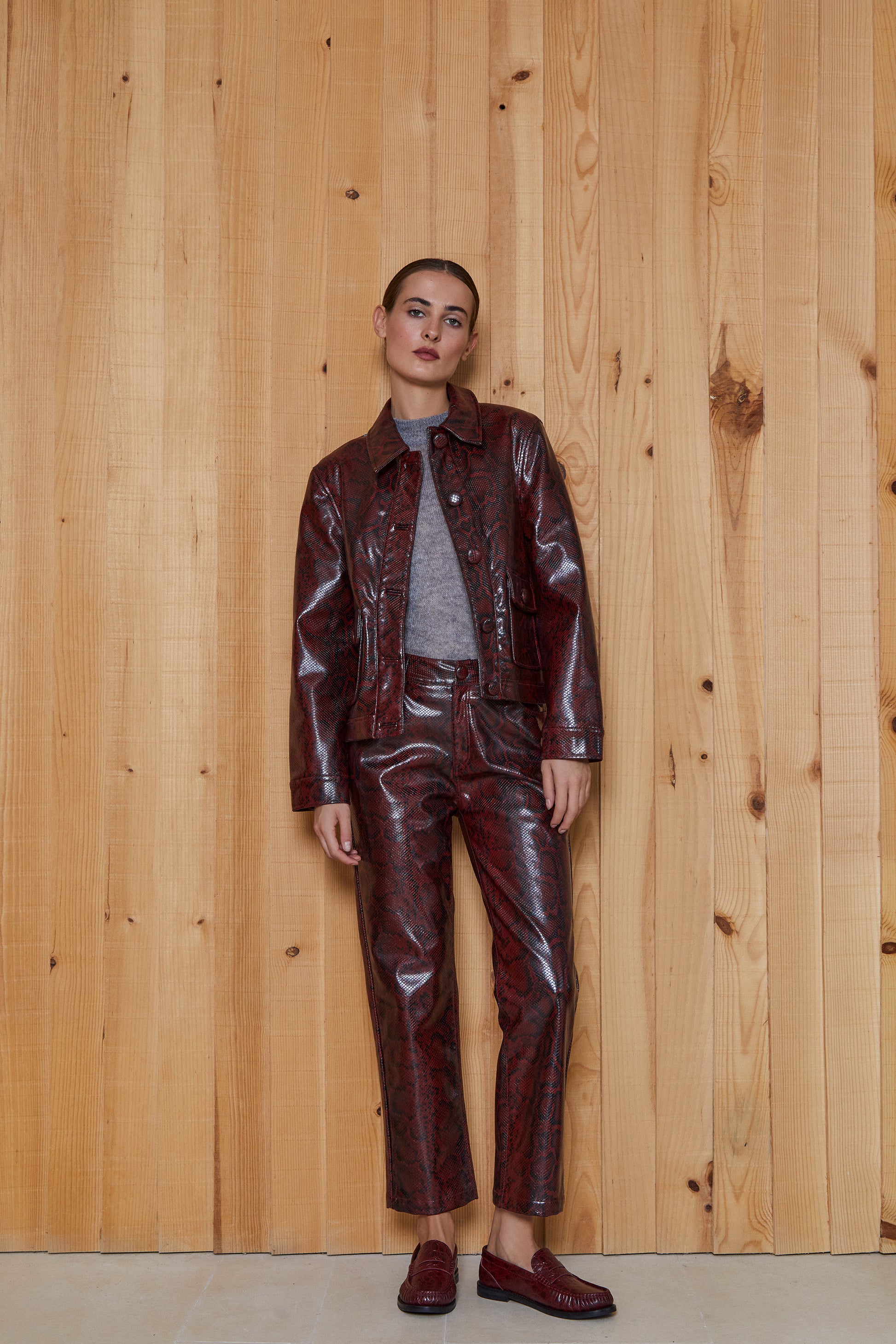 El modelo IRINA se trata de una chaqueta corta en PU, efecto piel de serpiente en color granate.