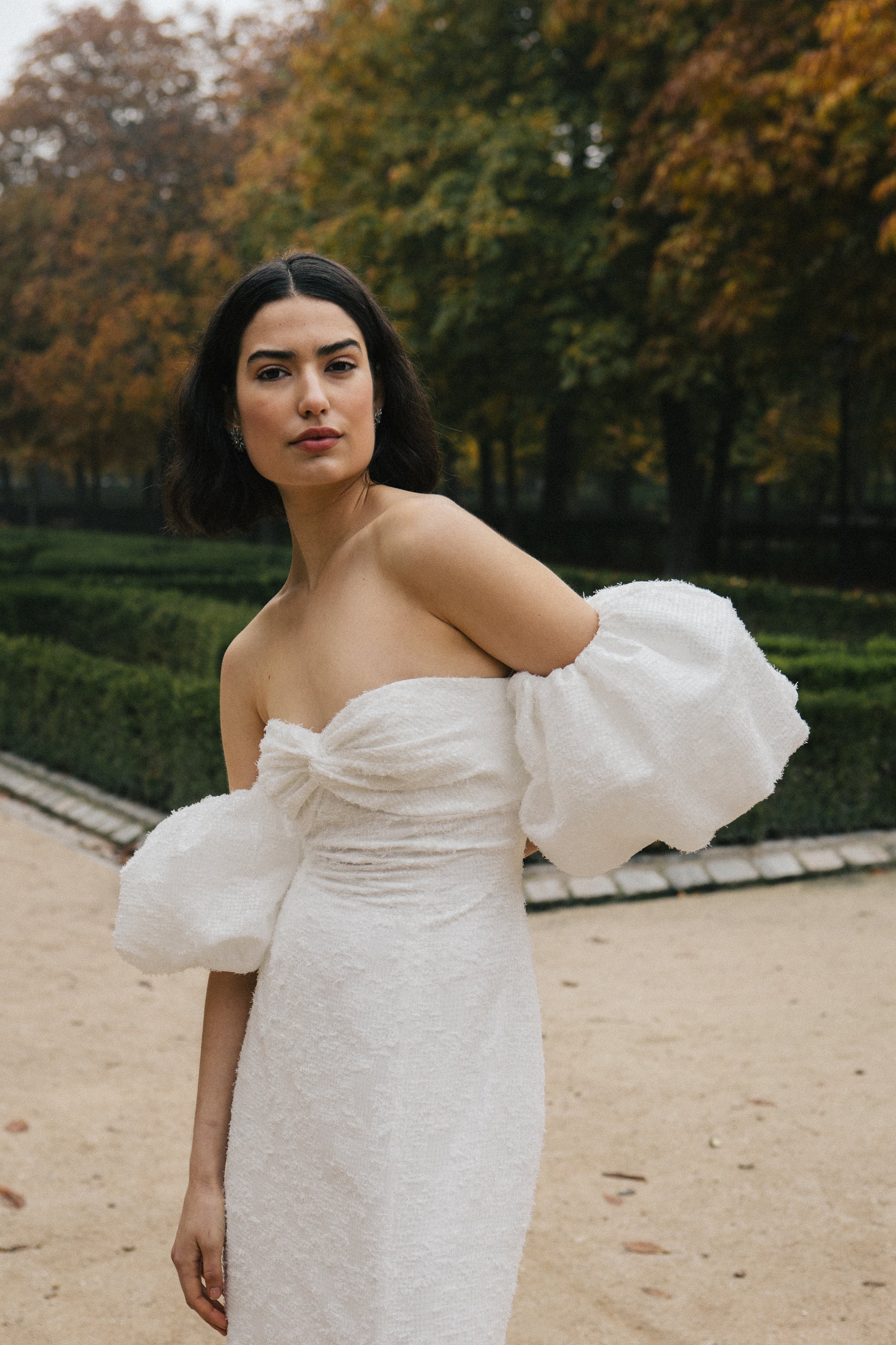 El modelo FEDERICA WHITE de corte largo y recto, está confeccionado en tejido bordado de lentejuelas. Cuenta con un escote drapeado en forma de nudo. Sus grandes mangas abullonadas permiten dejar al descubierto los hombros.