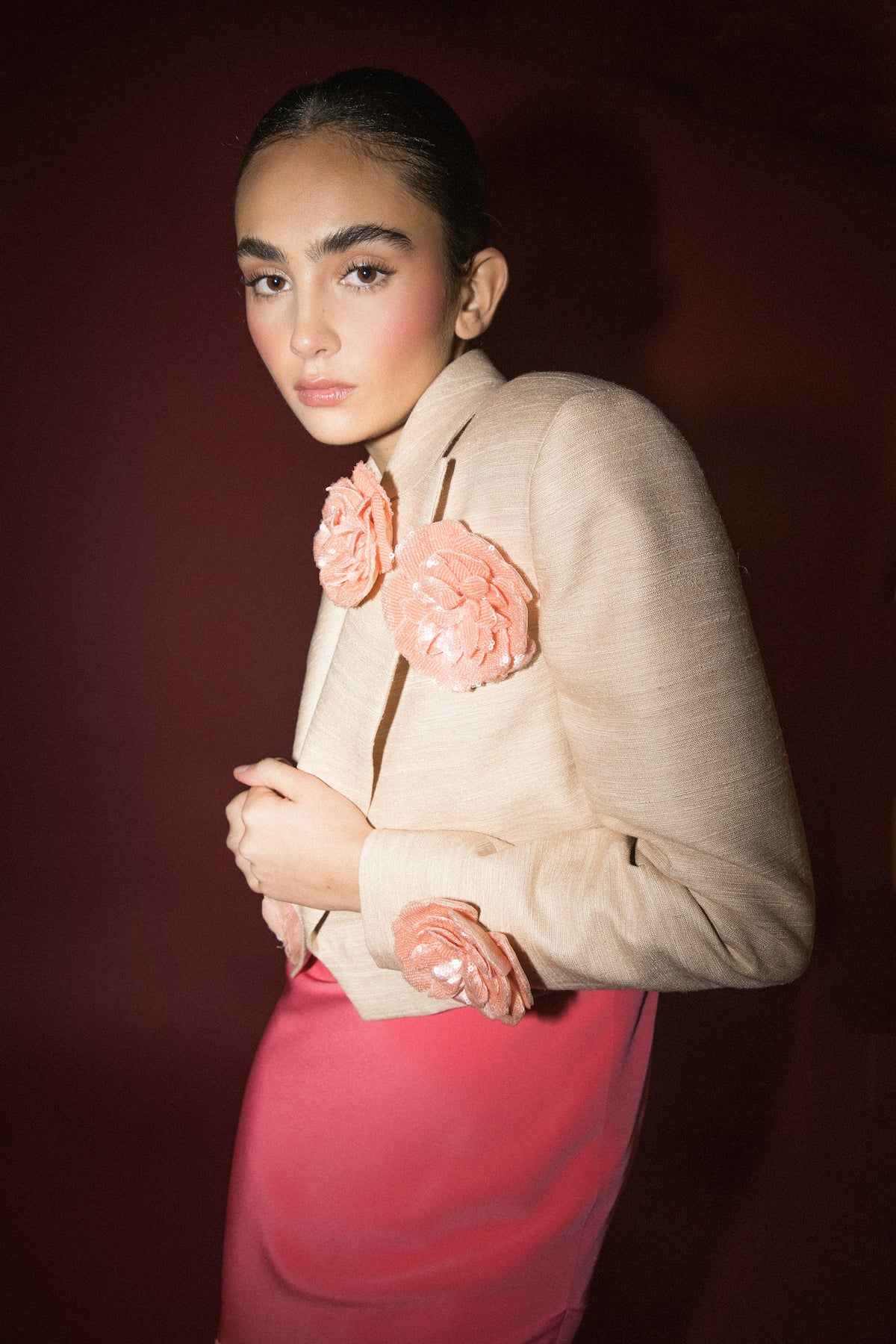 El modelo GALA MANTÓN es una blazer corta confeccionada en viscosa con flores bordadas de lentejuelas. El detalle más característico de esta prenda son las maxi hombreas que enmarcan los hombros, y la solapa en contraste de satén.