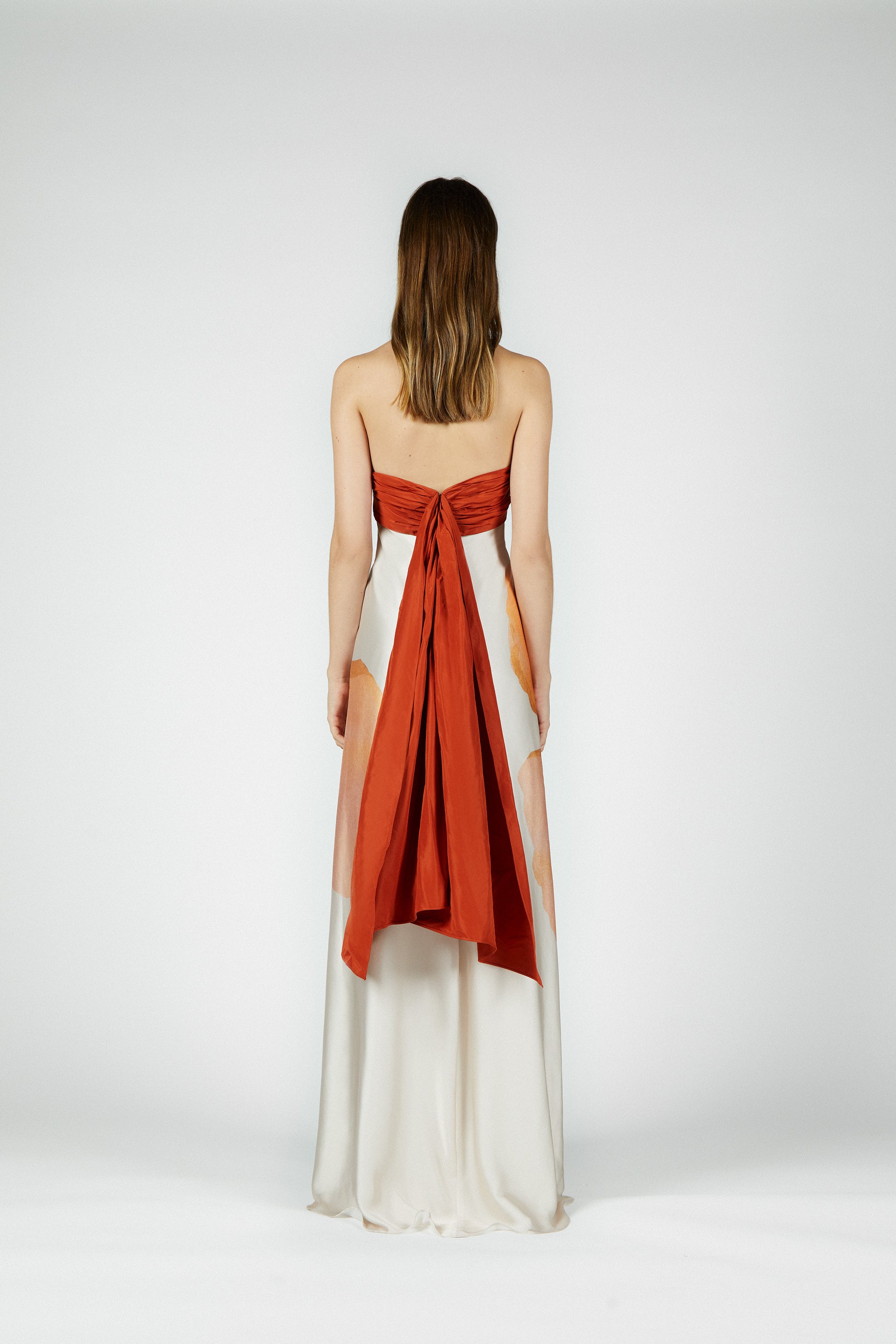 El modelo BETINA es un vestido strapless de silueta imperio, con una tira drapeada a la altura del pecho realizada en tafeta, de la que sale la falda en satén con maxiestampado de flor.