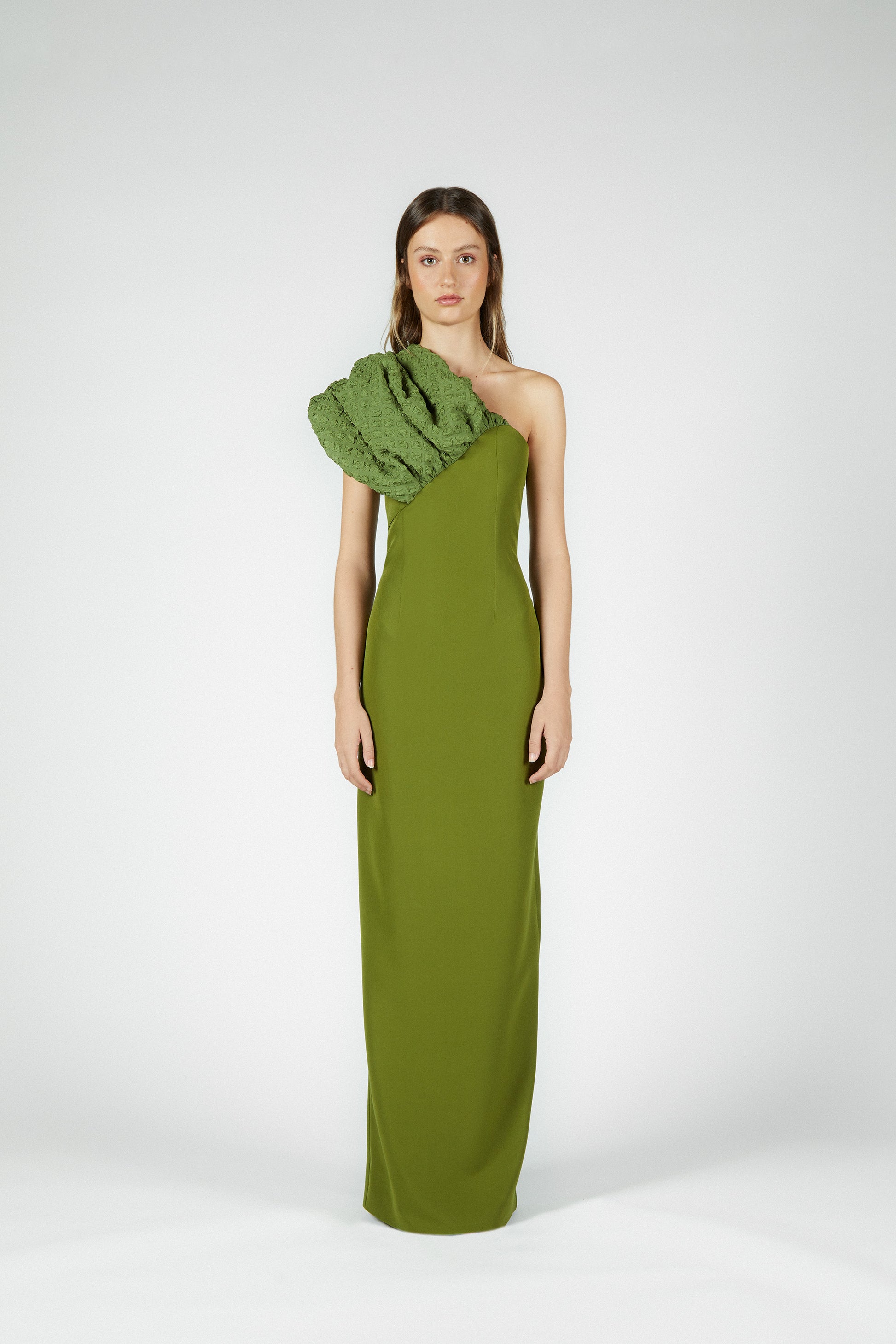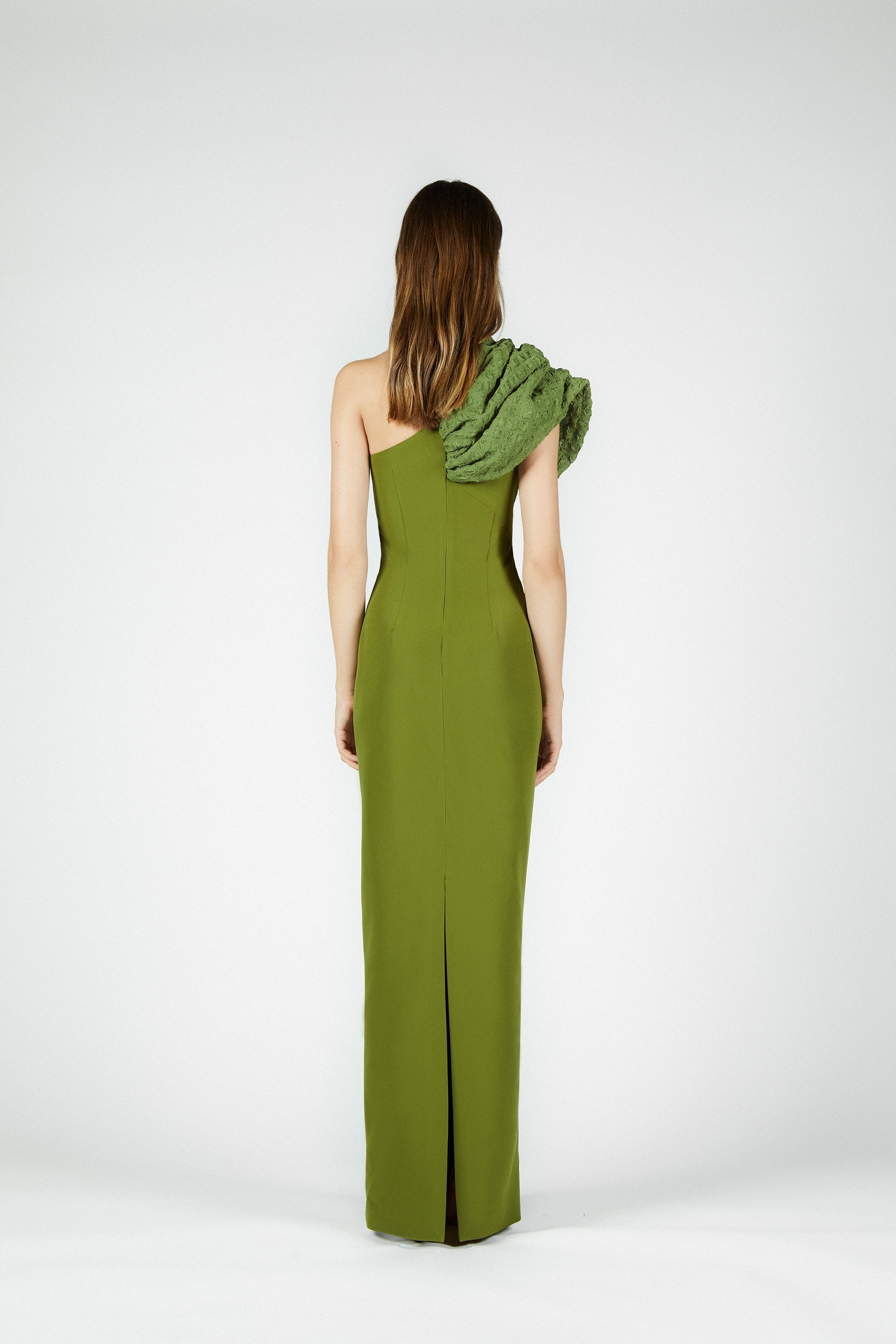Está confeccionado en crepe de color verde, un tejido con confort y caída, y está enteramente forrado. Se cierra en centro espalda con una cremallera invisible reforzada con un corchete.