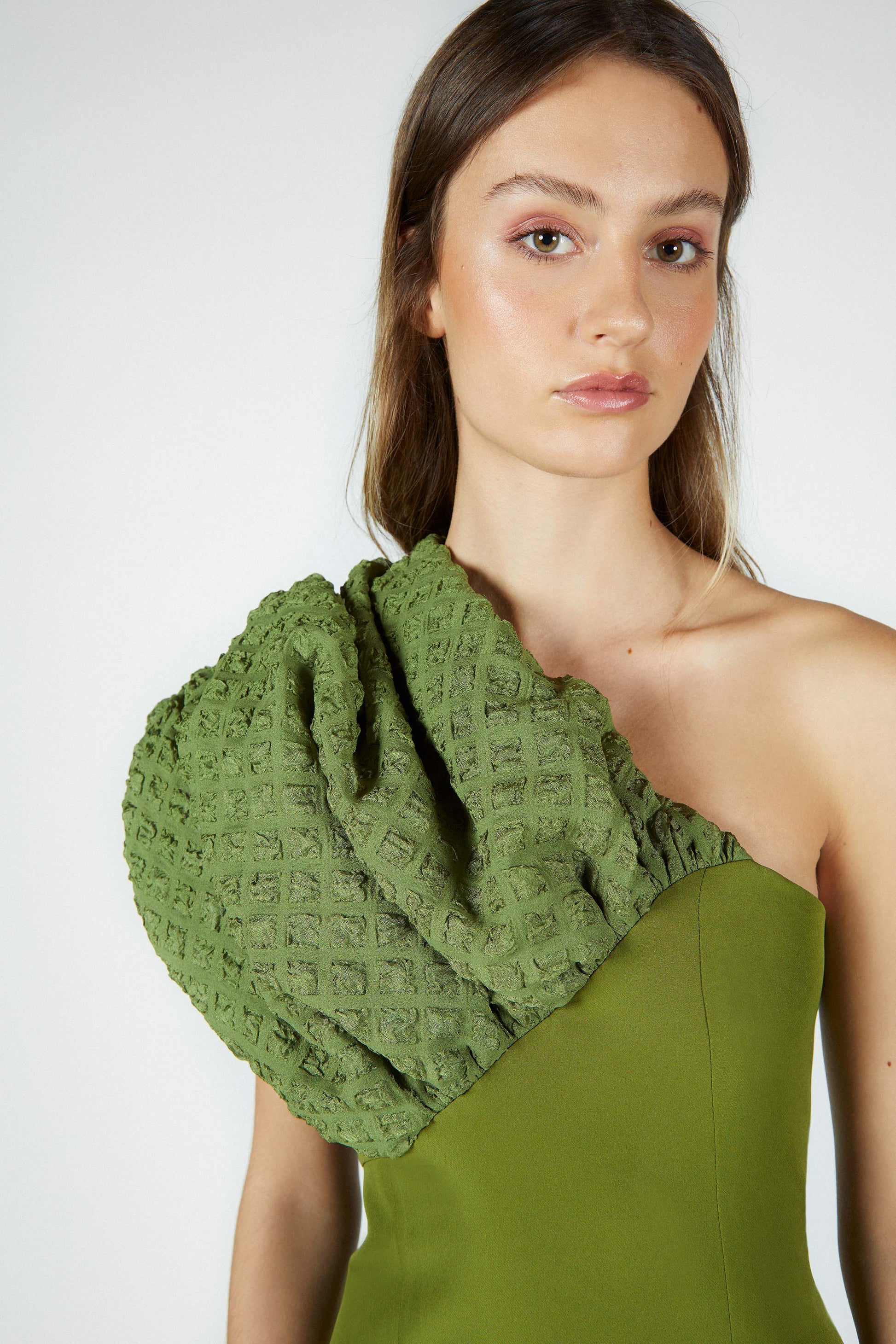 El elemento más destacado de esta prenda es una pieza, a modo de tirante, que cubre el hombro derecho, confeccionada en un tejido gofrado al tono. El volumen de dicho tirante se mantiene gracias a un tul interior.