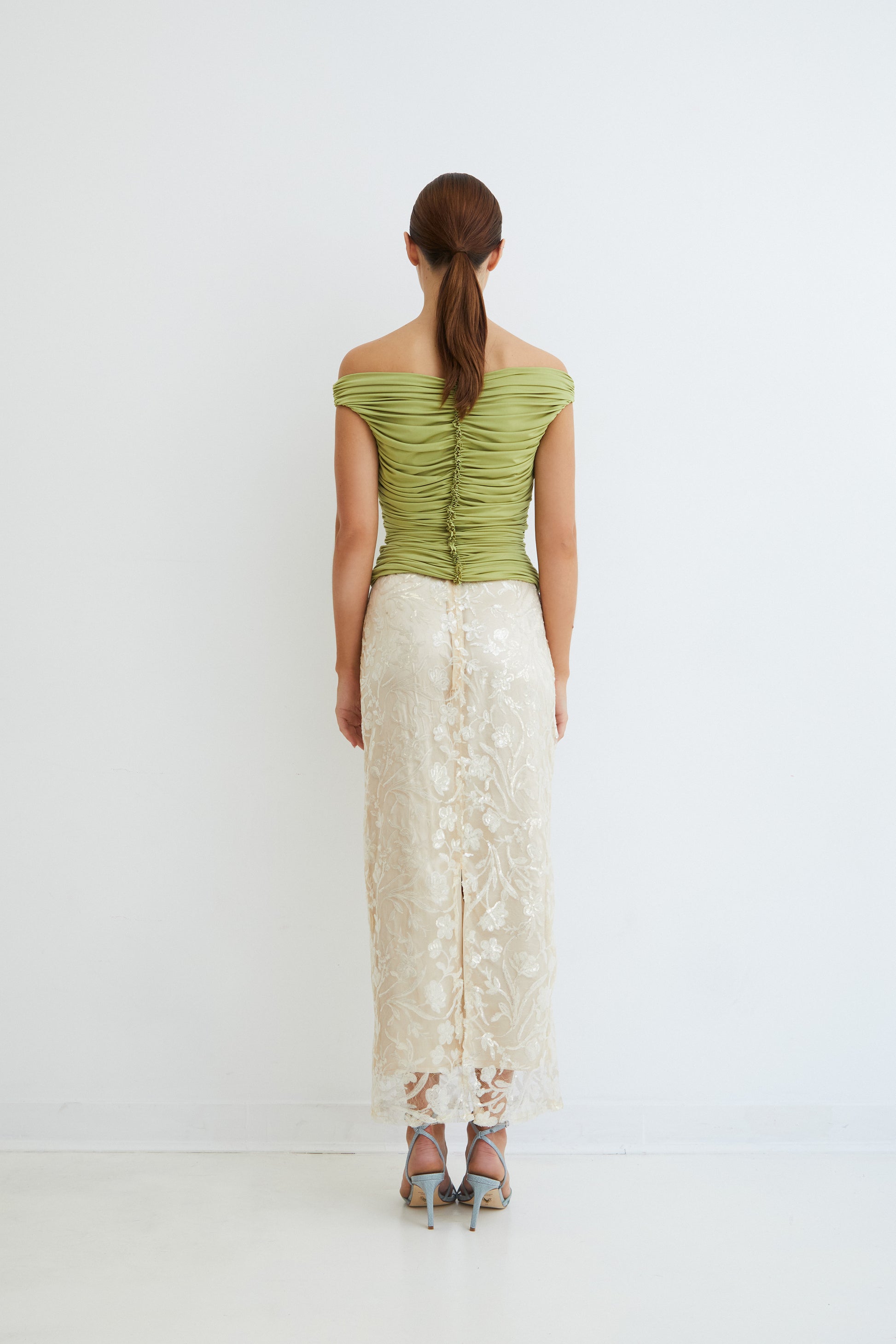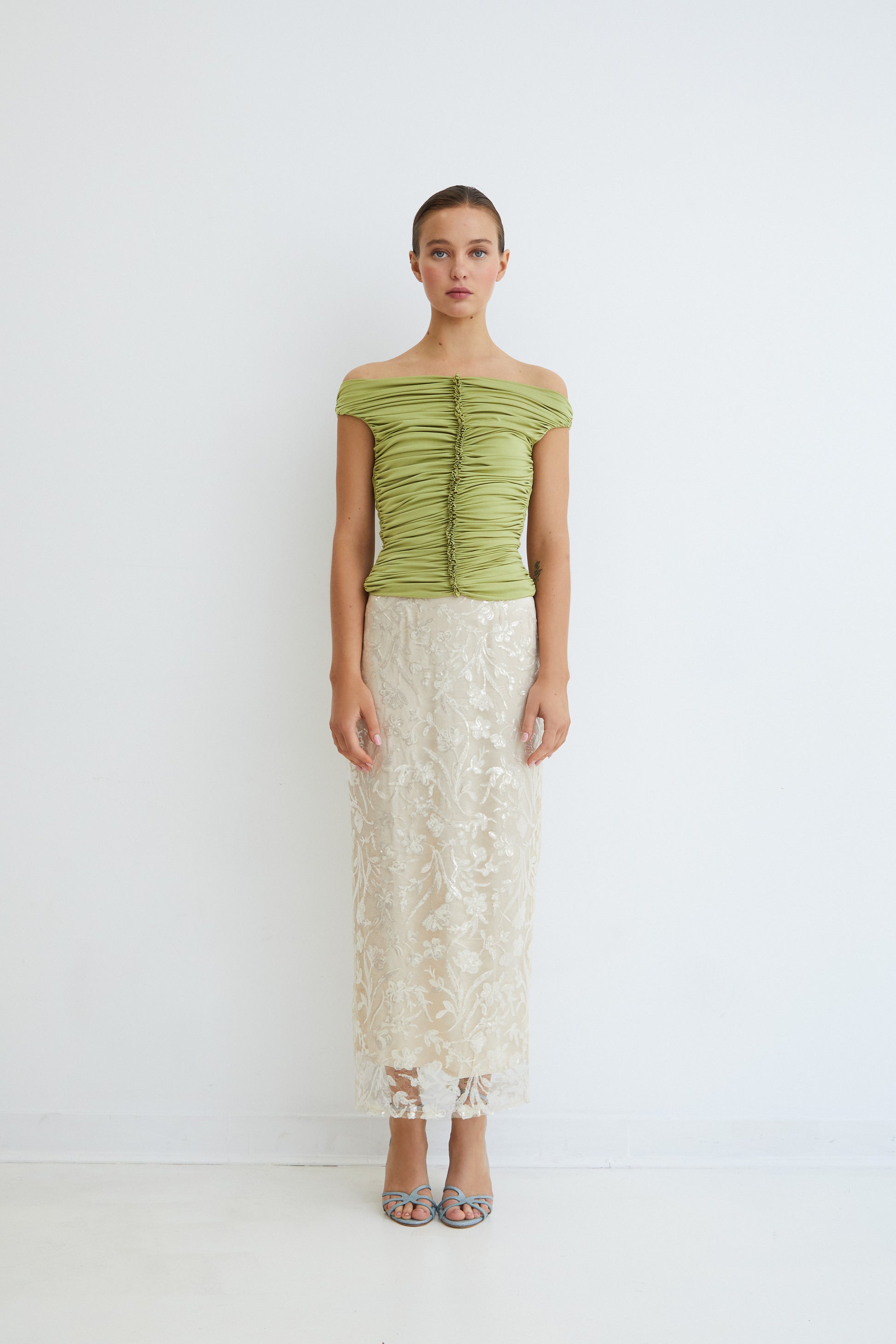 El modelo INDIA es una falda recta con un largo midi que llega hasta el tobillo. Está confeccionado en tul beige con bordados florales en lentejuela plateada.