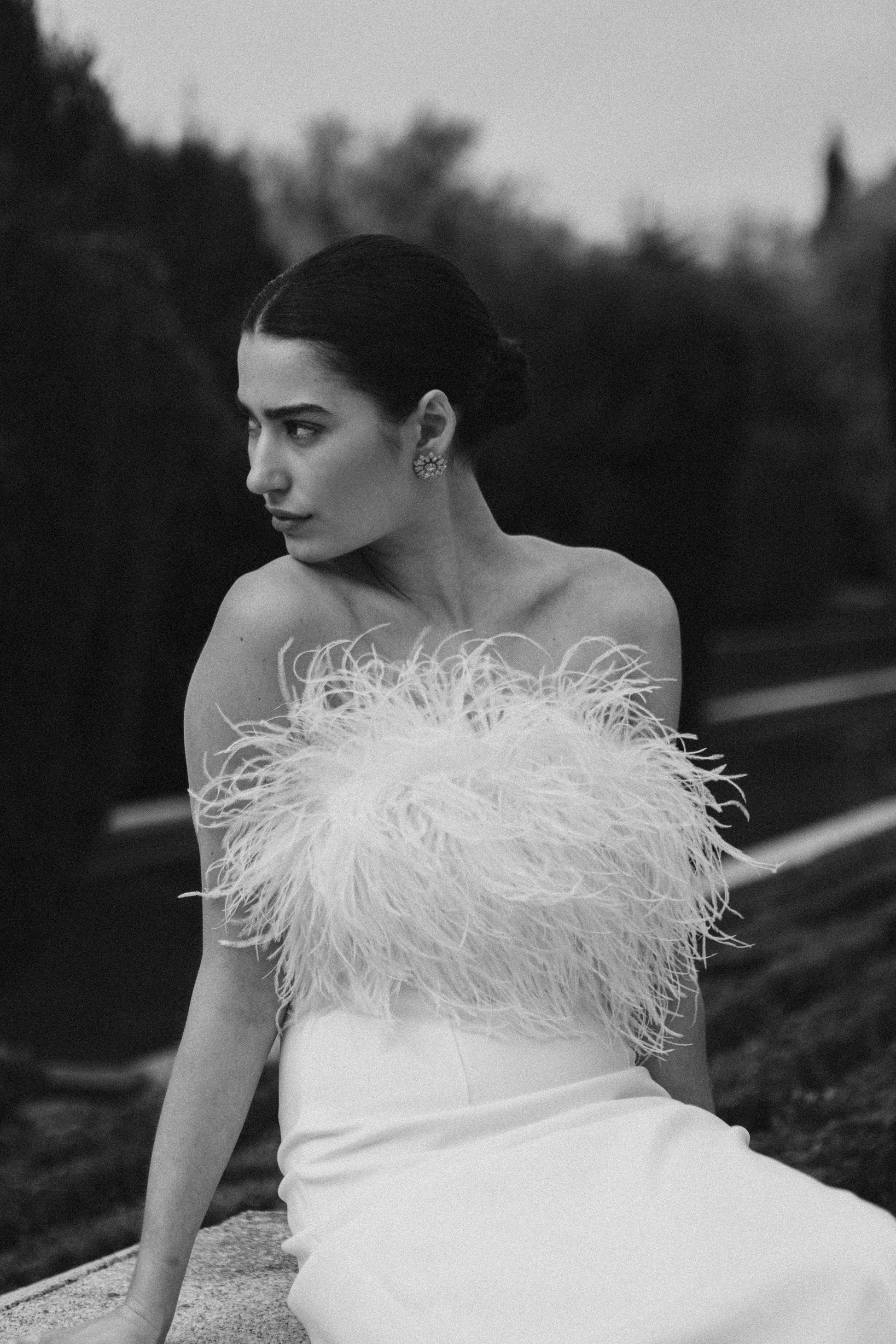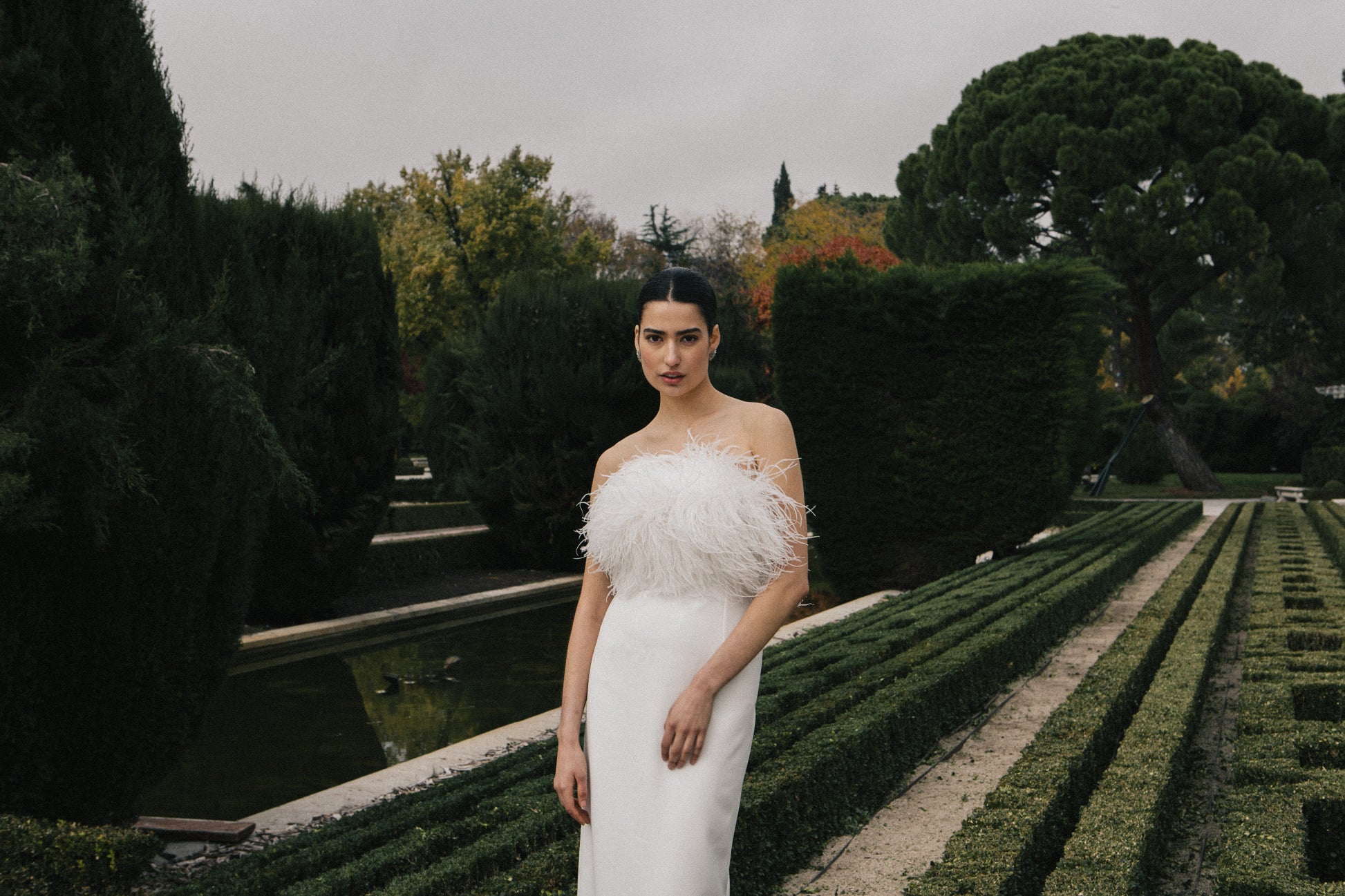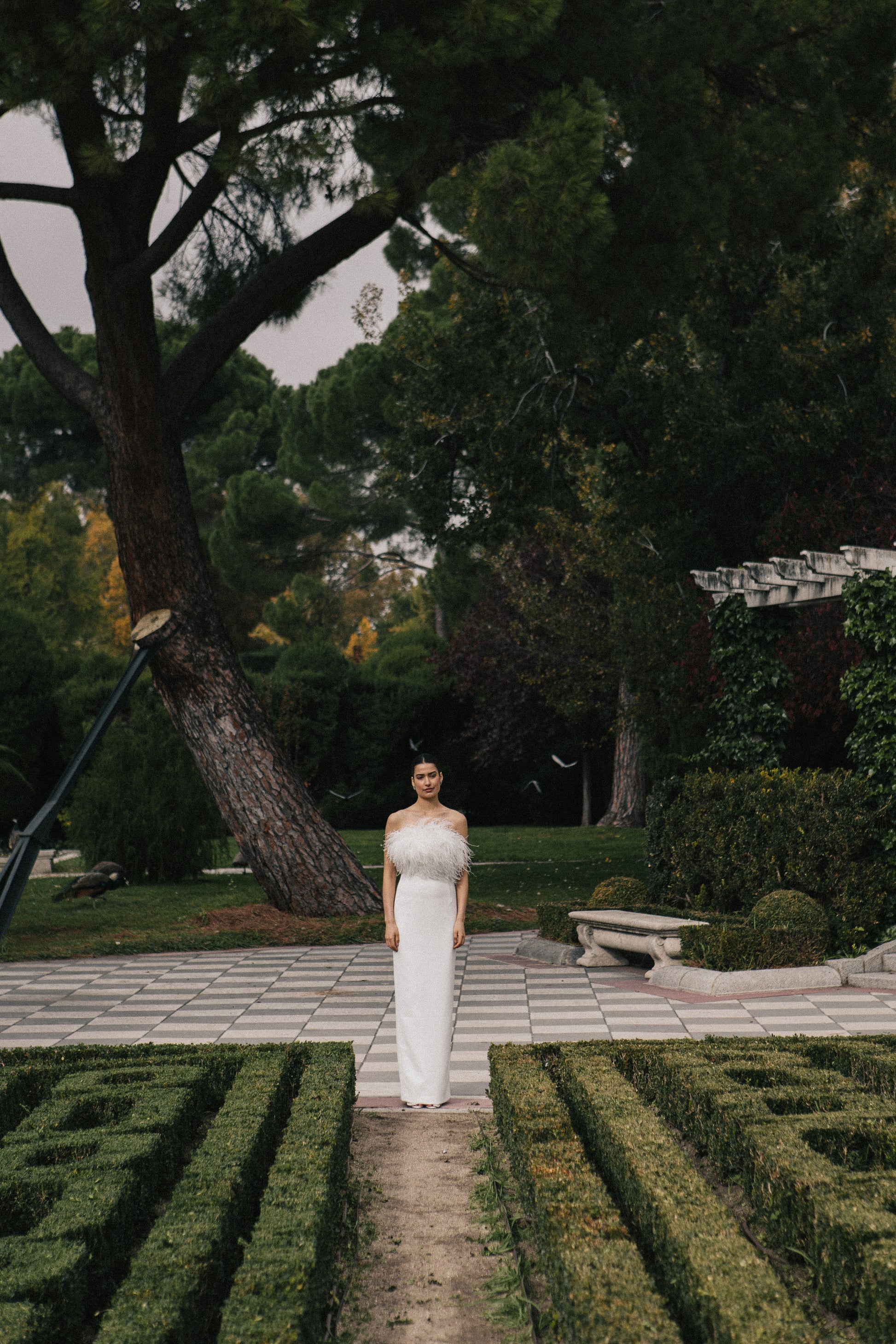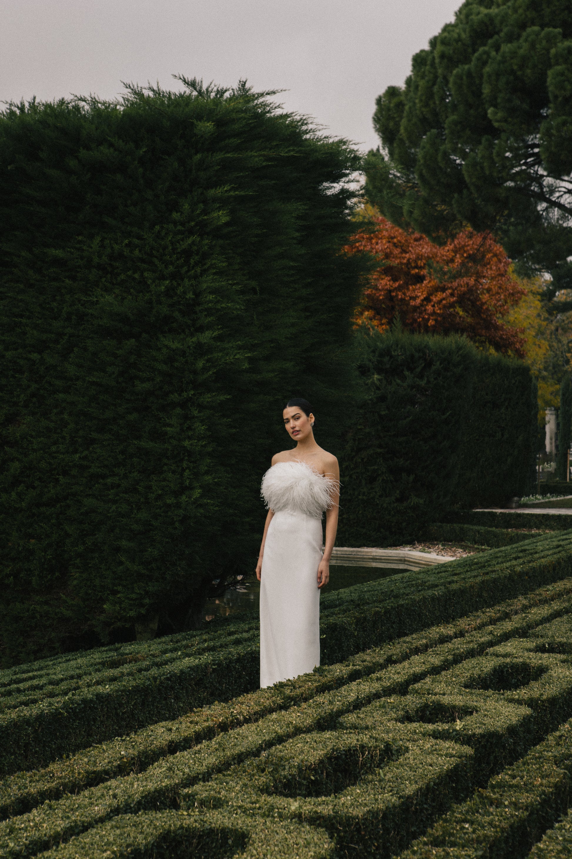 El modelo ISABEL WHITE está confeccionado en crepe color blanco, un tejido con gran caída y movimiento que cuenta con un tratamiento para evitar que las arrugas se marquen en exceso. Se trata de un diseño de corte largo palabra de honor con plumas de avestruz en la parte superior delantera.