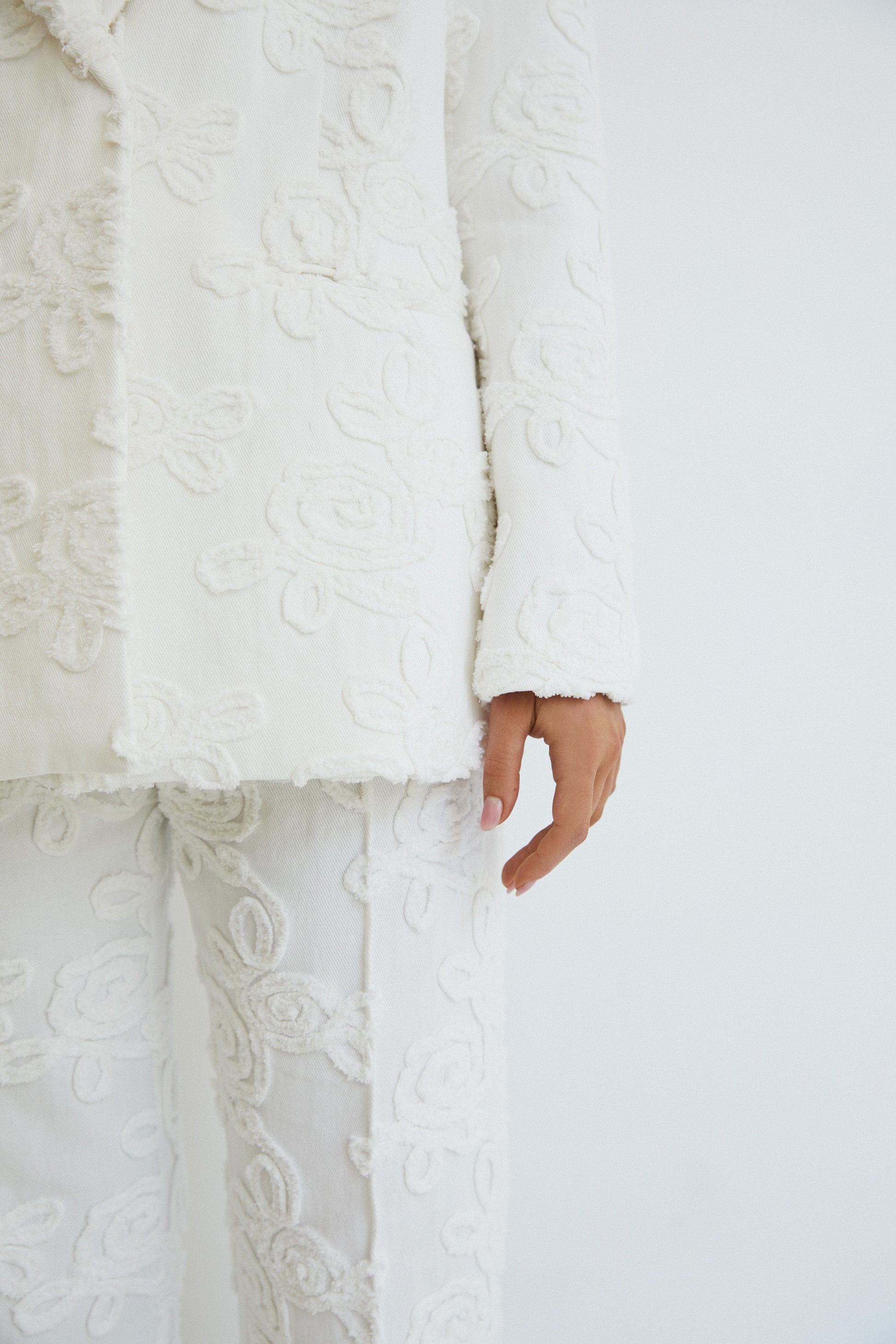 El modelo DARIA es pantalón capri tobillero, confeccionado en vaquero bordado en denim de algodón color blanco