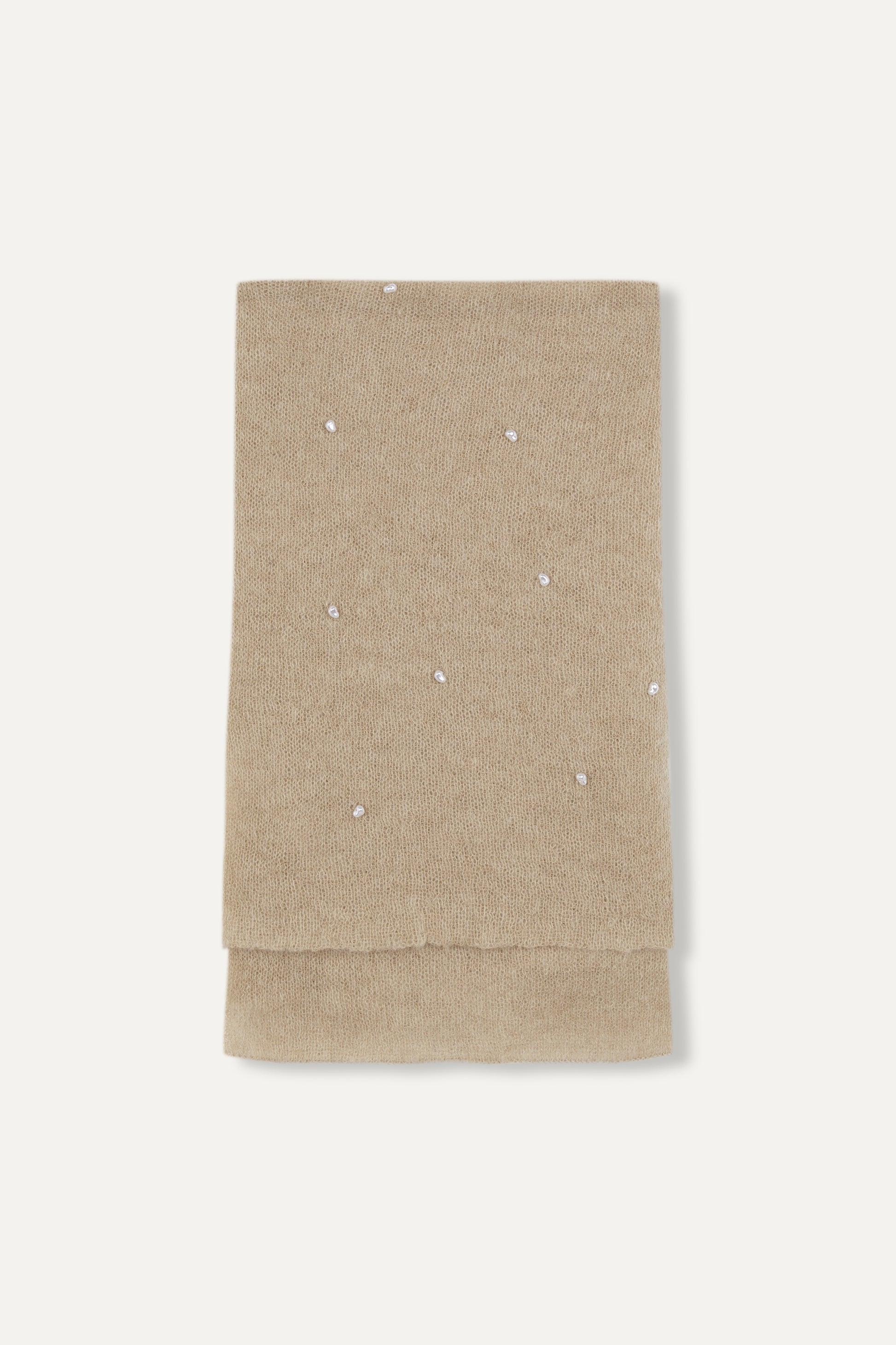 Bufanda en punto fino con mohair. Esta prenda tiene doble capa, creando un precioso efecto de transparencias. Bordado de perlitas salteadas en el lado principal.
