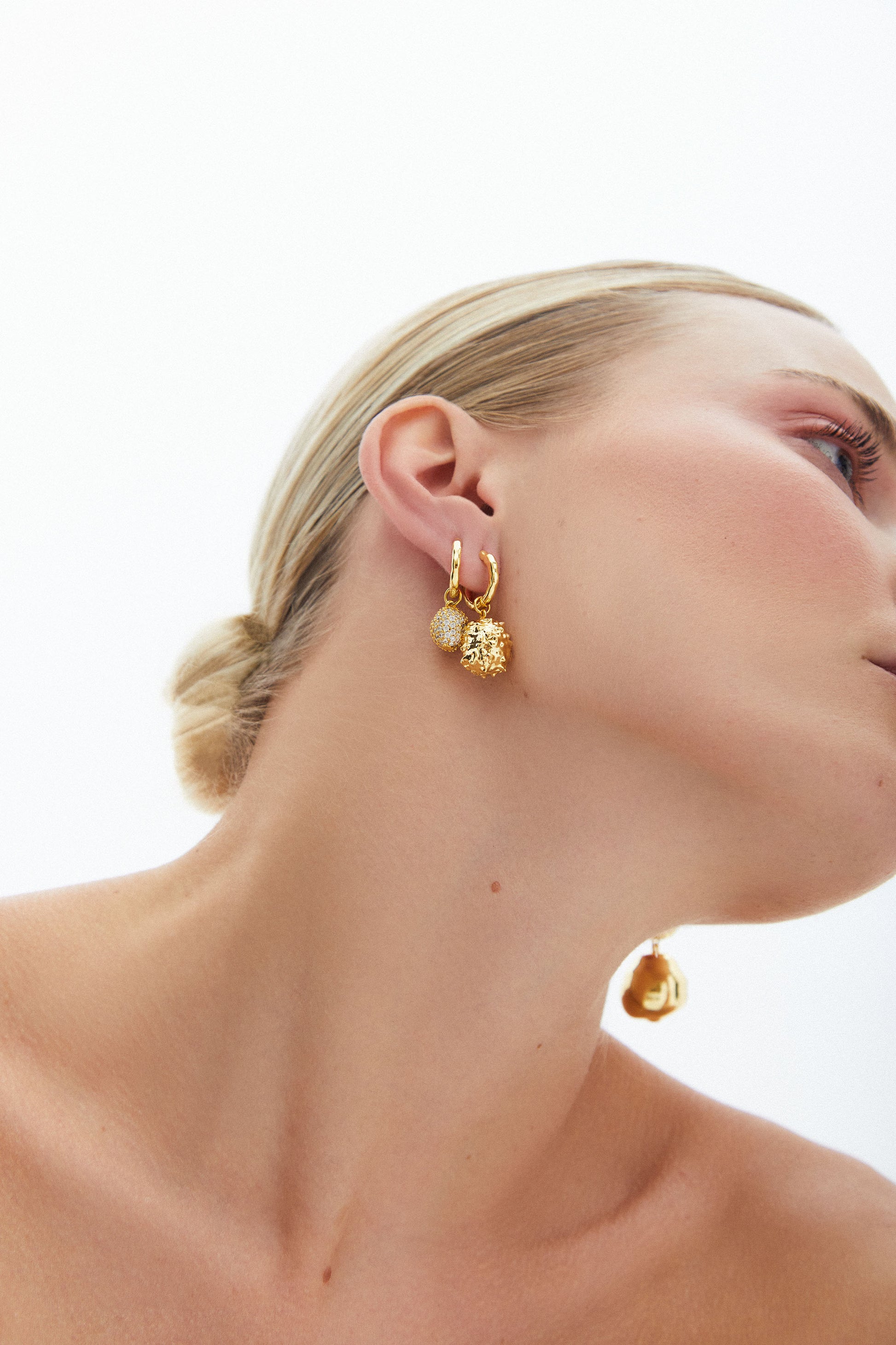 Aro individual orgánico con colgante en forma de perla irregular con acabado rugoso y baño de oro de 18K.
