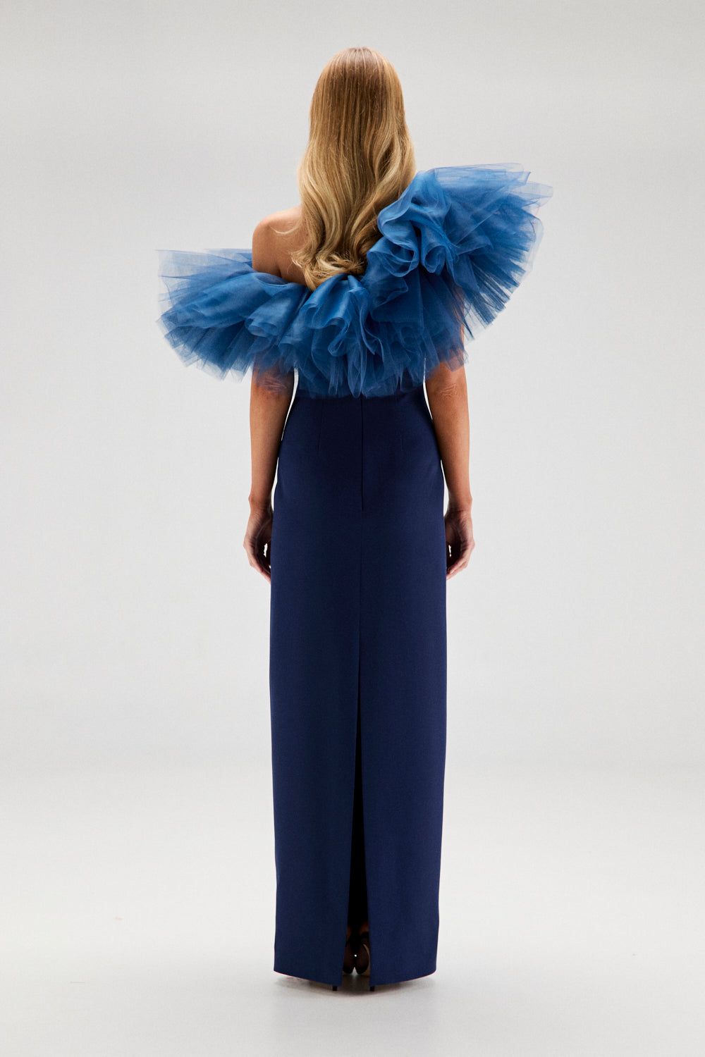 La zona del escote está trabajada con capas de tul que aportan volumen y movimiento, creando un efecto envolvente alrededor de los hombros.