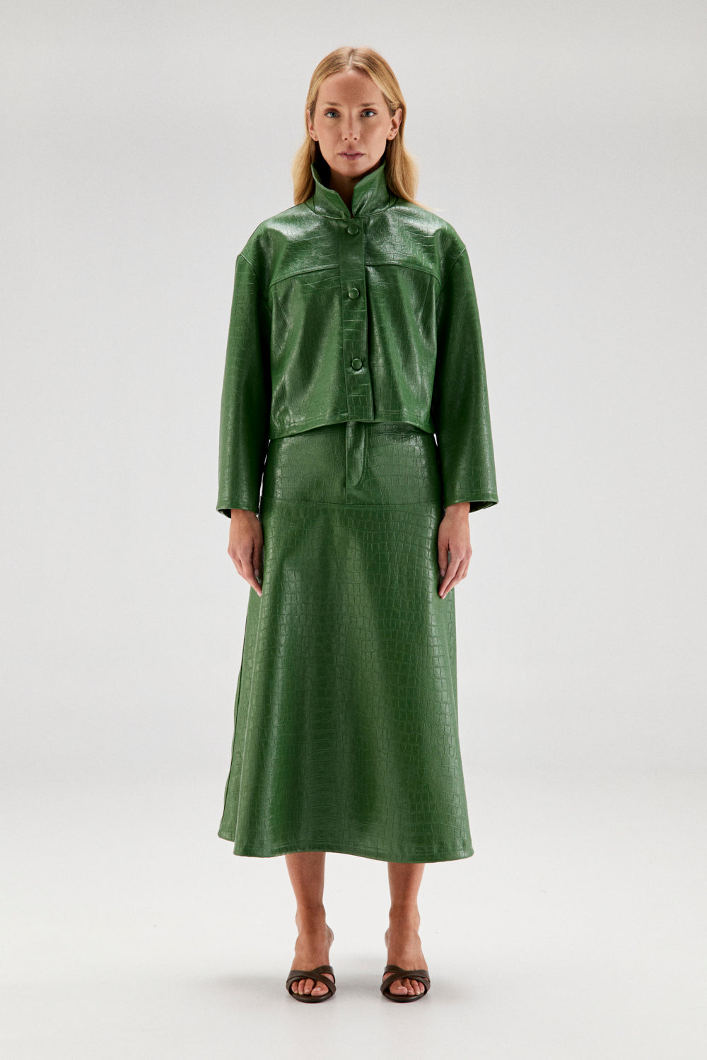 El modelo HAIZEA es una chaqueta cropped fit boxy en polipiel verde, textura pitón.