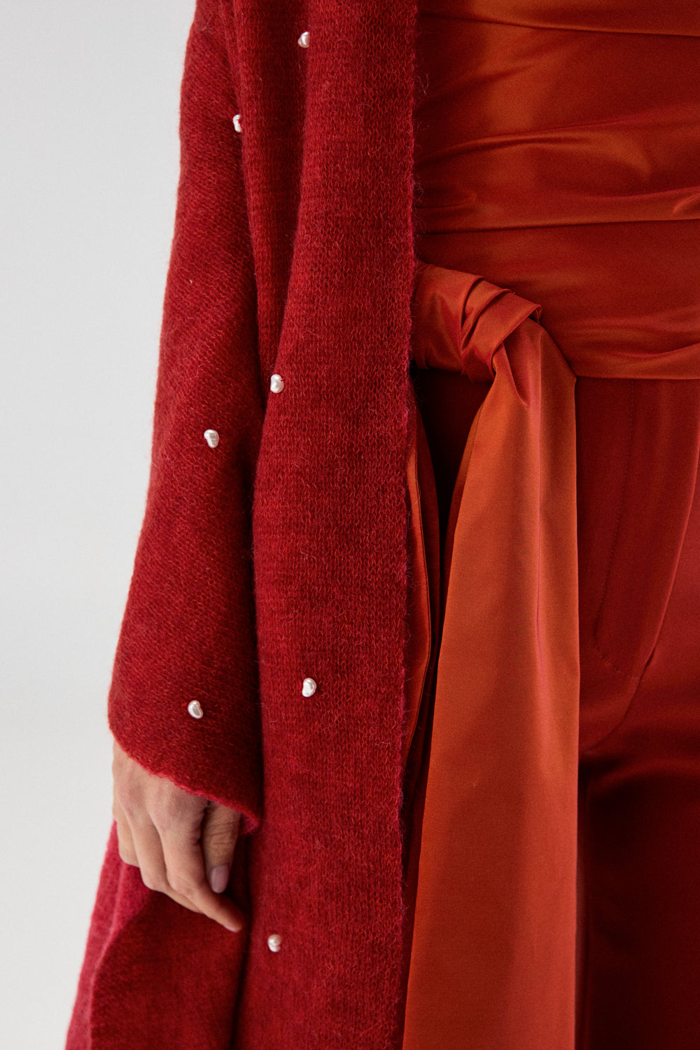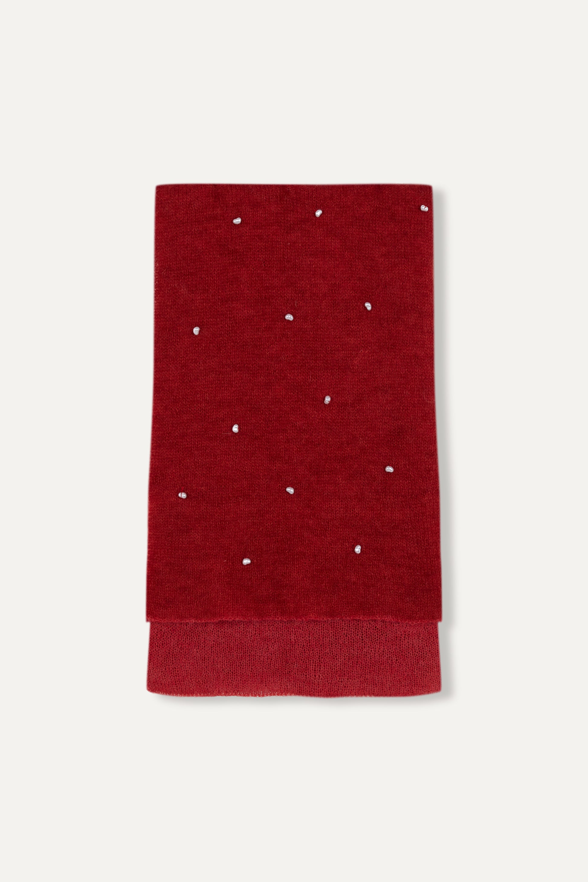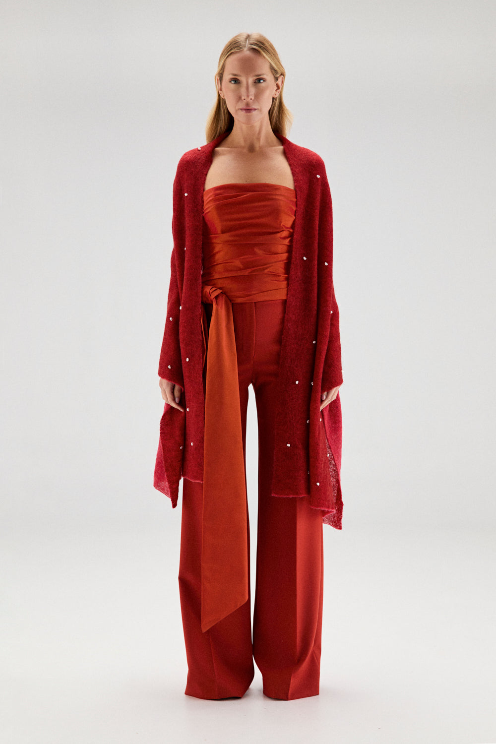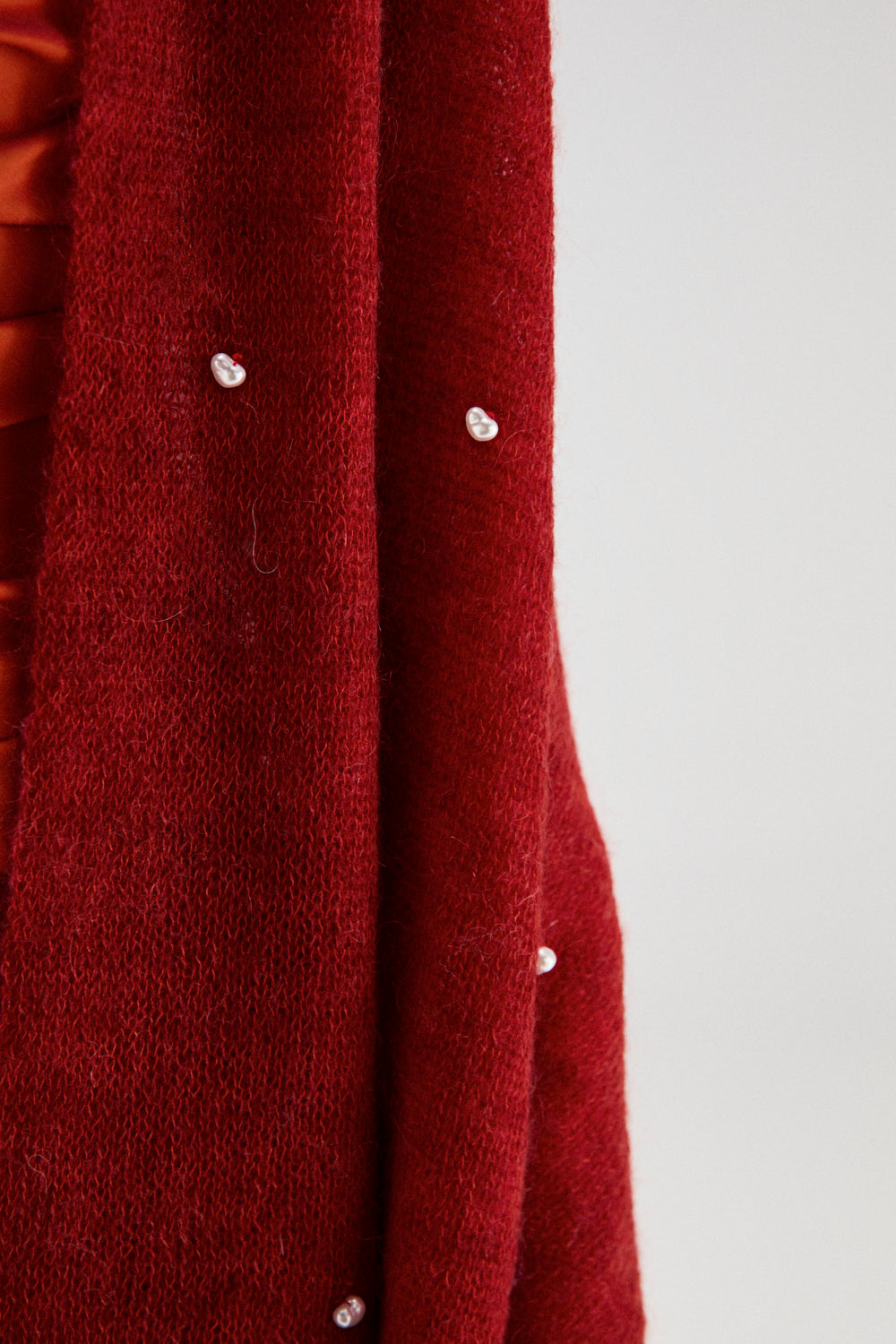 Bufanda en punto fino con mohair. Esta prenda tiene doble capa, creando un precioso efecto de transparencias ya que una capa tiene un tono naranja un poco más oscuro que otro. Bordado de perlitas salteadas en el lado principal.