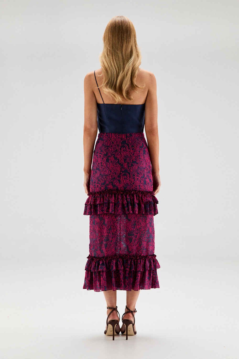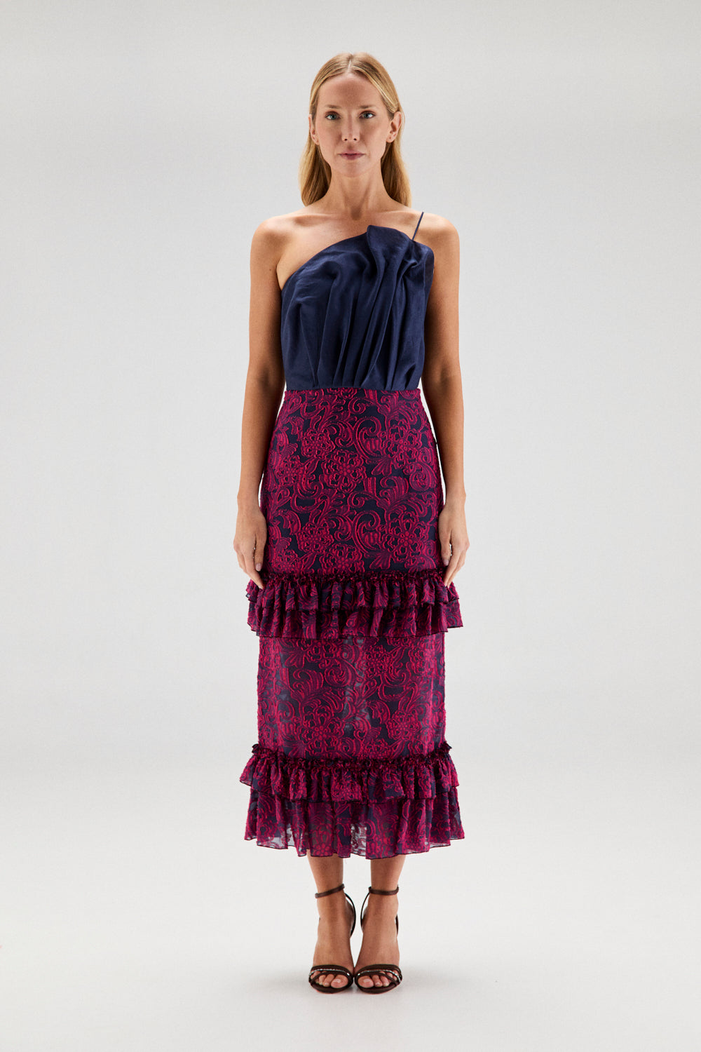 El modelo CAMILA es una falda midi confeccionada en jacquard de gasa bicolor en tonos rosa y azul marino. El tejido tiene dibujo integrado en relieve y una textura ligeramente estructurada, pero mantiene movimiento gracias a la base de gasa.