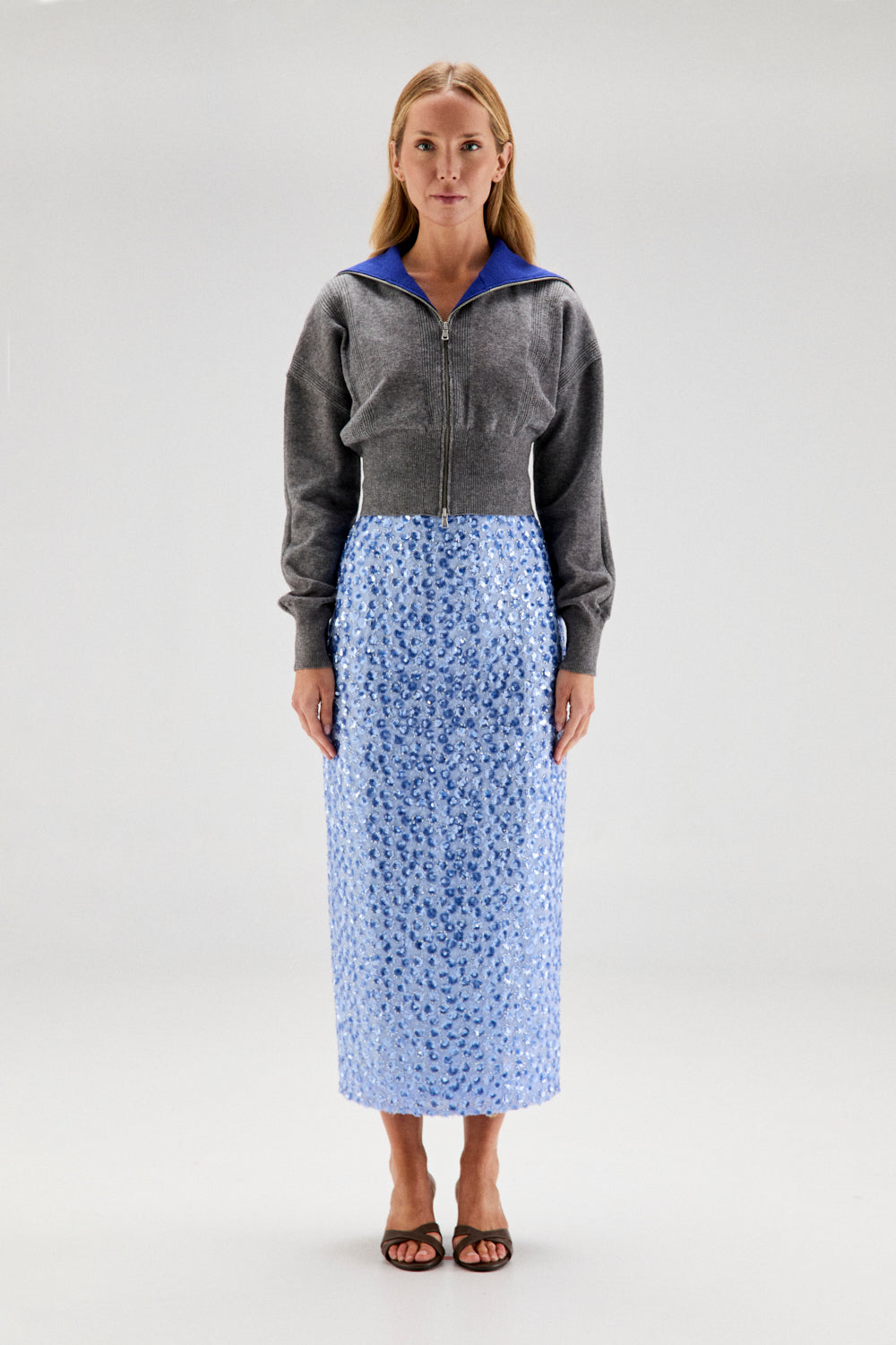 El modelo IVANA es una falda tubo largo midi, realizada en tejido de lentejuelas y abalorios con bordado de flores. En tonos azules y plata.