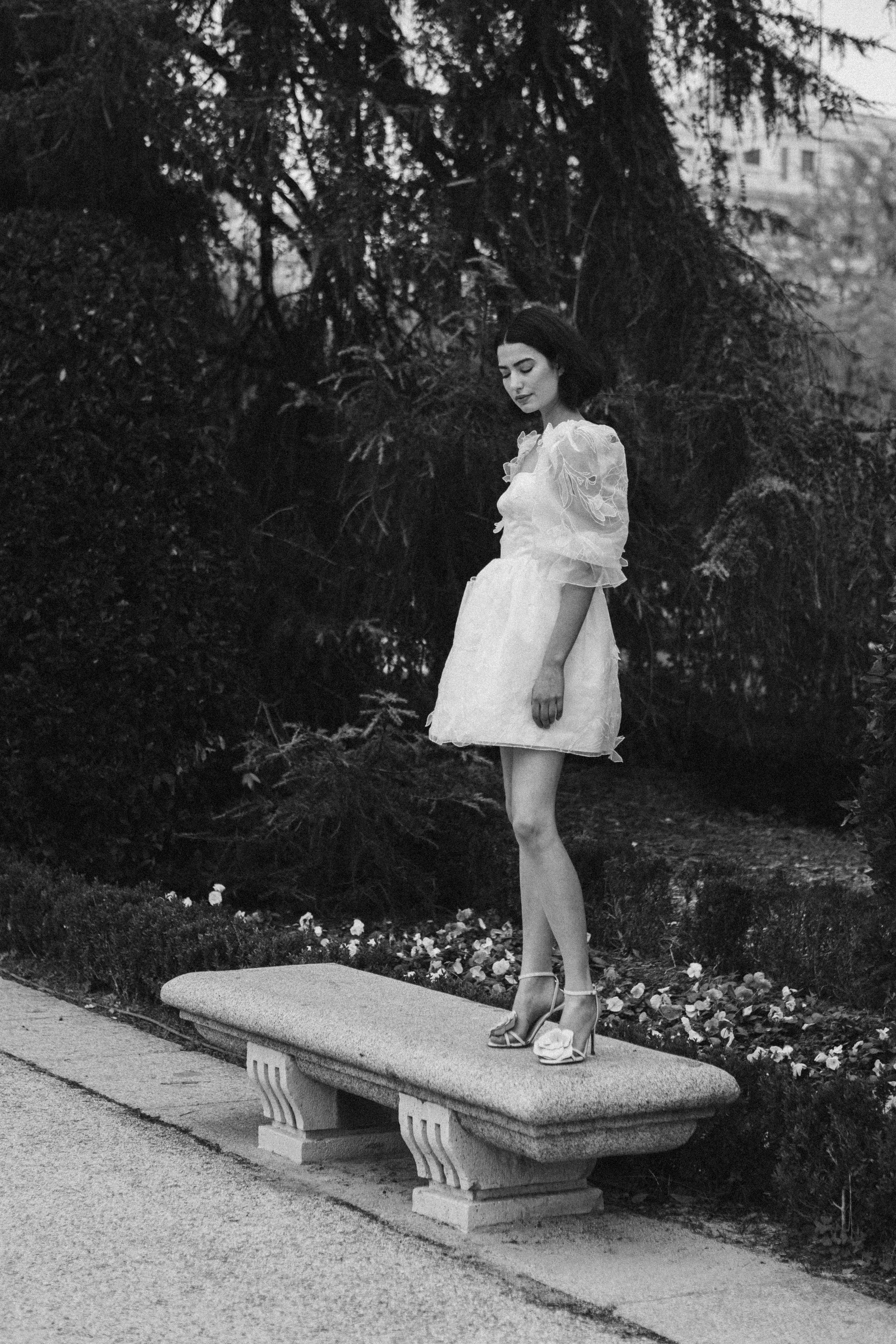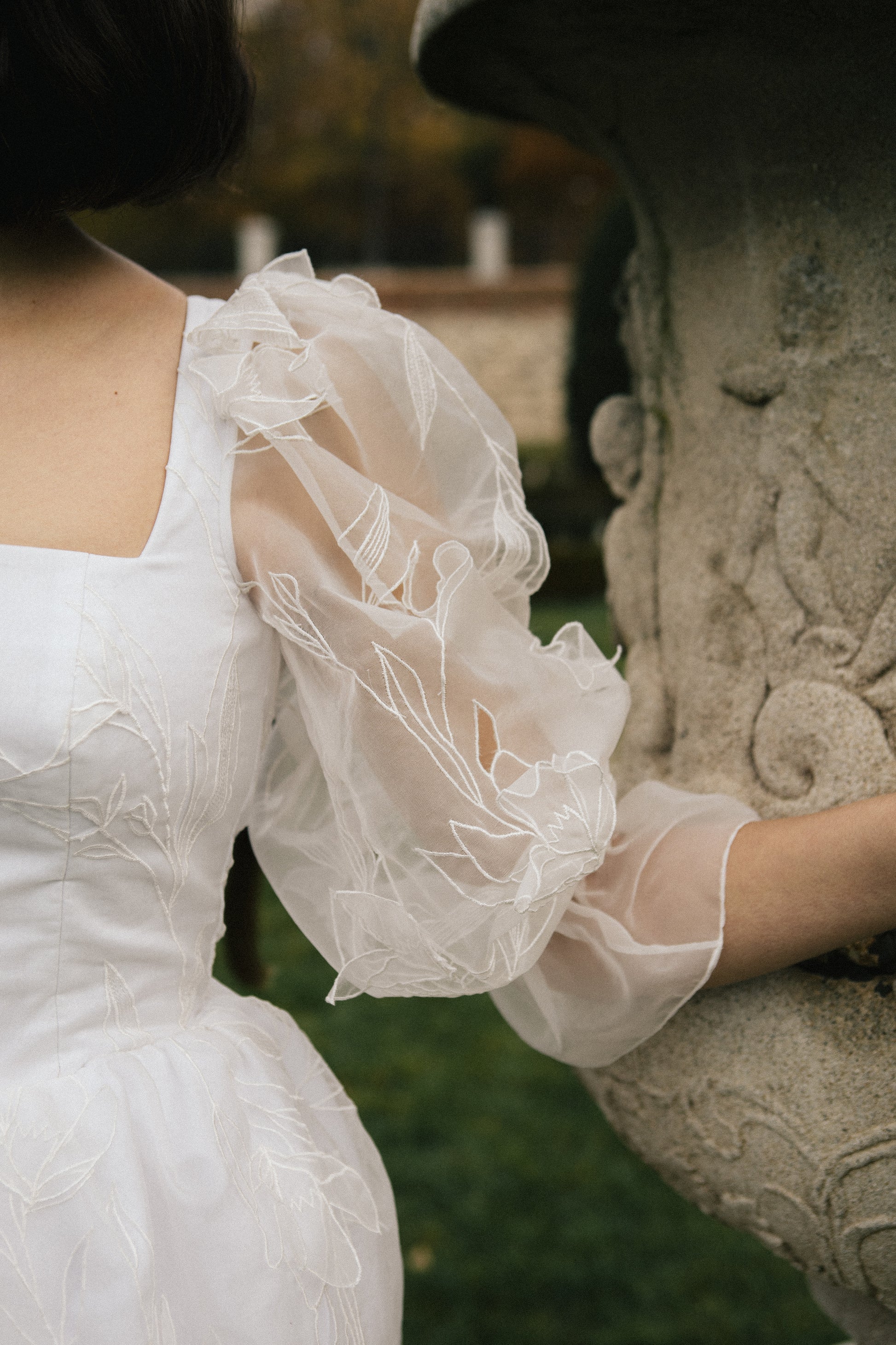 El modelo TEBA es un vestido mini confeccionado en organza bordada con relieve. Cuenta con grandes mangas abullonadas que se ajustan con una goma a la altura del codo. La falda abombonada cuenta con tul interior.