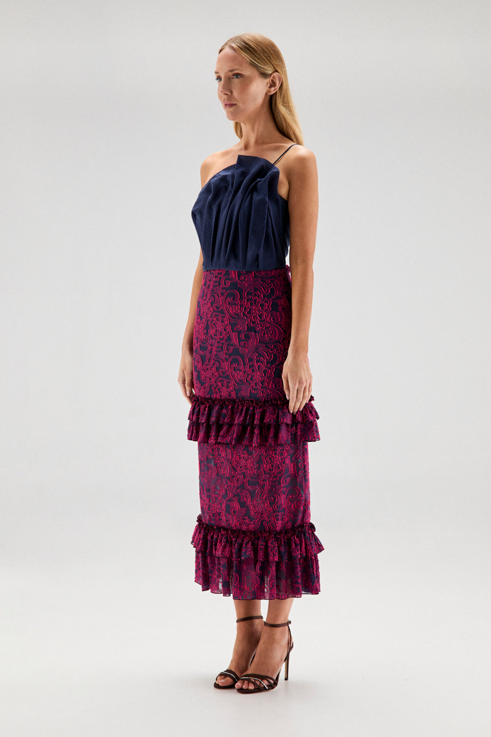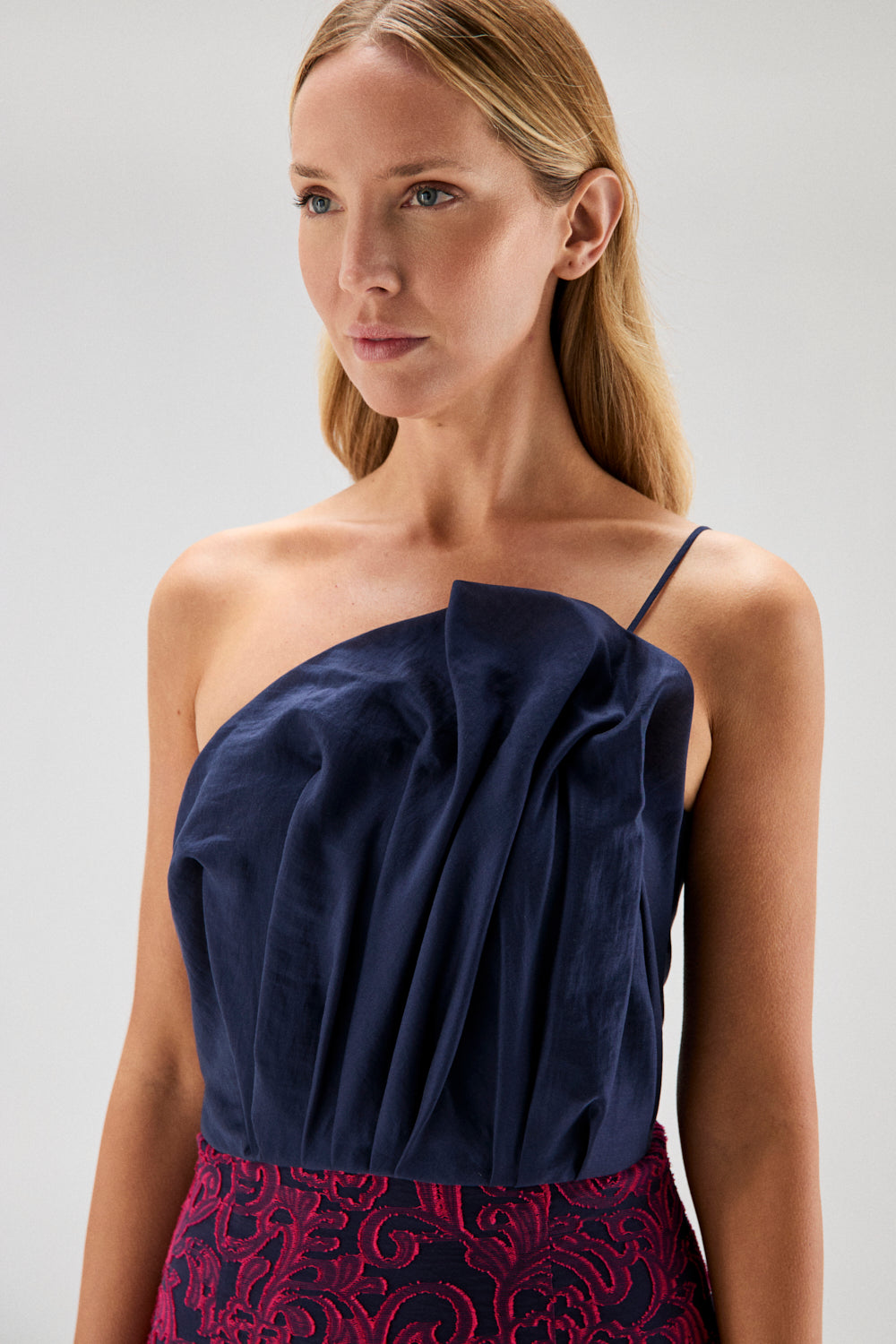 El escote es asimétrico, con un solo tirante fino que equilibra el diseño y ayuda a que la prenda se mantenga bien colocada. El patrón está trabajado para que el pliegue estilice el torso sin añadir rigidez.