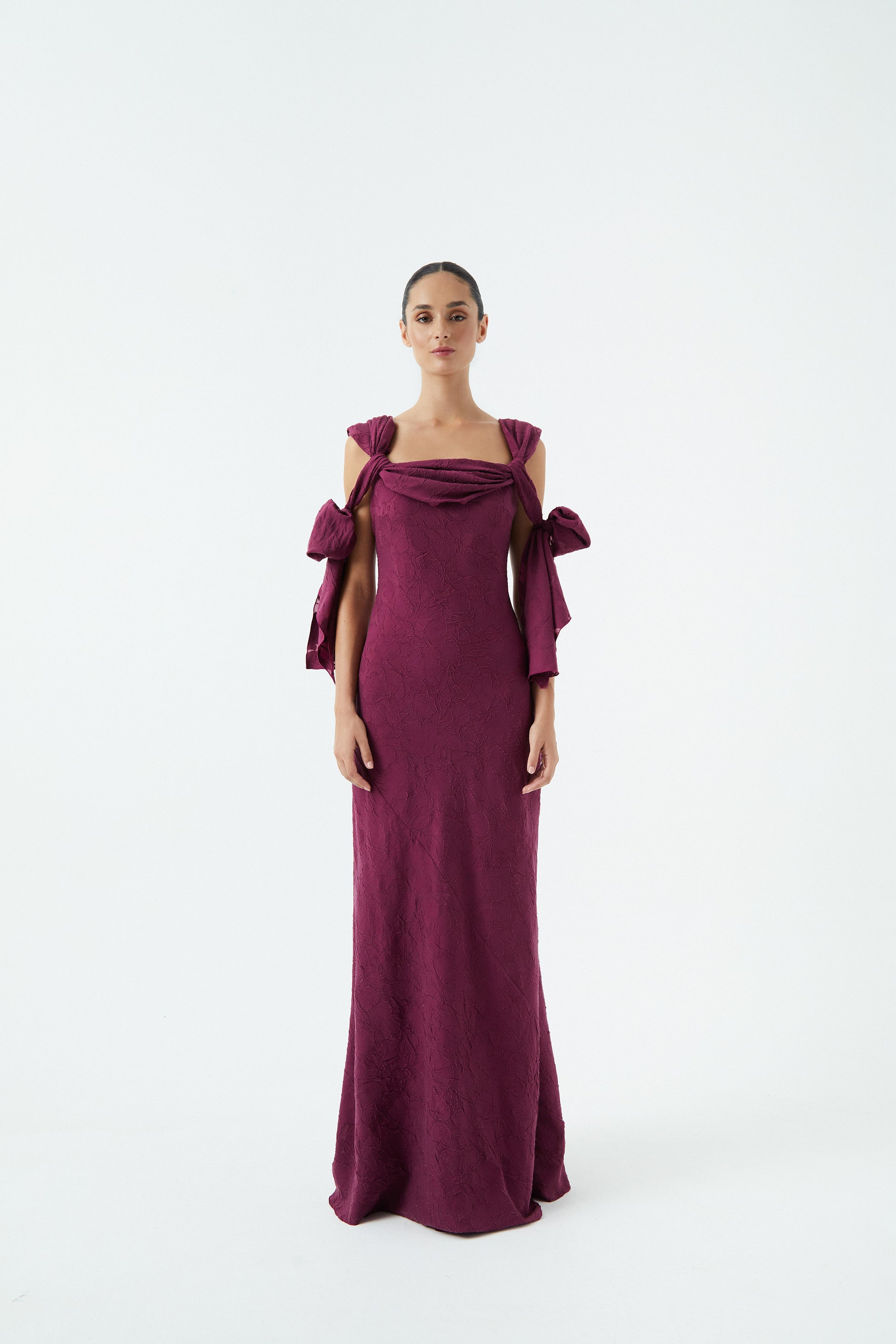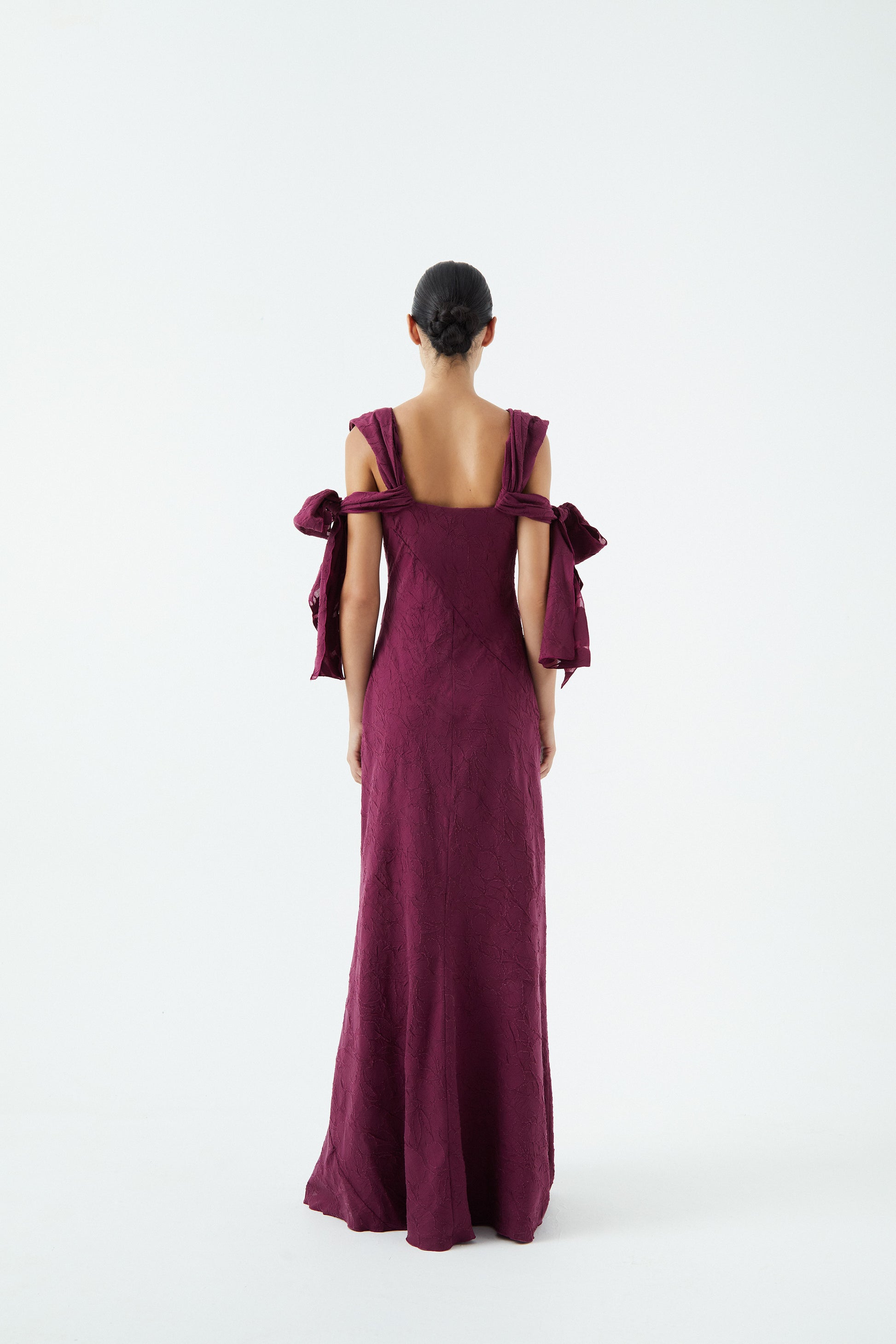 El elemento más destacado de este vestido es el escote: formado con el mismo tejido drapeado, continúa hasta la espalda formando los tirantes. Otro doble tirante anudado en lazo sale del escote y queda al caer sobre los brazos.