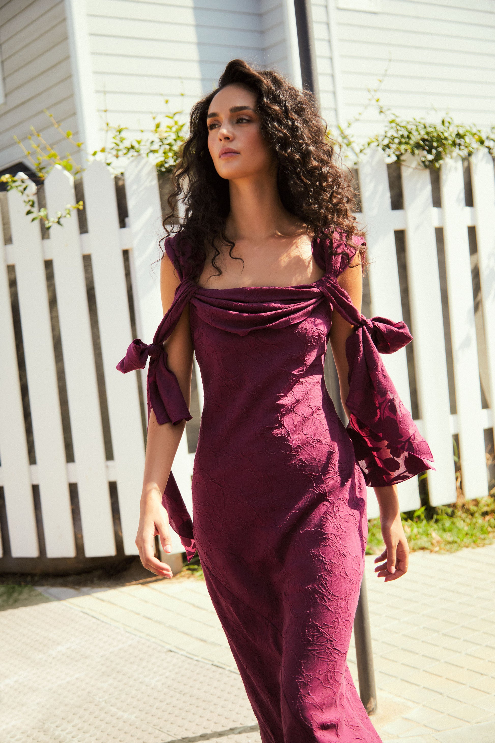 El modelo AINA se trata de un vestido largo cortado al bies, con un favorecedor ajuste al cuerpo.
