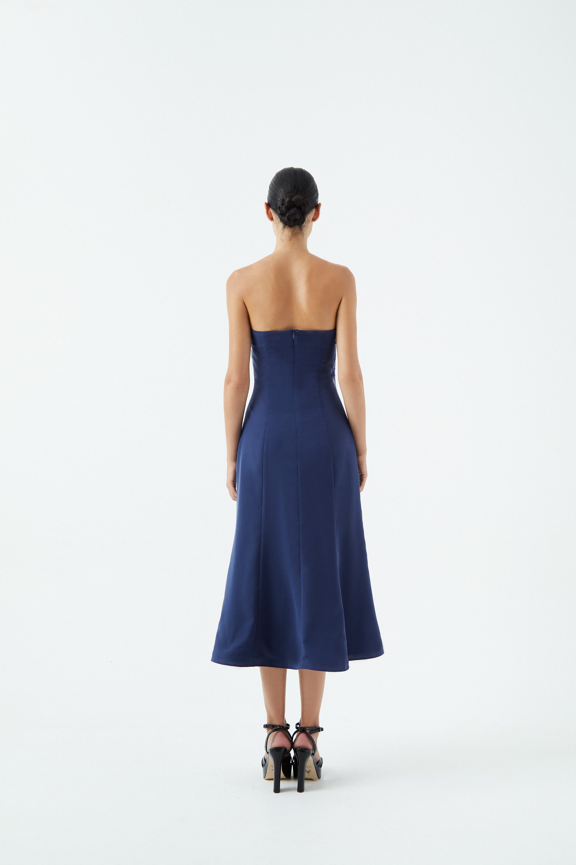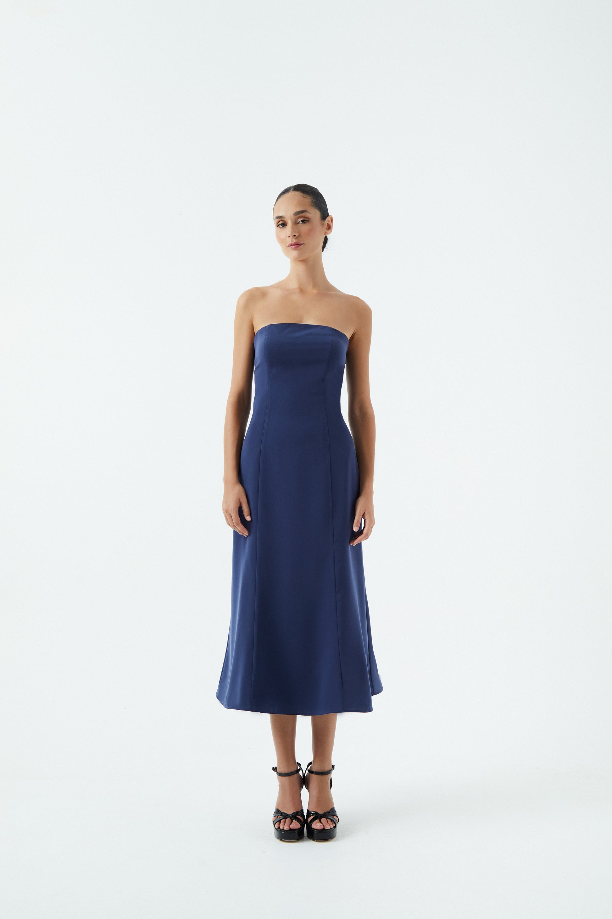 El modelo EDNA se trata de un vestido palabra de honor de largo midi, ajustado al cuerpo con pinzas de entalle.